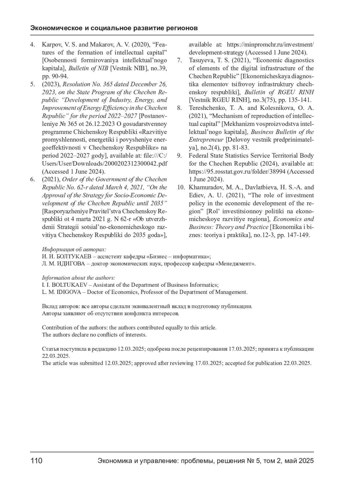 7. Тасуева Т. С. Экономическая диагностика элементов цифровой инфраструктуры Чеченской Республики // Вестник РГЭУ РИНХ. - 2021. - № 3 (75). - С. 135-141.