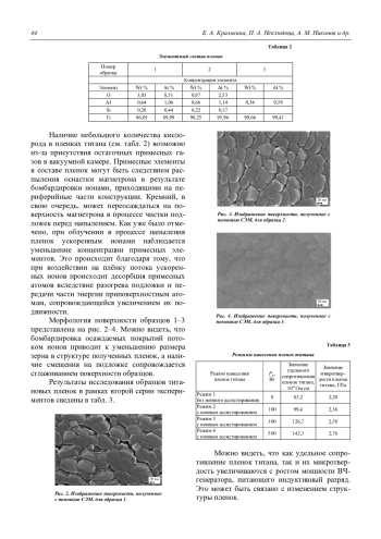 Удельное сопротивление и микротвердость пленок титана растут при увеличении потока ассистирующих ионов, величина которого изменялась независимо от скорости напыления покрытий. Изменение свойств титановых пленок может быть связано с изменением структуры пленок.