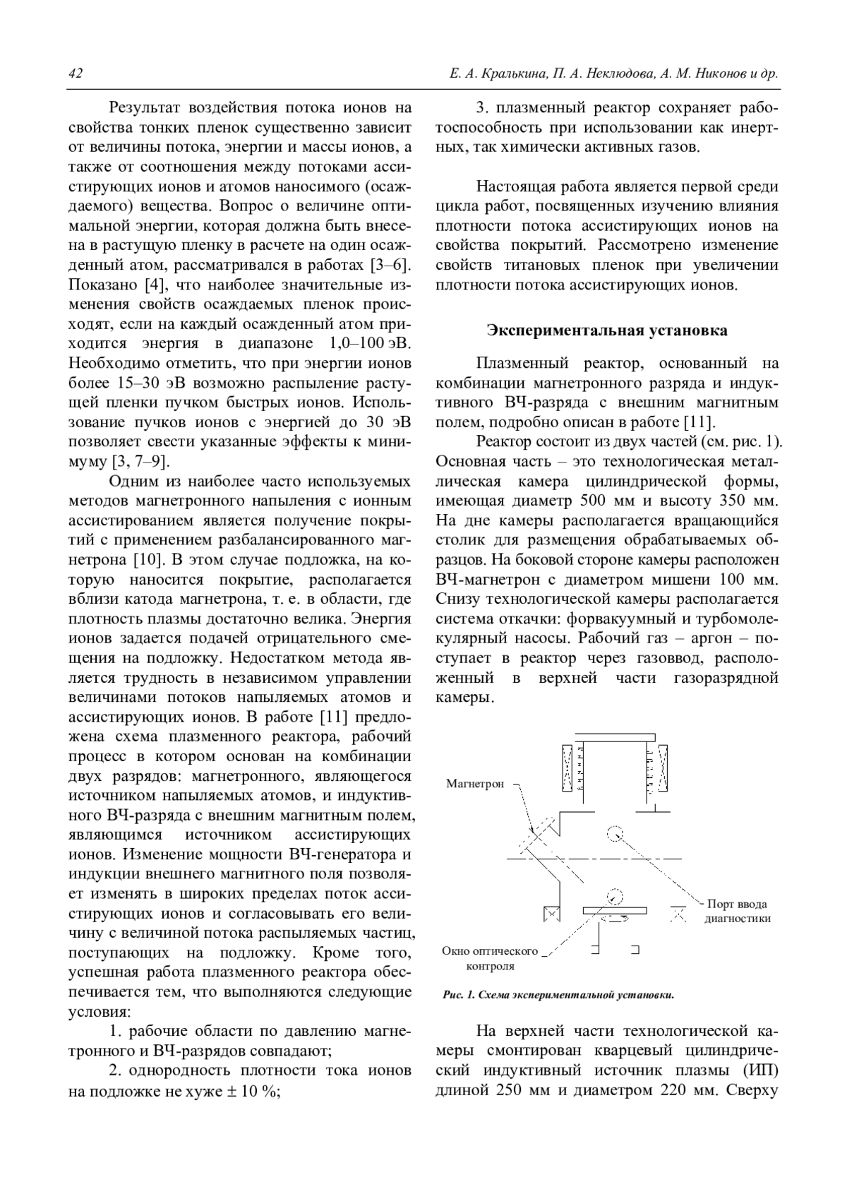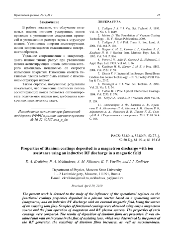 Кралькина Е. А., Неклюдова П. А., Никонов А. М., Вавилин К. В., Задириев И. И. Свойства титановых покрытий, полученных в магнетронном разряде при ионном ассис-тировании с помощью индуктивного ВЧ-разряда в магнитном поле 41