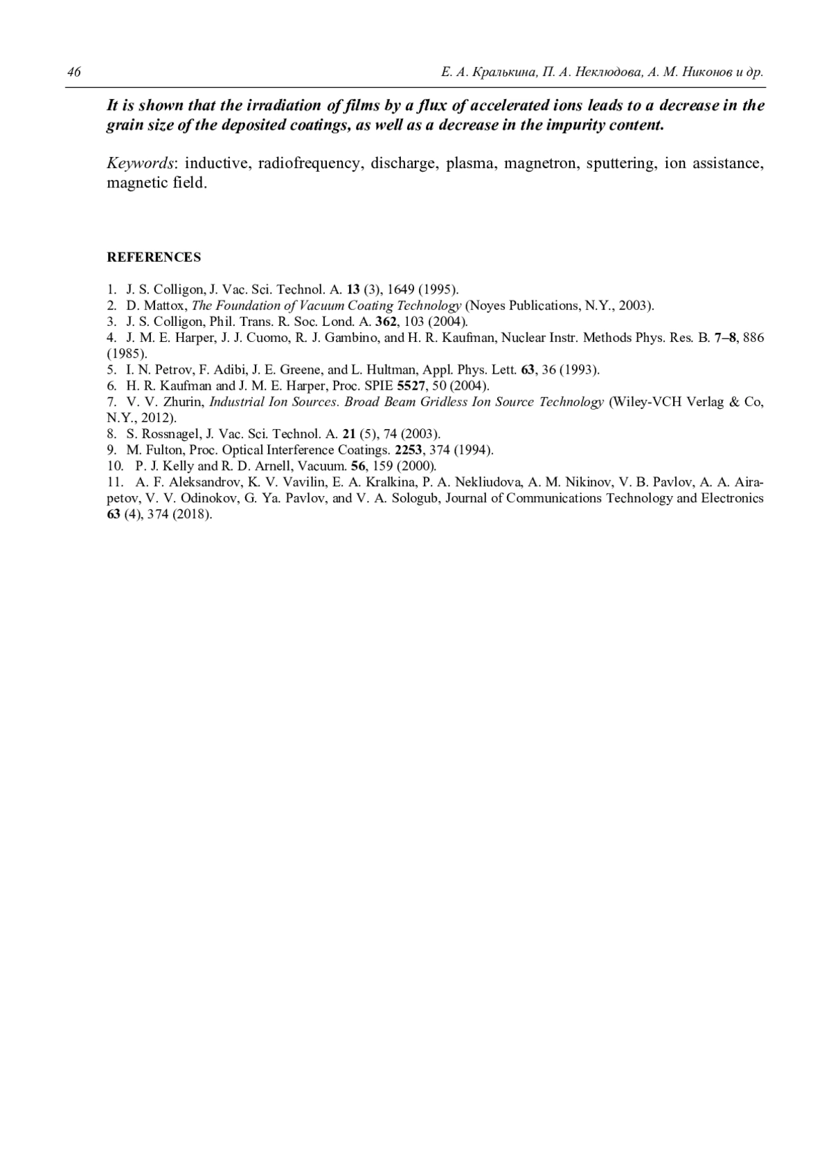 1. Colligon J. S. // J. Vac. Sci. Technol. A. 1995. Vol. 13. No. 3. P. 1649.