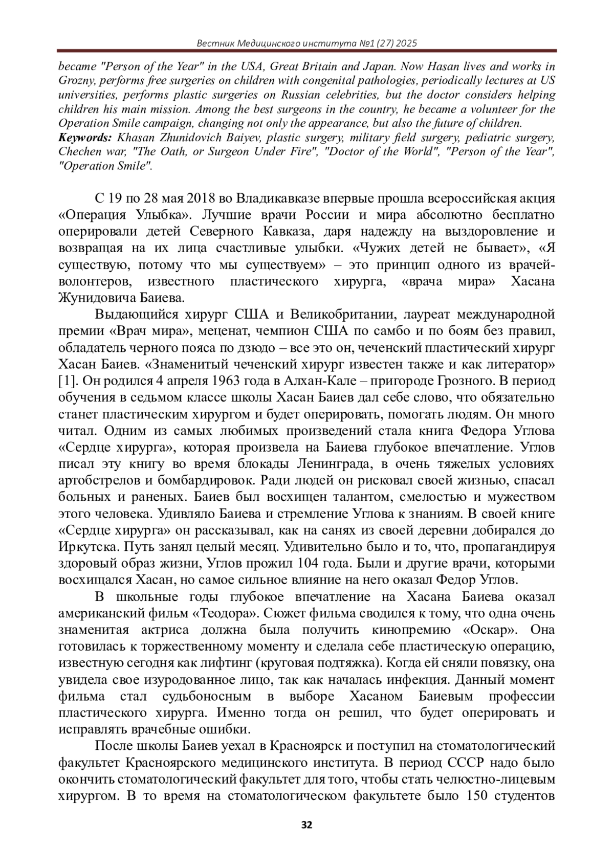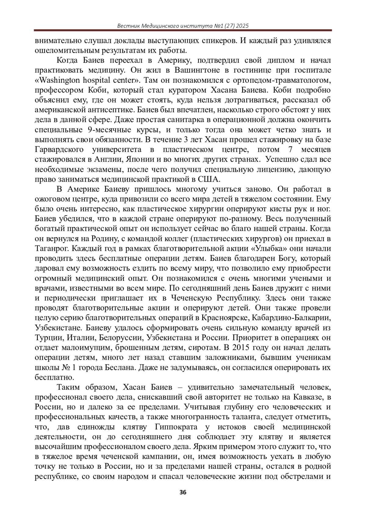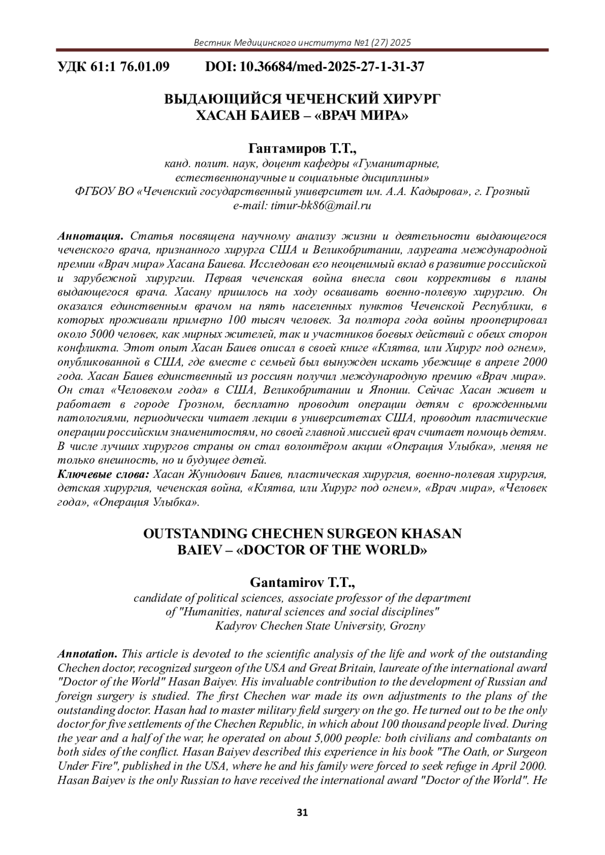 Статья посвящена научному анализу жизни и деятельности выдающегося чеченского врача, признанного хирурга США и Великобритании, лауреата международной премии «Врач мира» Хасана Баиева. Исследован его неоценимый вклад в развитие российской и зарубежной хирургии. Первая чеченская война внесла свои коррективы в планы выдающегося врача. Хасану пришлось на ходу осваивать военно-полевую хирургию. Он оказался единственным врачом на пять населенных пунктов Чеченской Республики, в которых проживали примерно 100 тысяч человек. За полтора года войны прооперировал около 5000 человек, как мирных жителей, так и участников боевых действий с обеих сторон конфликта. Этот опыт Хасан Баиев описал в своей книге «Клятва, или Хирург под огнем», опубликованной в США, где вместе с семьей был вынужден искать убежище в апреле 2000 года. Хасан Баиев единственный из россиян получил международную премию «Врач мира». Он стал «Человеком года» в США, Великобритании и Японии. Сейчас Хасан живет и работает в городе Грозном, бесплатно проводит операции детям с врожденными патологиями, периодически читает лекции в университетах США, проводит пластические операции российским знаменитостям, но своей главной миссией врач считает помощь детям. В числе лучших хирургов страны он стал волонтёром акции «Операция Улыбка», меняя не только внешность, но и будущее детей.