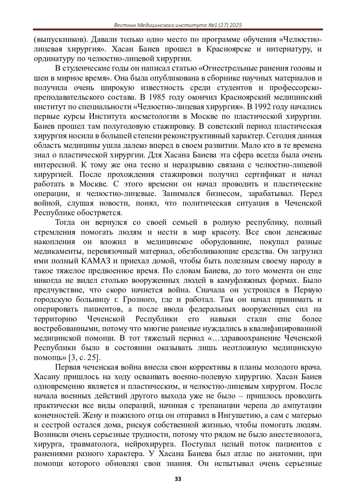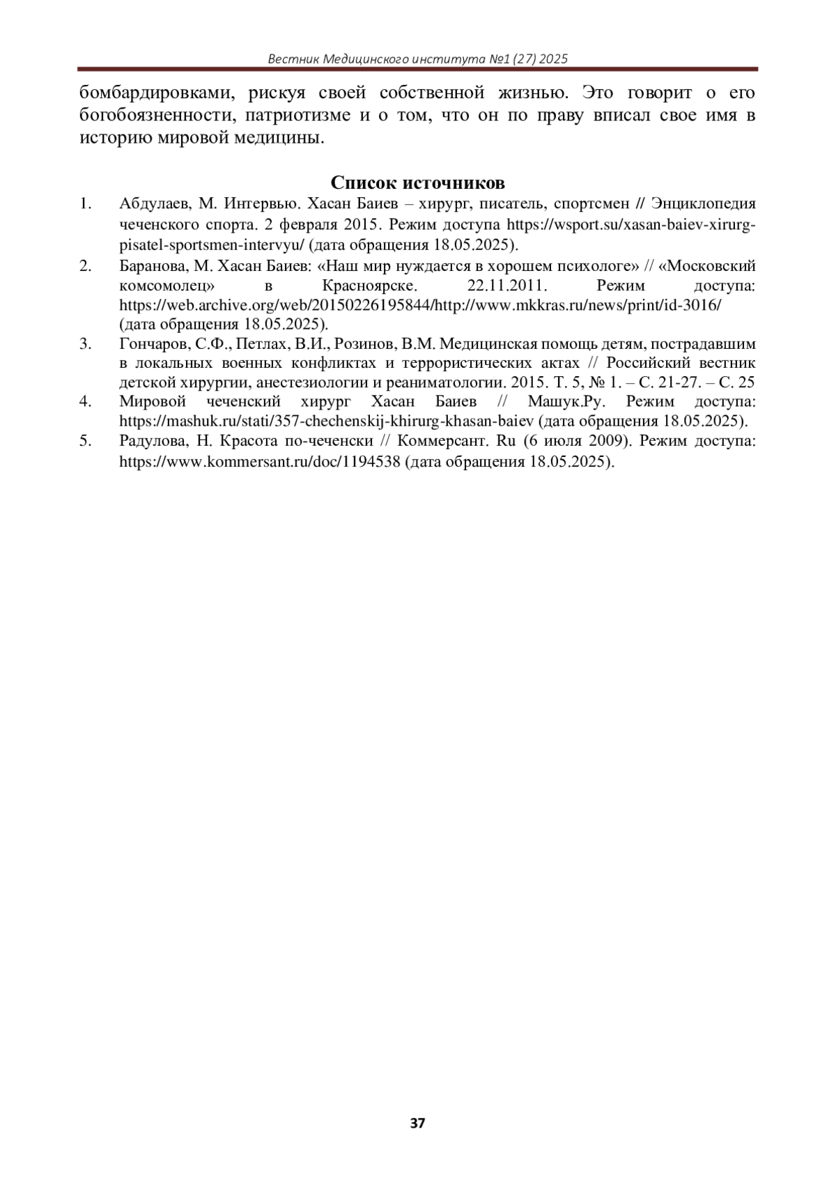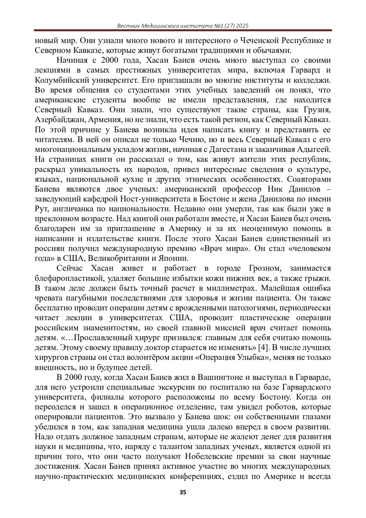 Статья посвящена научному анализу жизни и деятельности выдающегося чеченского врача, признанного хирурга США и Великобритании, лауреата международной премии «Врач мира» Хасана Баиева. Исследован его неоценимый вклад в развитие российской и зарубежной хирургии. Первая чеченская война внесла свои коррективы в планы выдающегося врача. Хасану пришлось на ходу осваивать военно-полевую хирургию. Он оказался единственным врачом на пять населенных пунктов Чеченской Республики, в которых проживали примерно 100 тысяч человек. За полтора года войны прооперировал около 5000 человек, как мирных жителей, так и участников боевых действий с обеих сторон конфликта. Этот опыт Хасан Баиев описал в своей книге «Клятва, или Хирург под огнем», опубликованной в США, где вместе с семьей был вынужден искать убежище в апреле 2000 года. Хасан Баиев единственный из россиян получил международную премию «Врач мира». Он стал «Человеком года» в США, Великобритании и Японии. Сейчас Хасан живет и работает в городе Грозном, бесплатно проводит операции детям с врожденными патологиями, периодически читает лекции в университетах США, проводит пластические операции российским знаменитостям, но своей главной миссией врач считает помощь детям. В числе лучших хирургов страны он стал волонтёром акции «Операция Улыбка», меняя не только внешность, но и будущее детей.