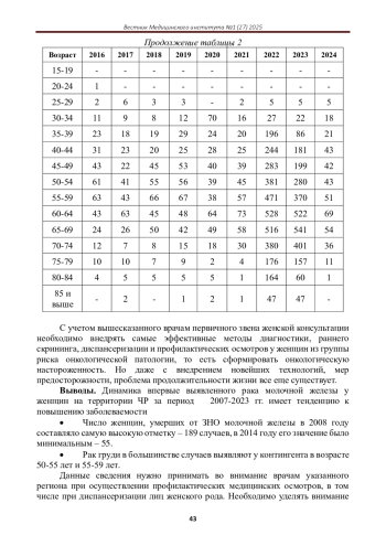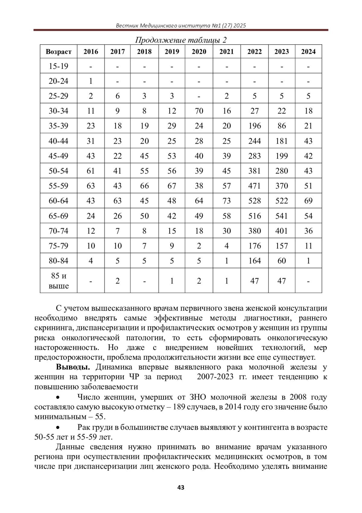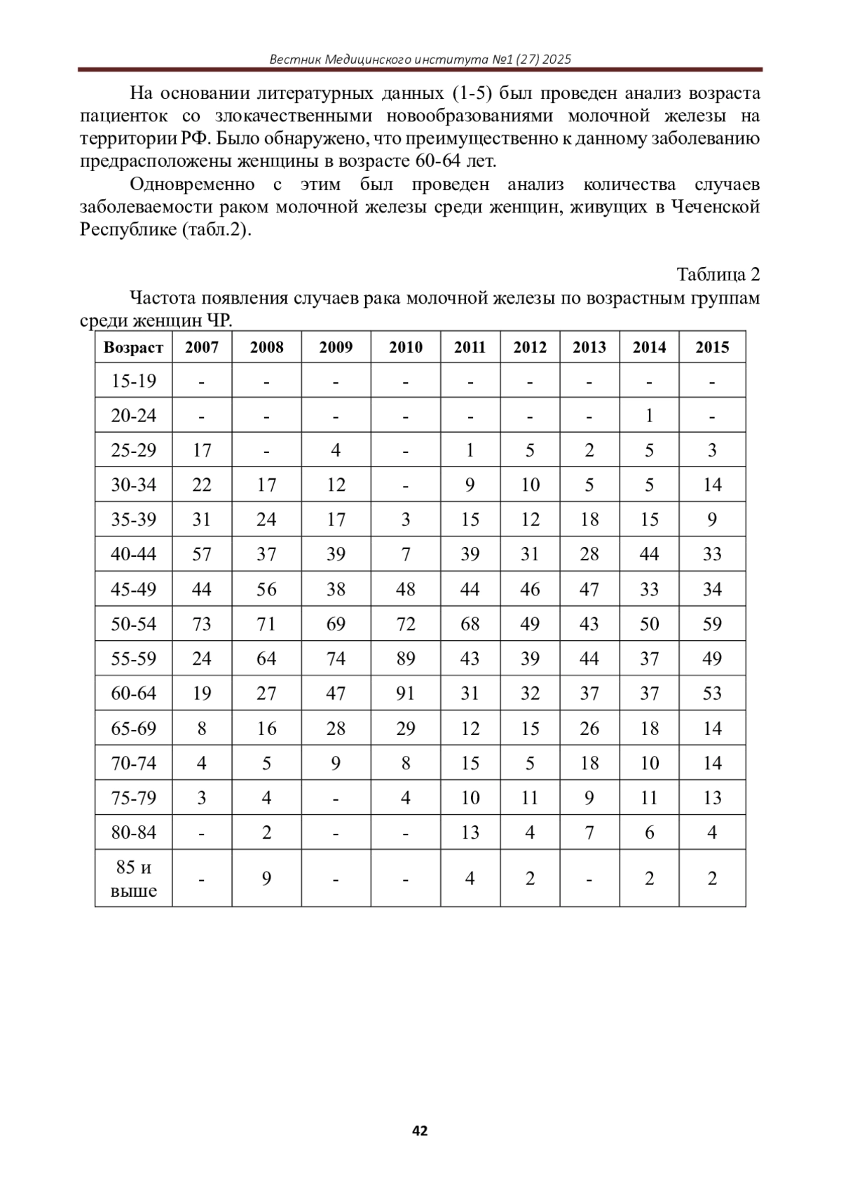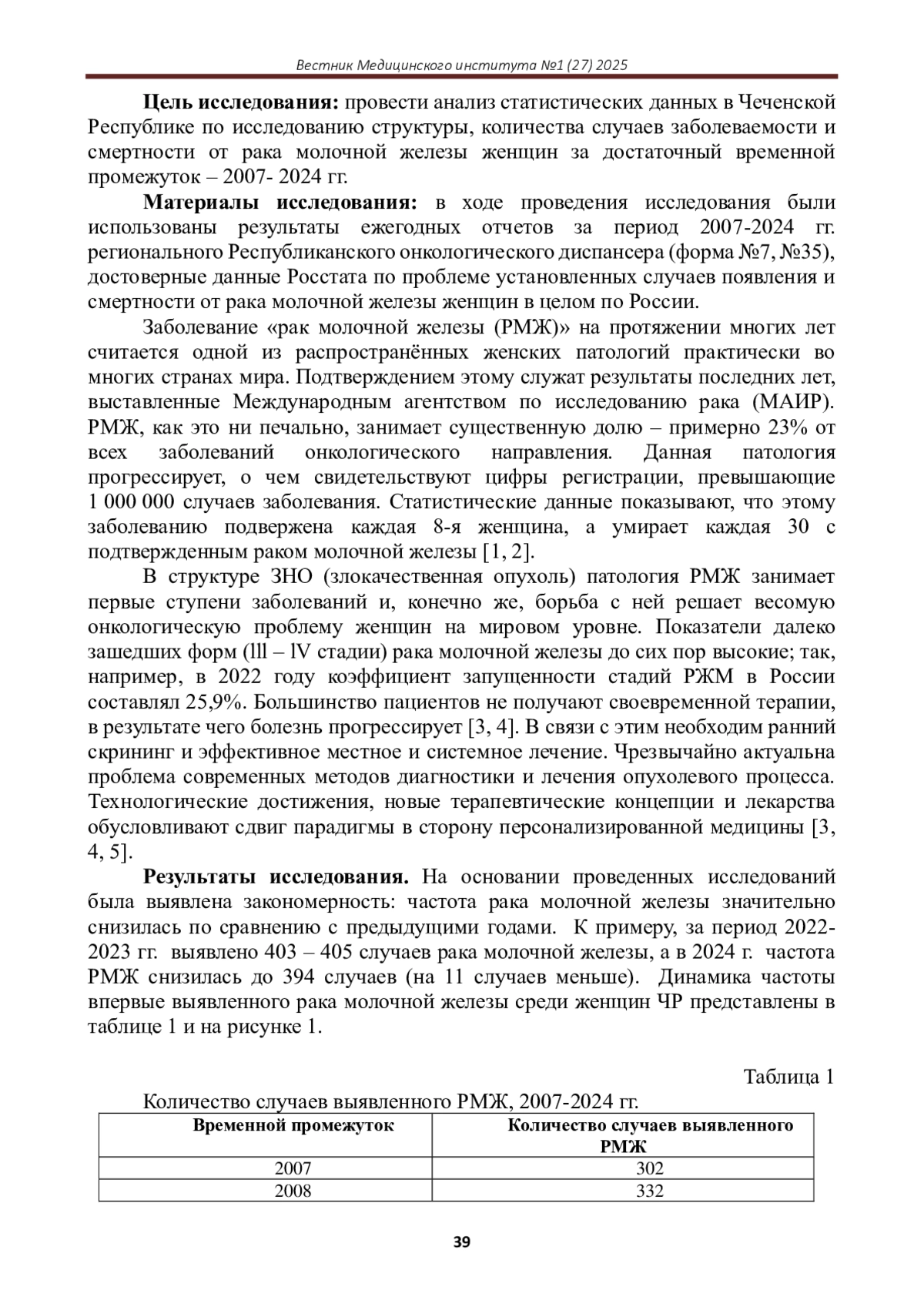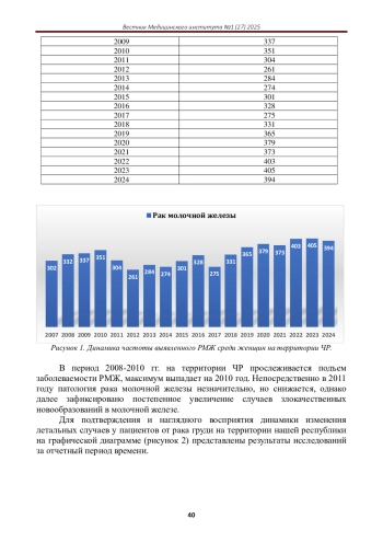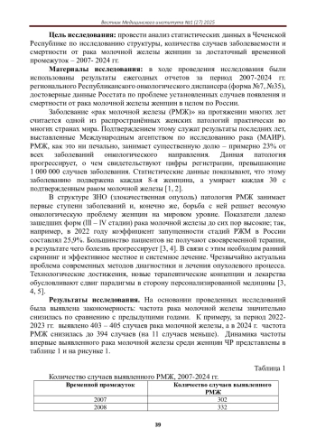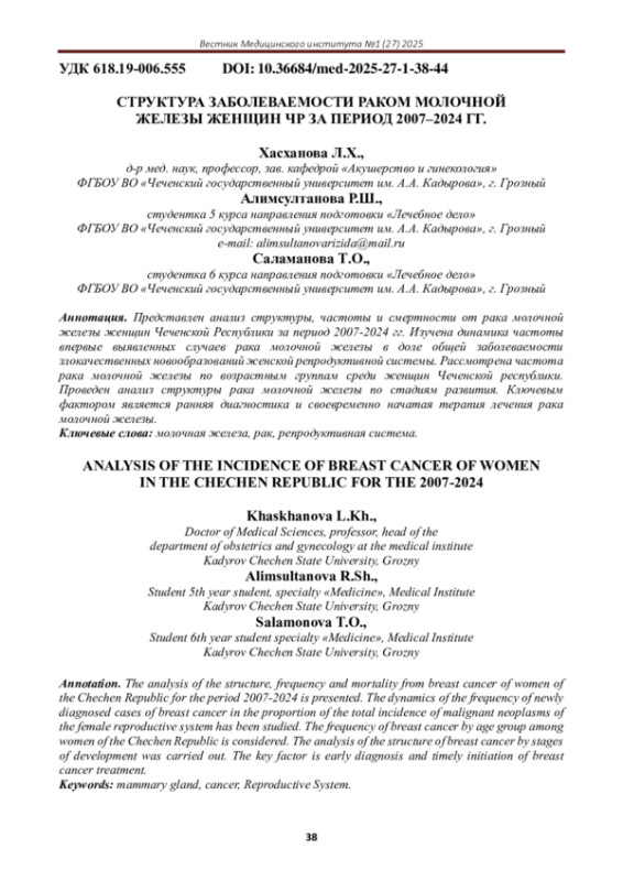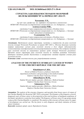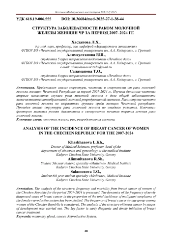 Представлен анализ структуры, частоты и смертности от рака молочной железы женщин Чеченской Республики за период 2007-2024 гг. Изучена динамика частоты впервые выявленных случаев рака молочной железы в доле общей заболеваемости злокачественных новообразований женской репродуктивной системы. Рассмотрена частота рака молочной железы по возрастным группам среди женщин Чеченской республики. Проведен анализ структуры рака молочной железы по стадиям развития. Ключевым фактором является ранняя диагностика и своевременно начатая терапия лечения рака молочной железы.