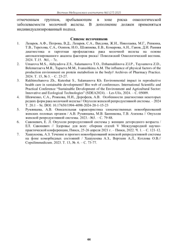 1. Лазарев, А.Ф., Петрова, В.Д., Лазарев, С.А., Вахдова, Ж.И., Николаева, М.Г., Репкина, Т.В., Терехова, С.А., Осипов, И.О., Шляпиева, Е.В., Комарова, А.Н., Ганов, Д.И. Ранняя диагностика и таргетная профилактика рака молочной железы на основе автоматизированного анализа факторов риска// Поволжский Онкологический вестник. 2024. Т.15. №1, - 7с. EDN: SLSFXF