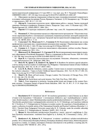 5. Кантор В. З. Инклюзивное высшее образование: специальные средовые условия обучения студентов-инвалидов в вузе // Психолого-педагогические исследования. 2019. Т. 11. № 3. С. 44-56. http://www. DOI: 10.17759/psyedu.2019110304 EDN: SIISQA