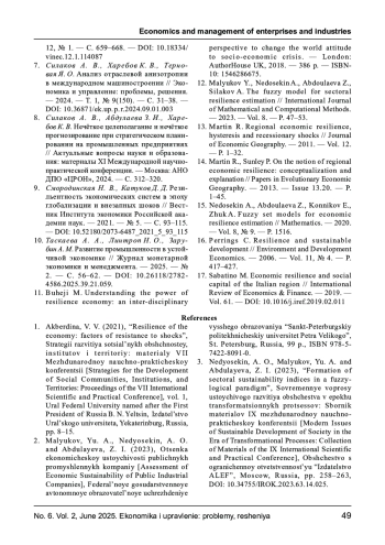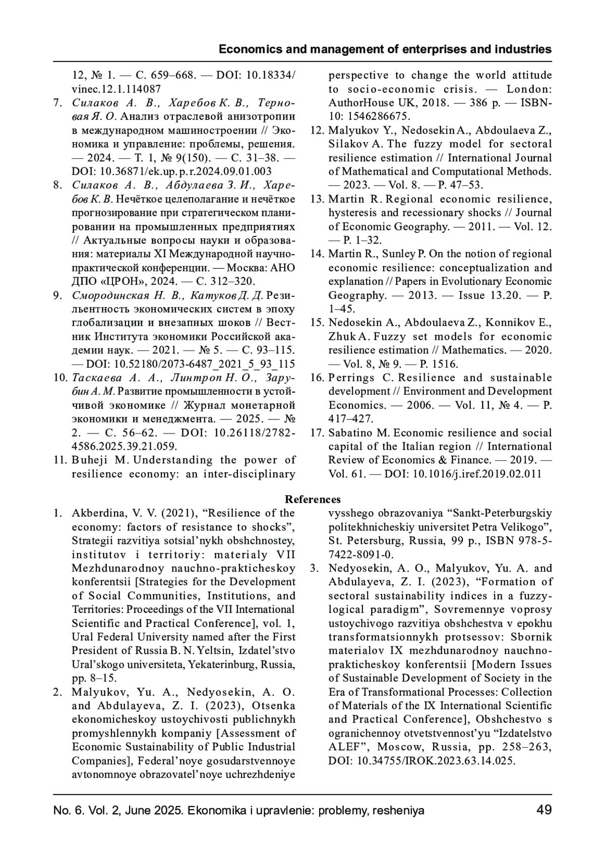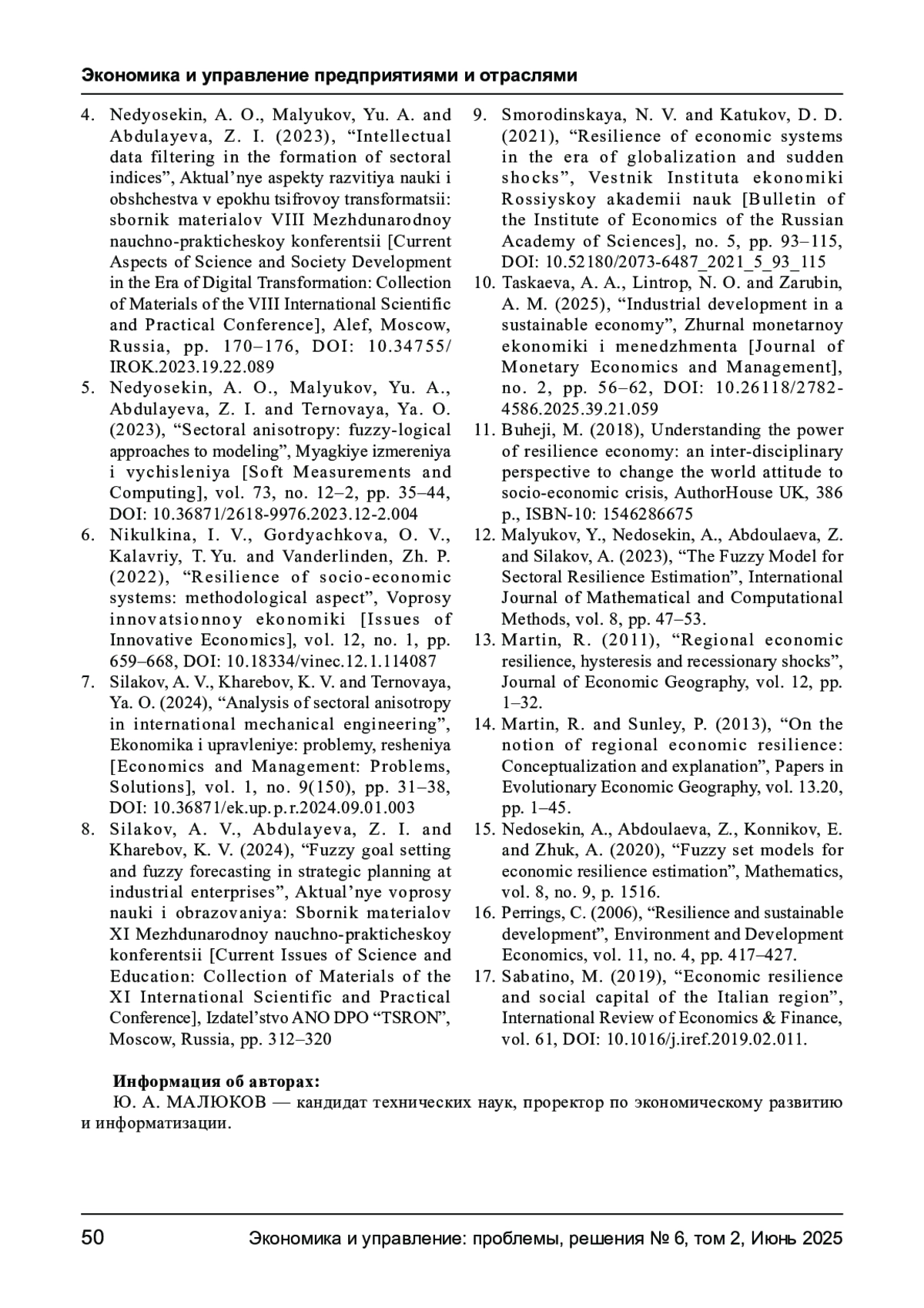 12. Malyukov Y., Nedosekin A., Abdoulaeva Z., Silakov A. The fuzzy model for sectoral resilience estimation // International Journal of Mathematical and Computational Methods. - 2023. - Vol. 8. - P. 47-53. EDN: AZHSSN