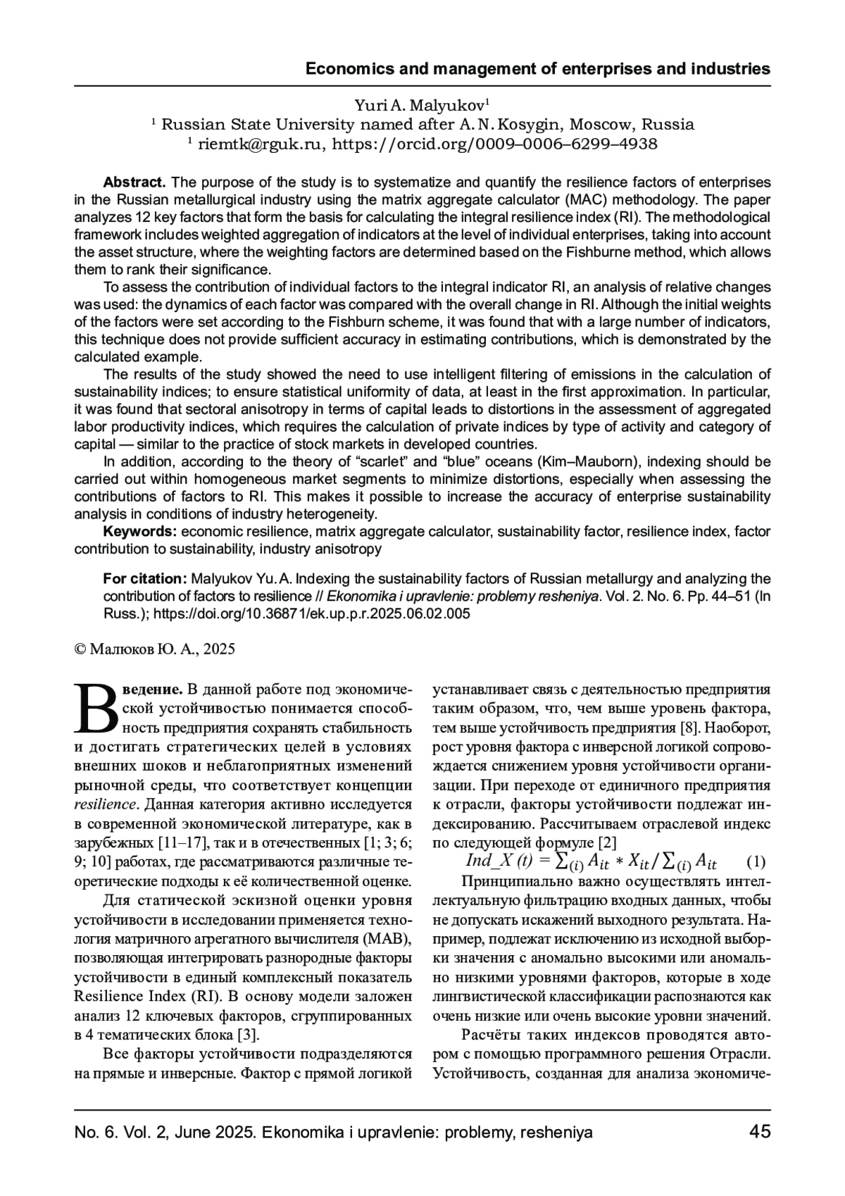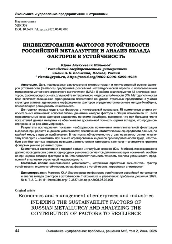 Цель исследования заключается в систематизации и количественной оценке факторов устойчивости (resilience) предприятий российской металлургической отрасли с использованием методологии матричного агрегатного вычислителя (МАВ). В работе анализируются 12 ключевых факторов, формирующих основу для расчёта интегрального индекса устойчивости (RI). Методологическая база включает взвешенное агрегирование показателей на уровне отдельных предприятий с учётом структуры активов, где весовые коэффициенты факторов определяются на основе метода Фишберна, позволяющего ранжировать их значимость.