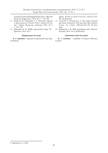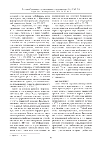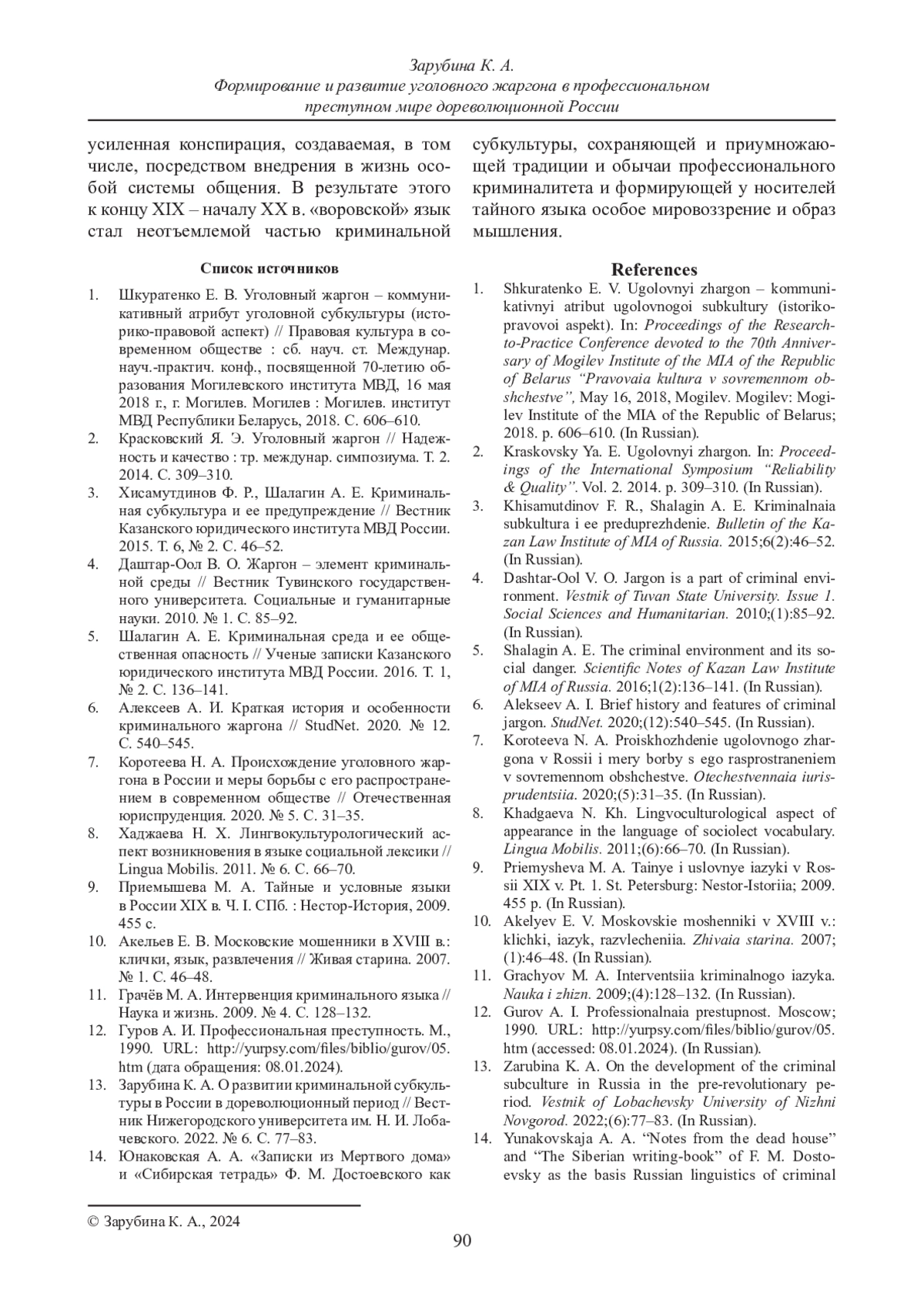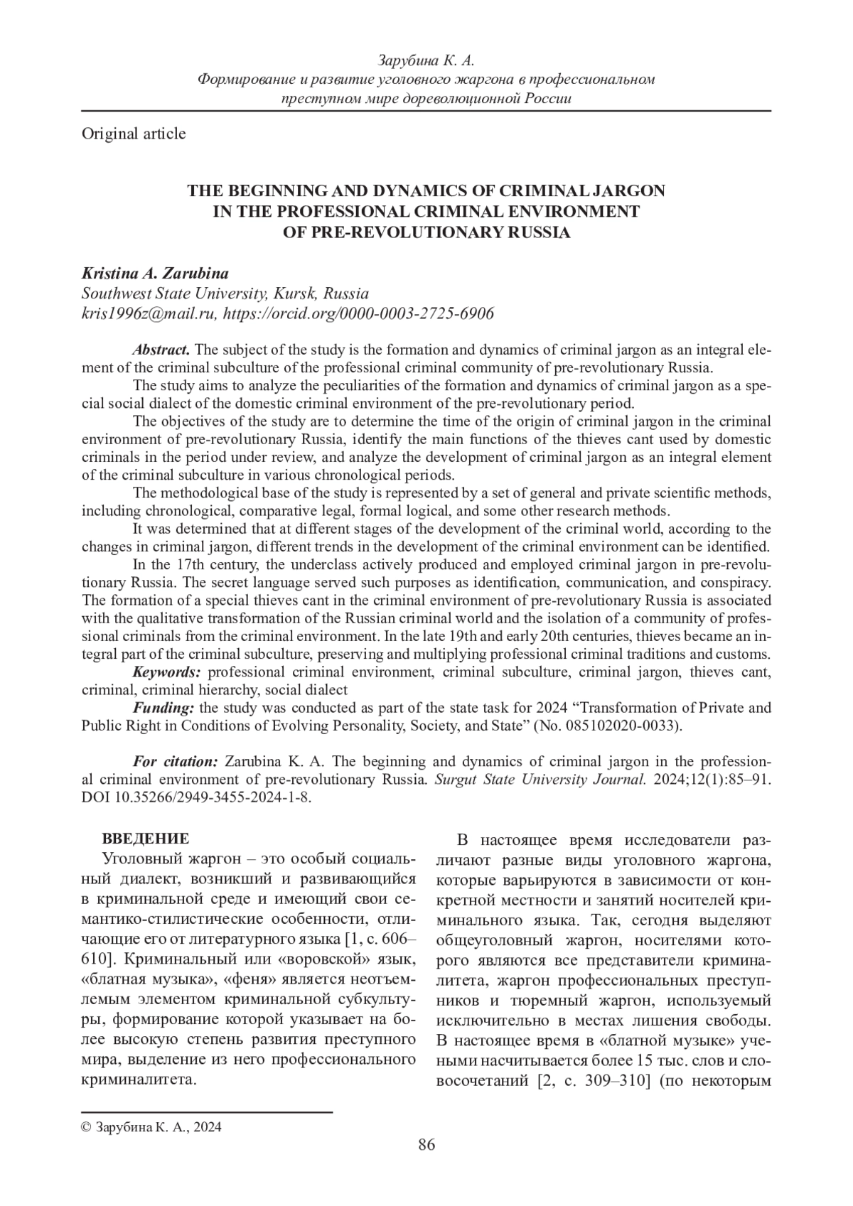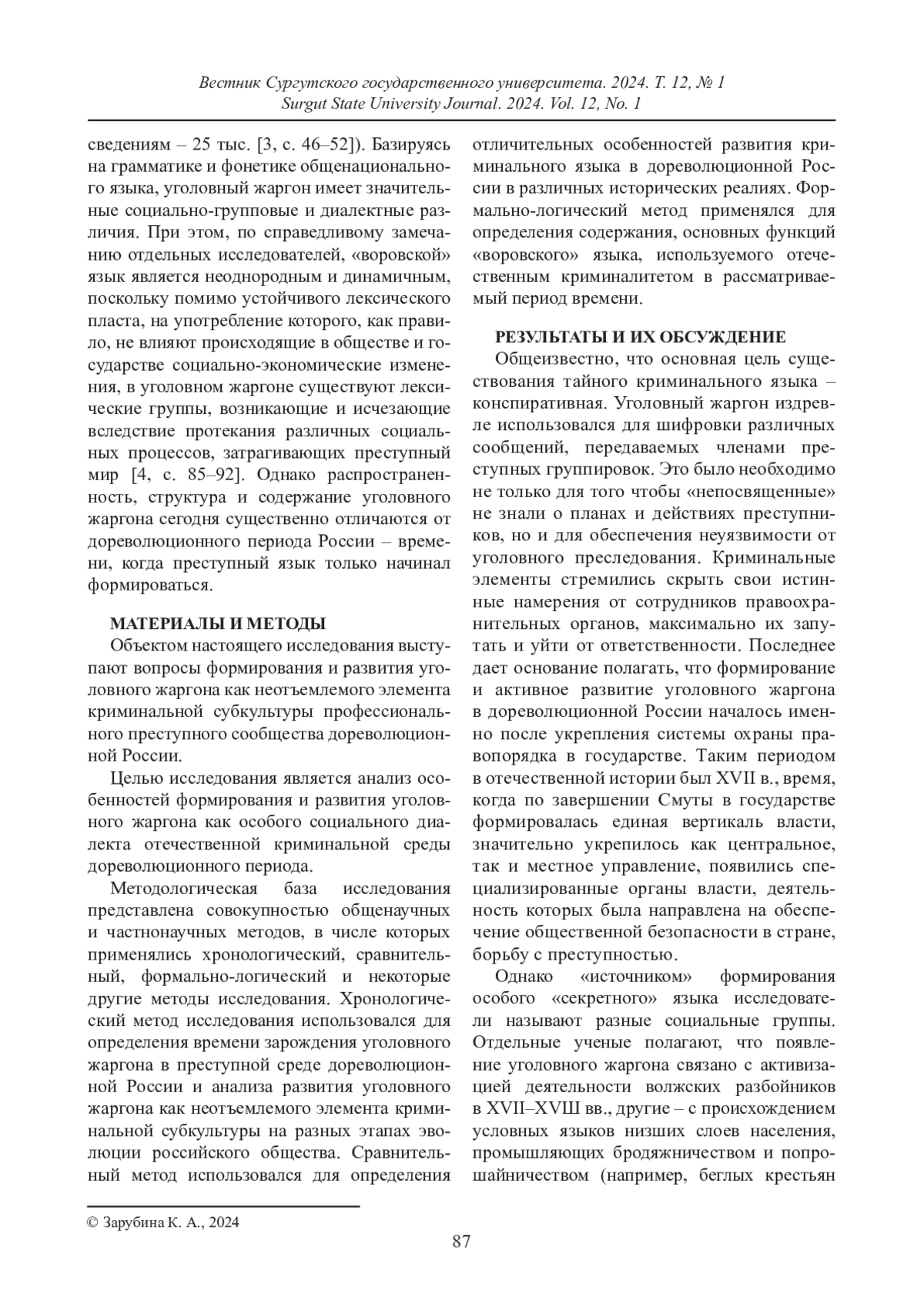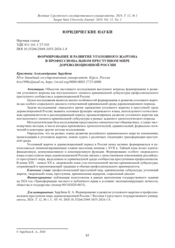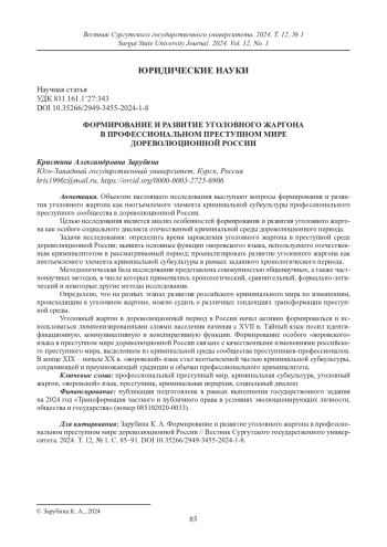 ЗАРУБИНА К. А. ФОРМИРОВАНИЕ И РАЗВИТИЕ УГОЛОВНОГО ЖАРГОНА В ПРОФЕССИОНАЛЬНОМ ПРЕСТУПНОМ МИРЕ ДОРЕВОЛЮЦИОННОЙ РОССИИ // ВЕСТНИК СУРГУТСКОГО ГОСУДАРСТВЕННОГО УНИВЕРСИТЕТА. 2024. ТОМ 12, № 1