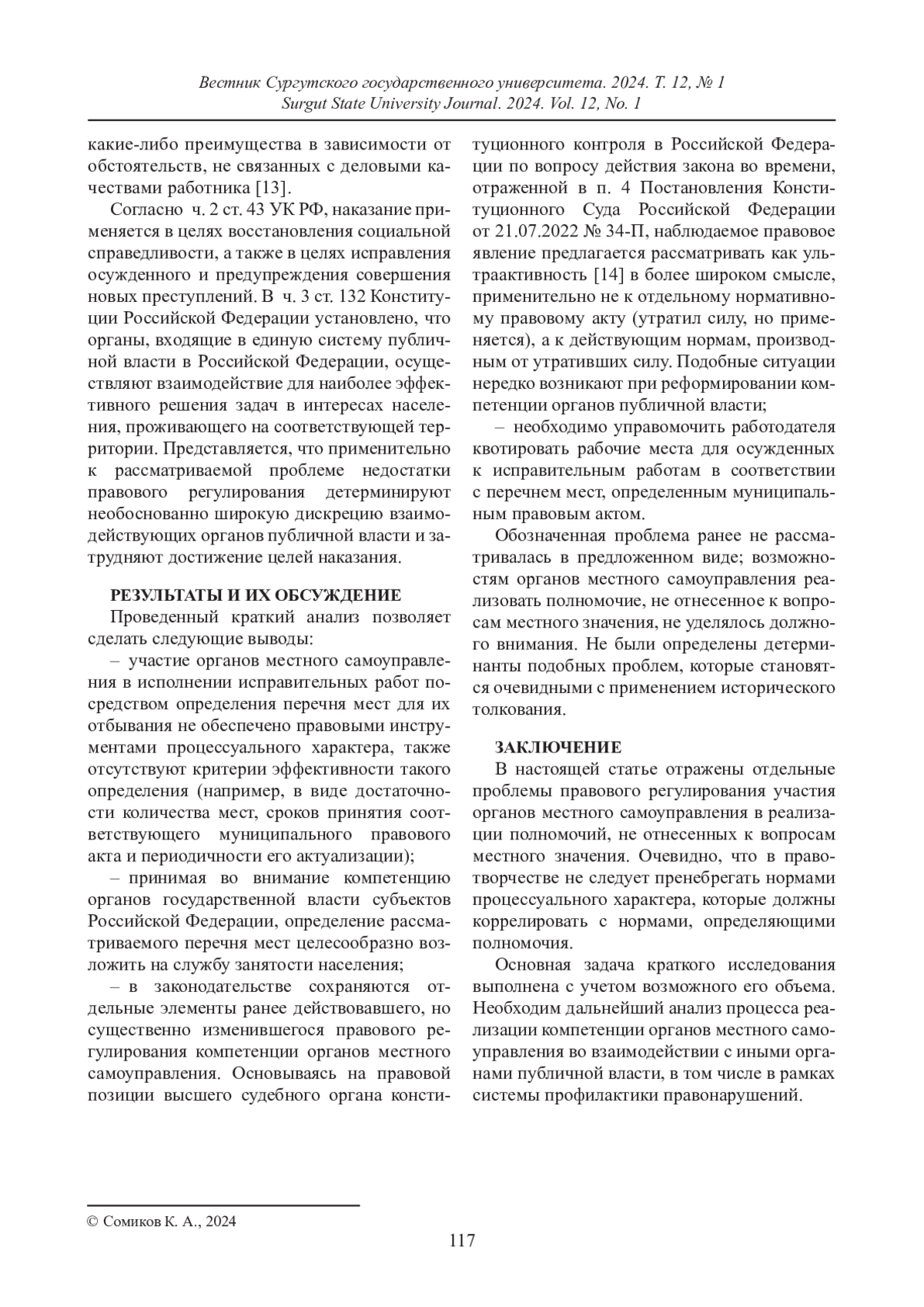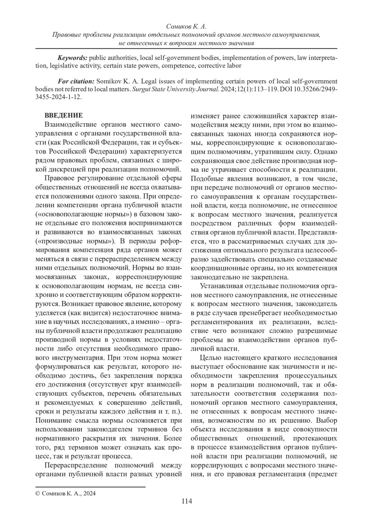 В статье отражены правовые проблемы реализации отдельных полномочий органов местного самоуправления, не отнесенных к вопросам местного значения, на примере определения мест для отбывания осужденным исправительных работ. Автором выявлено несоответствие данного полномочия текущей компетенции органов местного самоуправления и отсутствие правового инструментария, позволяющего его эффективно реализовать. Проведен анализ причин и условий возникновения данного полномочия. Предложенным примером проиллюстрированы недостатки в правотворческой деятельности, протекающей в условиях реформирования компетенции органов публичной власти. При помощи метода сравнительно-правового анализа, а также историко-политического вида толкования права отражена динамика изменений компетенции органов публичной власти. Автор кратко анализирует правовое явление, схожее с ультраактивностью, но относящееся не к норме, утратившей силу и применяющейся, а к производной от таковой действующей норме, реализация которой осложнена.