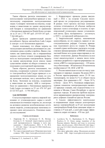 В статье исследуются теоретические и практические аспекты глобального энергетического перехода от углеводородной зависимости к возобновляемым источникам энергии с акцентом на институциональные и экономические барьеры. Особое внимание уделяется институциональным факторам: роль углеродного налога (в том числе CBAM ЕС и пилотный эксперимент на острове Сахалин в Российской Федерации) в коррекции рыночных провалов (экстерналии CO2), необходимости государственного финансирования научно-исследовательских и опытно-конструкторских работ по возобновляемым источникам энергии (теория общественных благ, теория внешних эффектов А. Пигу, эндогенный рост П. Ромера). Анализ патентной активности Российской Федерации выявил дисбаланс (129 и 90 патентов на электротранспорт и биотопливо и лишь 17, 15, 9, 9 на возобновляемые источники энергии, солнечные электростанции, ветряные электростанции, малые гидроэлектростанции соответственно) и технологическое отставание. Проведенный сравнительный анализ CAPEX/OPEX для электромобилей (Honda Kona, Lada Largus) и автомобилей с двигателями внутреннего сгорания подтверждают долгосрочную экономию эксплуатационных затрат (2,75 млн руб. за 25 лет для Honda; 470 тыс. руб. для Lada и инфраструктурные проблемы, среди которых неравномерное распределение 25–30 тыс. электромобилей и 2,5–3 тыс. зарядных станций по Российской Федерации)