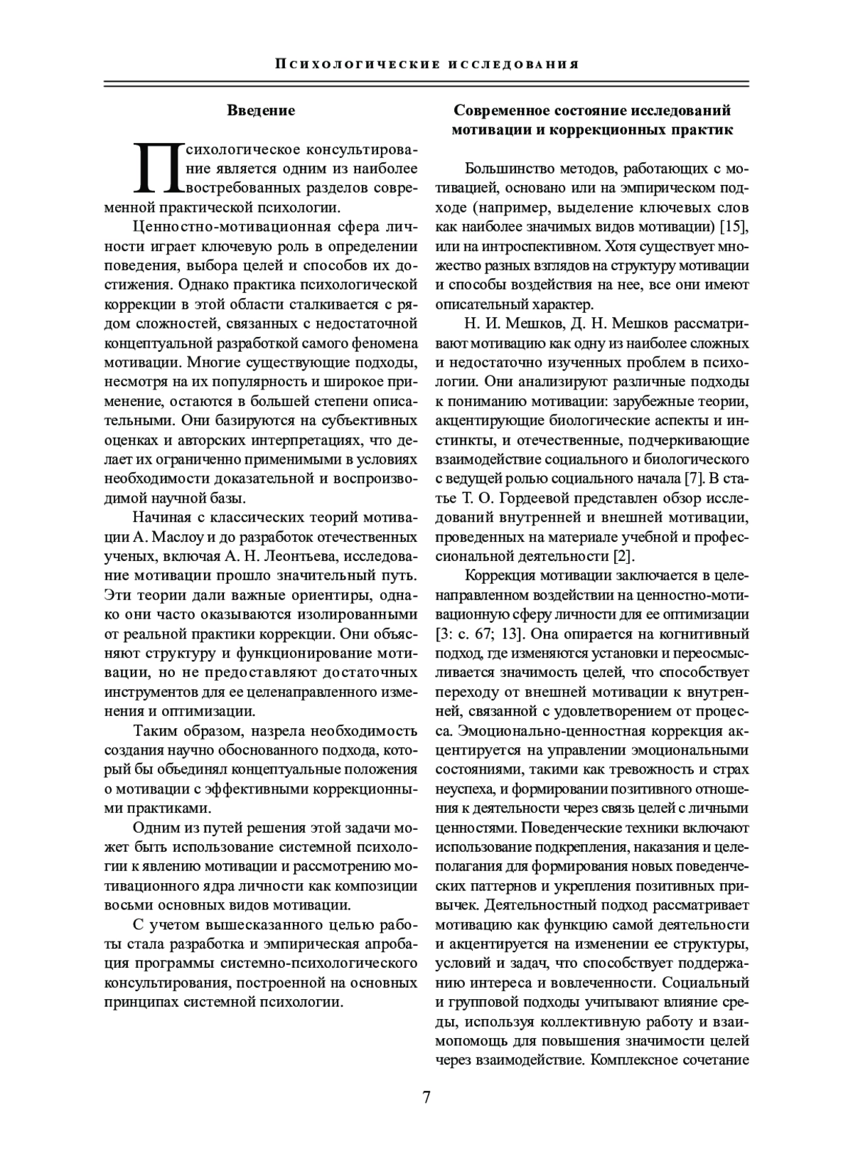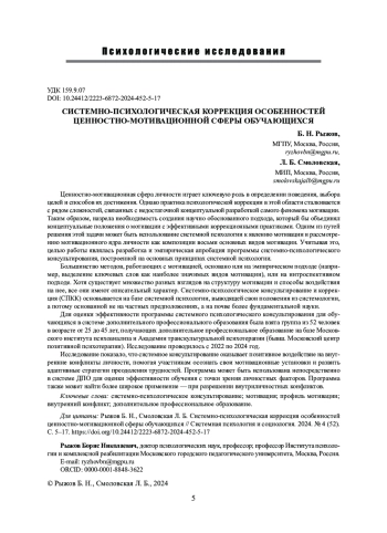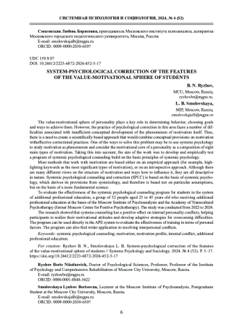 Ценностно-мотивационная сфера личности играет ключевую роль в определении поведения, выбора целей и способов их достижения. Однако практика психологической коррекции в этой области сталкивается с рядом сложностей, связанных с недостаточной концептуальной разработкой самого феномена мотивации. Таким образом, назрела необходимость создания научно обоснованного подхода, который бы объединял концептуальные положения о мотивации с эффективными коррекционными практиками. Одним из путей решения этой задачи может быть использование системной психологии к явлению мотивации и рассмотрению мотивационного ядра личности как композиции восьми основных видов мотивации. Учитывая это, целью работы являлась разработка и эмпирическая апробация программы системно-психологического консультирования, построенной на основных принципах системной психологии.