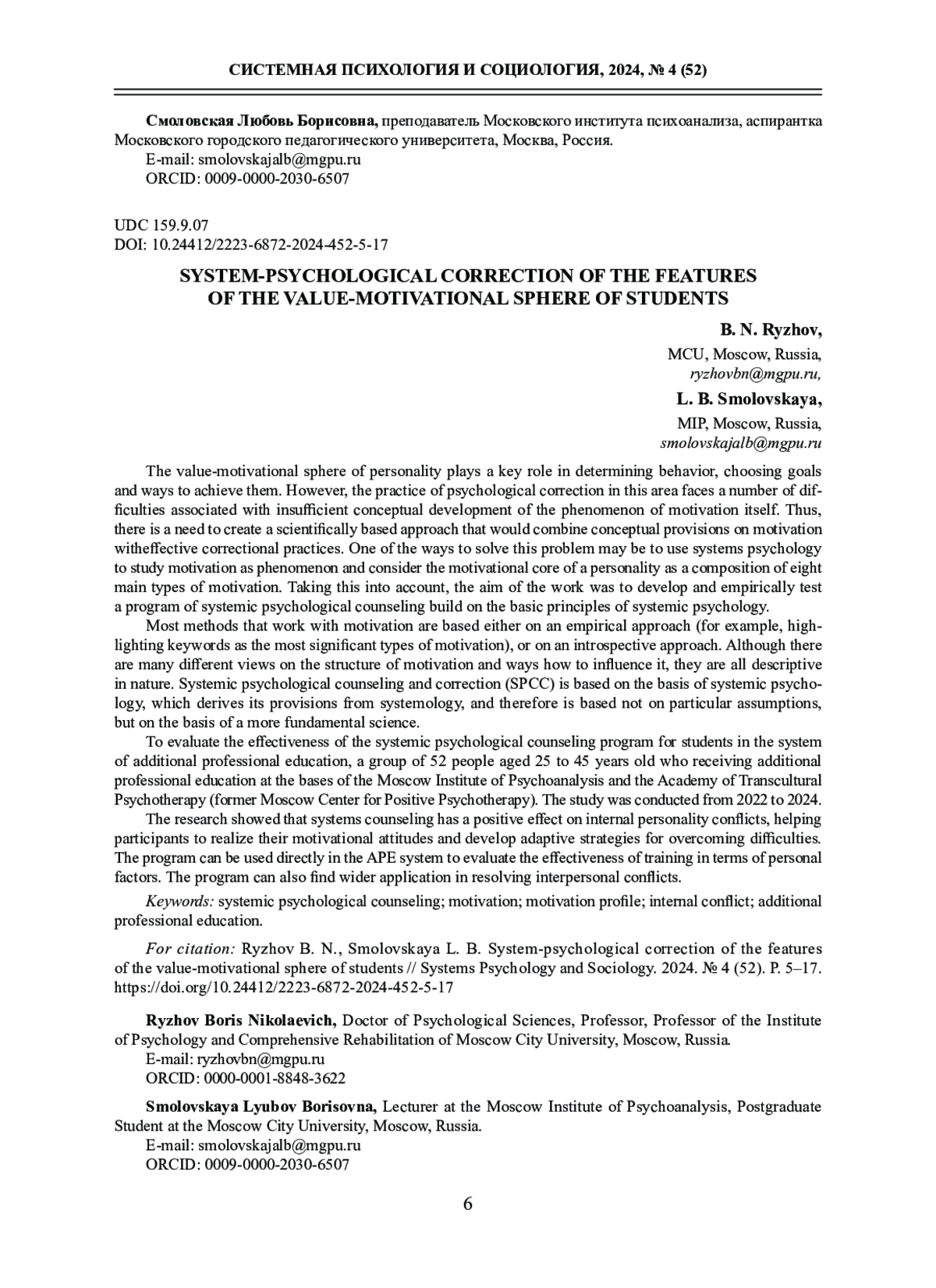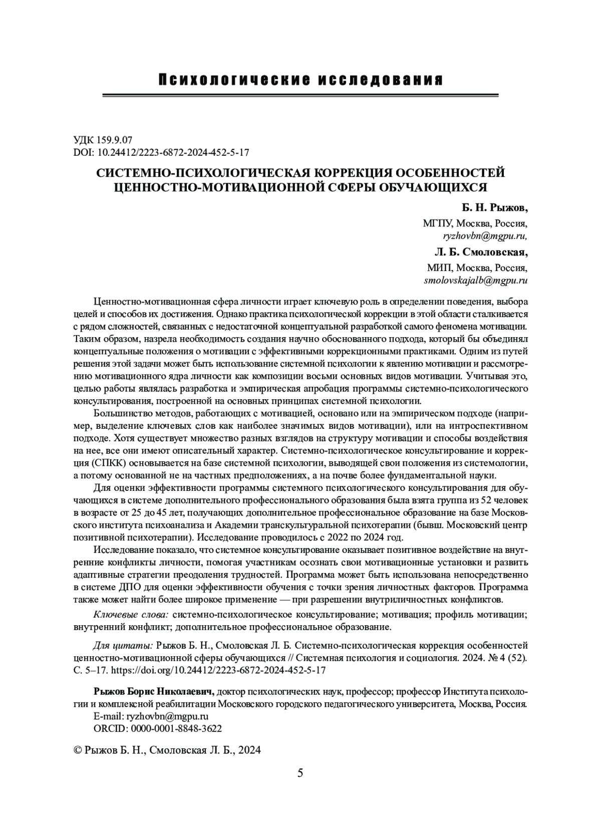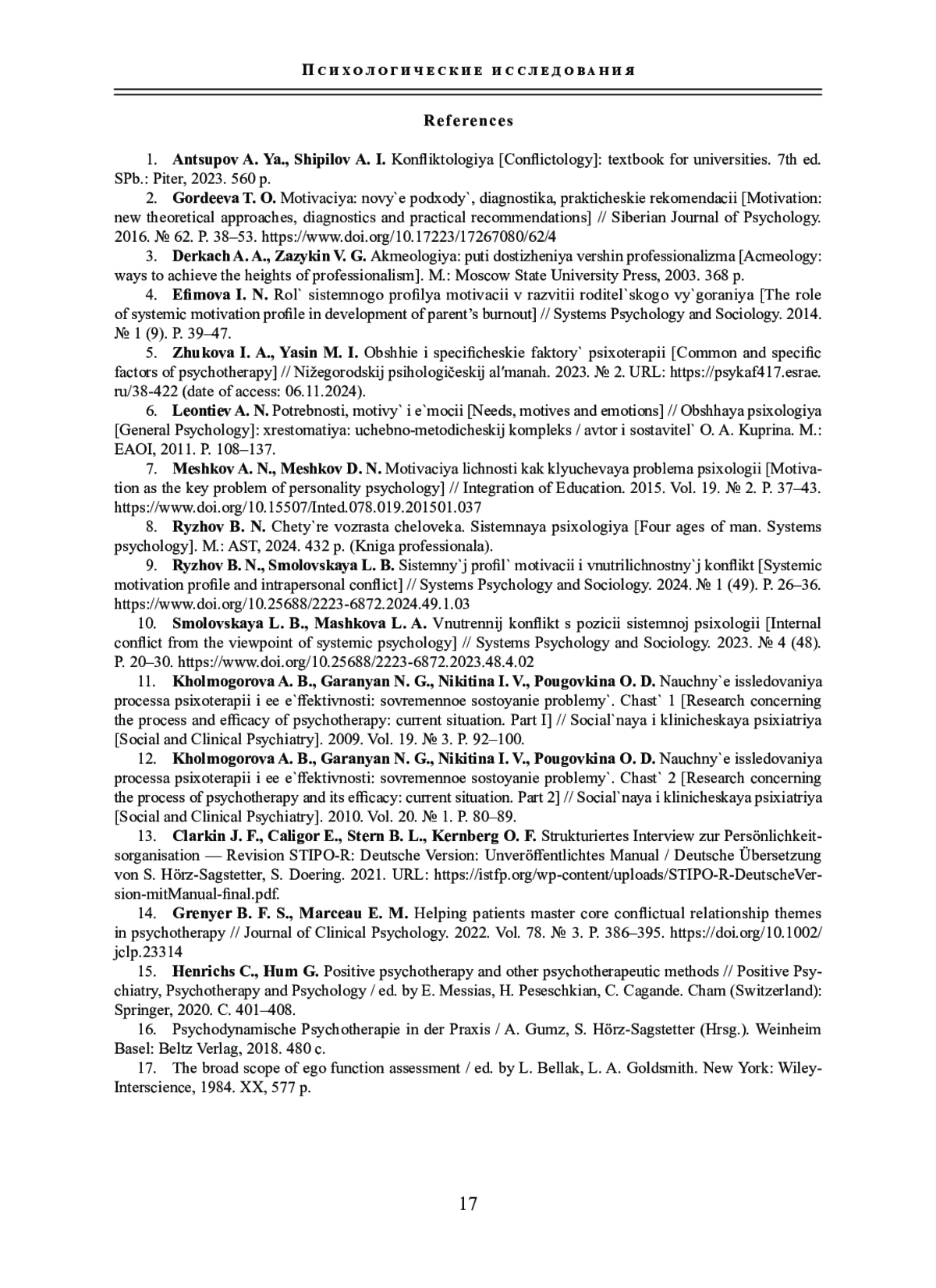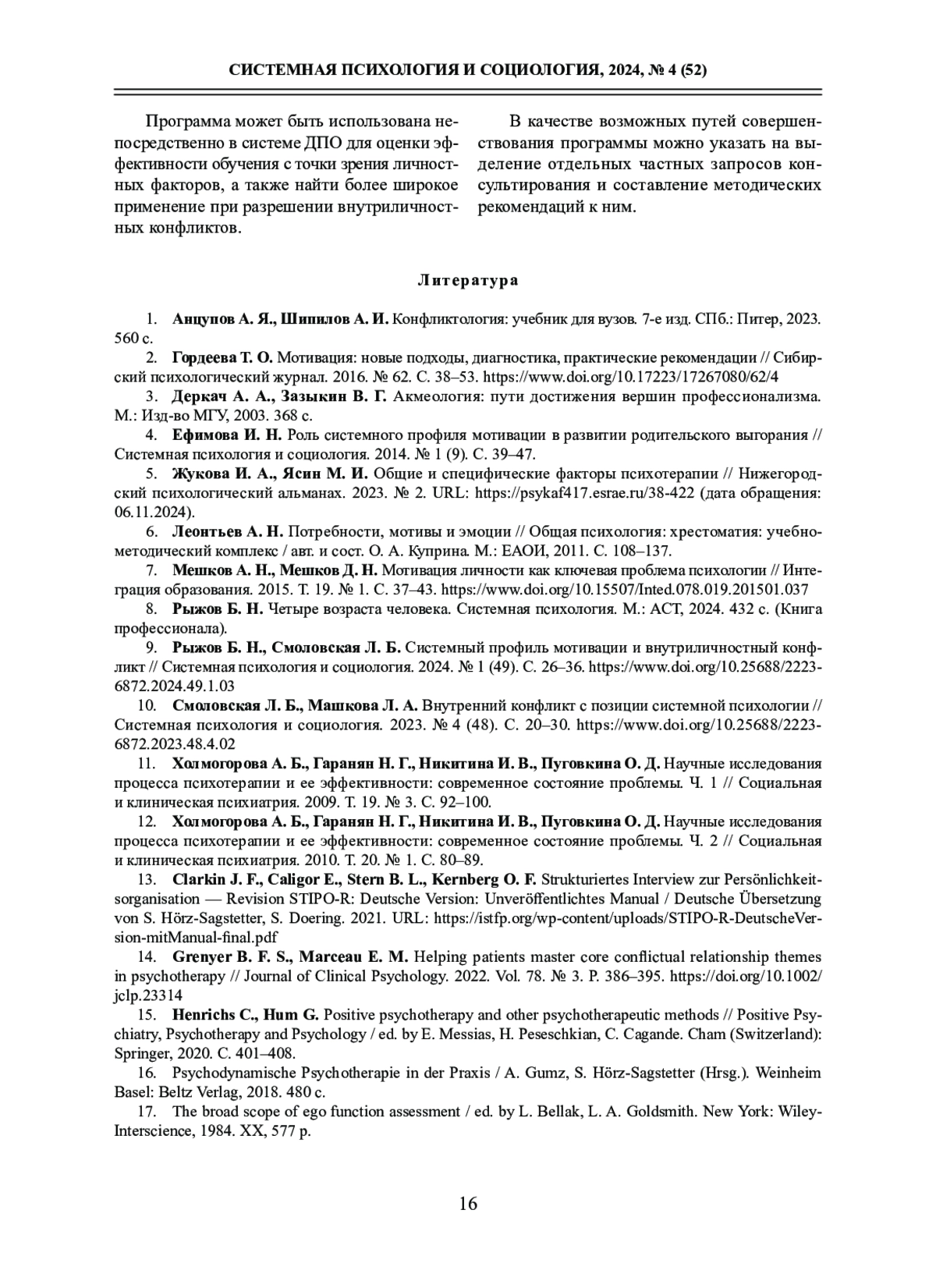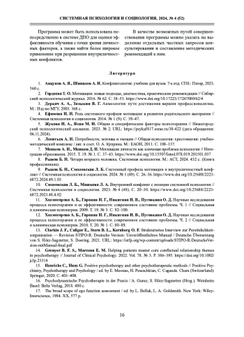 9. Рыжов Б. Н., Смоловская Л. Б. Системный профиль мотивации и внутриличностный конфликт // Системная психология и социология. 2024. № 1 (49). С. 26-36. https://www.10.25688/2223- 6872.2024.49.1.03. DOI: 10.25688/2223-6872.2024.49.1.03 EDN: ZWAWQD