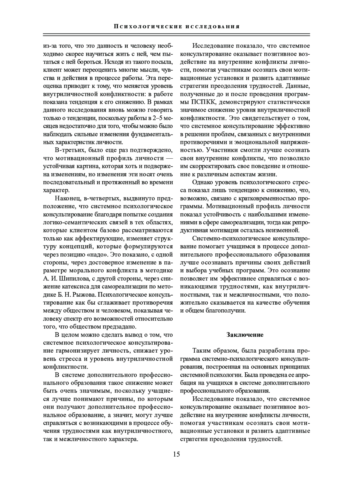 Исследование проводилось с 2022 по 2024 год. Исследование показало, что системное консультирование оказывает позитивное воздействие на внутренние конфликты личности, помогая участникам осознать свои мотивационные установки и развить адаптивные стратегии преодоления трудностей. Программа может быть использована непосредственно в системе ДПО для оценки эффективности обучения с точки зрения личностных факторов. Программа также может найти более широкое применение - при разрешении внутриличностных конфликтов.