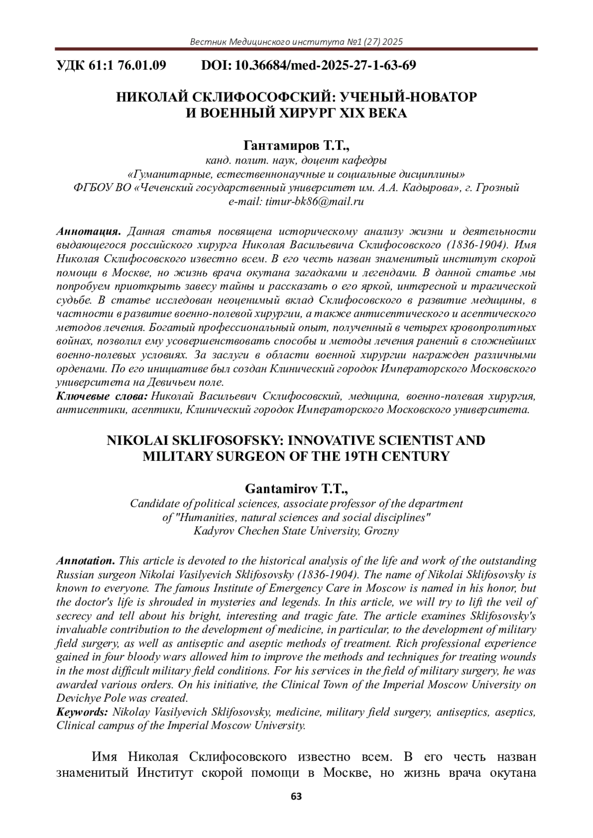 Данная статья посвящена историческому анализу жизни и деятельности выдающегося российского хирурга Николая Васильевича Склифосовского (1836-1904). Имя Николая Склифосовского известно всем. В его честь назван знаменитый институт скорой помощи в Москве, но жизнь врача окутана загадками и легендами. В данной статье мы попробуем приоткрыть завесу тайны и рассказать о его яркой, интересной и трагической судьбе. В статье исследован неоценимый вклад Склифосовского в развитие медицины, в частности в развитие военно-полевой хирургии, а также антисептического и асептического методов лечения. Богатый профессиональный опыт, полученный в четырех кровопролитных войнах, позволил ему усовершенствовать способы и методы лечения ранений в сложнейших военно-полевых условиях. За заслуги в области военной хирургии награжден различными орденами. По его инициативе был создан Клинический городок Императорского Московского университета на Девичьем поле.