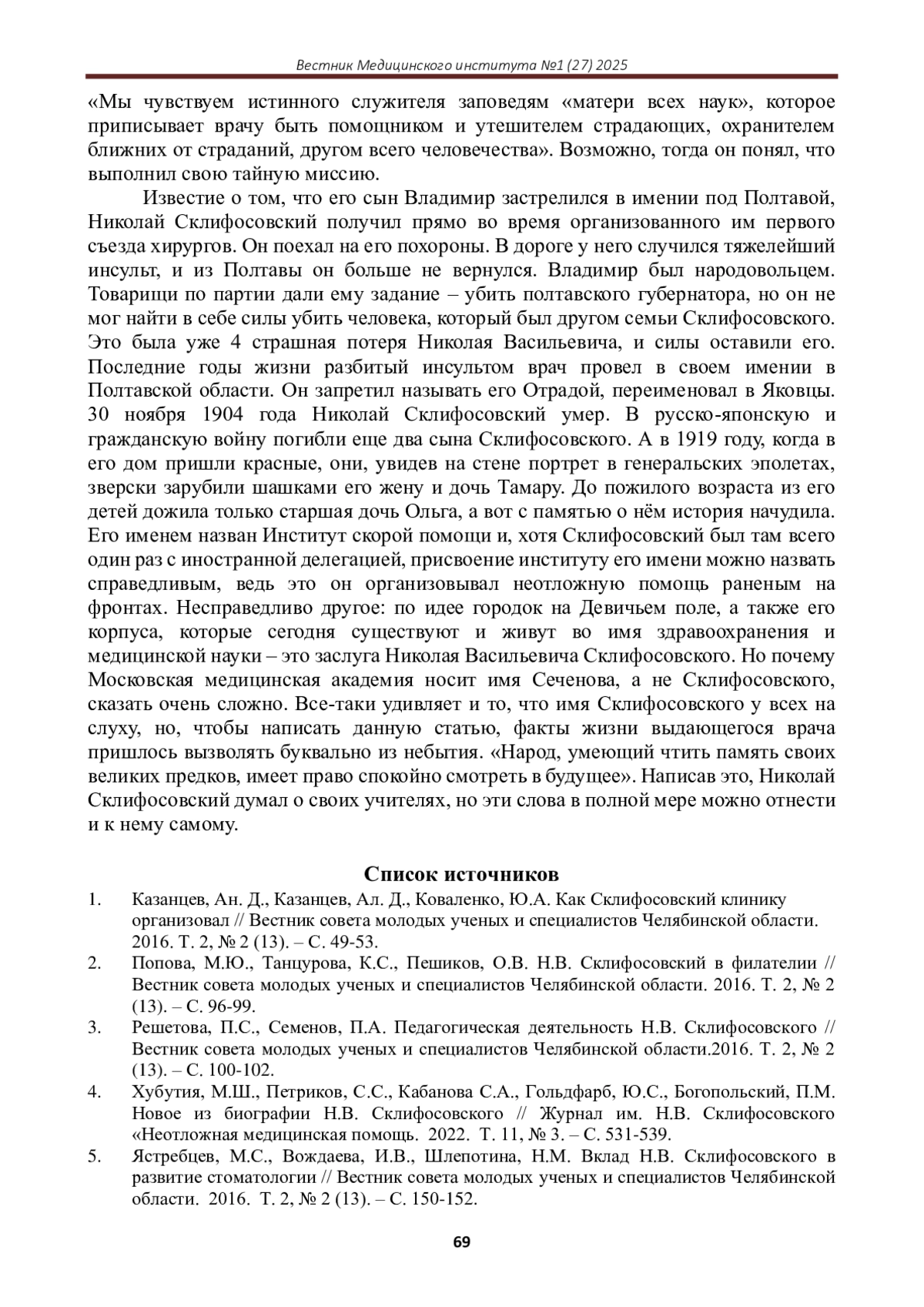 1. Казанцев, Ан. Д., Казанцев, Ал. Д., Коваленко, Ю.А. Как Склифосовский клинику организовал // Вестник совета молодых ученых и специалистов Челябинской области. 2016. Т. 2, № 2 (13). - С. 49-53. EDN: WCKCLH