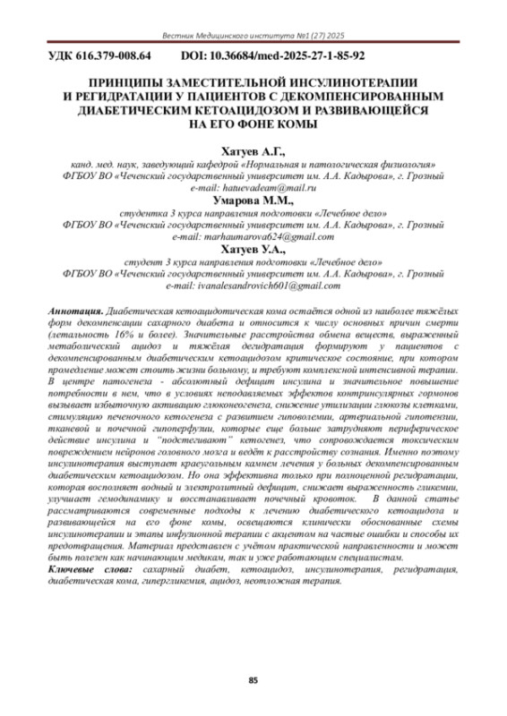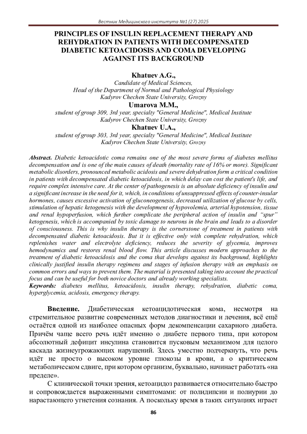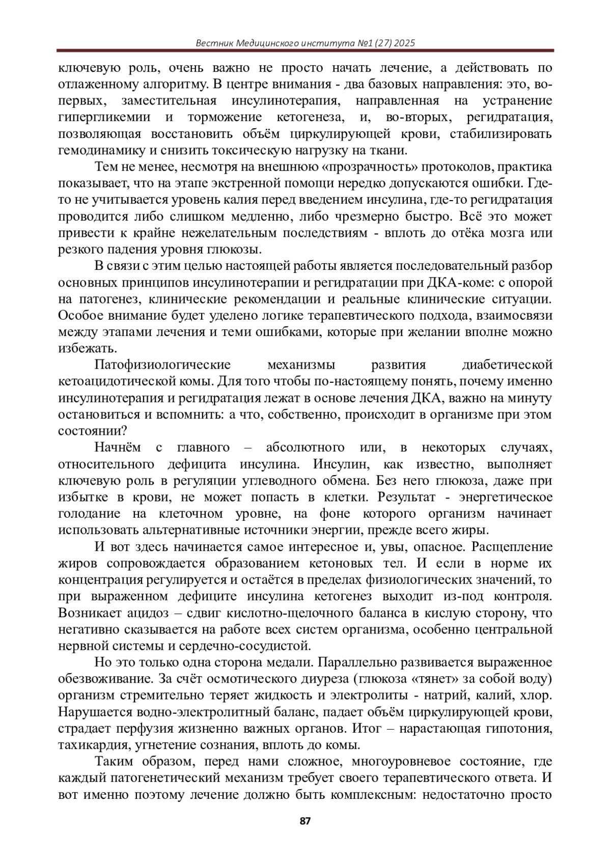 Диабетическая кетоацидотическая кома остаётся одной из наиболее тяжёлых форм декомпенсации сахарного диабета и относится к числу основных причин смерти (летальность 16% и более). Значительные расстройства обмена веществ, выраженный метаболический ацидоз и тяжёлая дегидратация формируют у пациентов с декомпенсированным диабетическим кетоацидозом критическое состояние, при котором промедление может стоить жизни больному, и требуют комплексной интенсивной терапии. В центре патогенеза - абсолютный дефицит инсулина и значительное повышение потребности в нем, что в условиях неподавляемых эффектов контринсулярных гормонов вызывает избыточную активацию глюконеогенеза, снижение утилизации глюкозы клетками, стимуляцию печеночного кетогенеза с развитием гиповолемии, артериальной гипотензии, тканевой и почечной гипоперфузии, которые еще больше затрудняют периферическое действие инсулина и “подстегивают” кетогенез, что сопровождается токсическим повреждением нейронов головного мозга и ведёт к расстройству сознания. Именно поэтому инсулинотерапия выступает краеугольным камнем лечения у больных декомпенсированным диабетическим кетоацидозом. Но она эффективна только при полноценной регидратации, которая восполняет водный и электролитный дефицит, снижает выраженность гликемии, улучшает гемодинамику и восстанавливает почечный кровоток. В данной статье рассматриваются современные подходы к лечению диабетического кетоацидоза и развивающейся на его фоне комы, освещаются клинически обоснованные схемы инсулинотерапии и этапы инфузионной терапии с акцентом на частые ошибки и способы их предотвращения. Материал представлен с учётом практической направленности и может быть полезен как начинающим медикам, так и уже работающим специалистам.