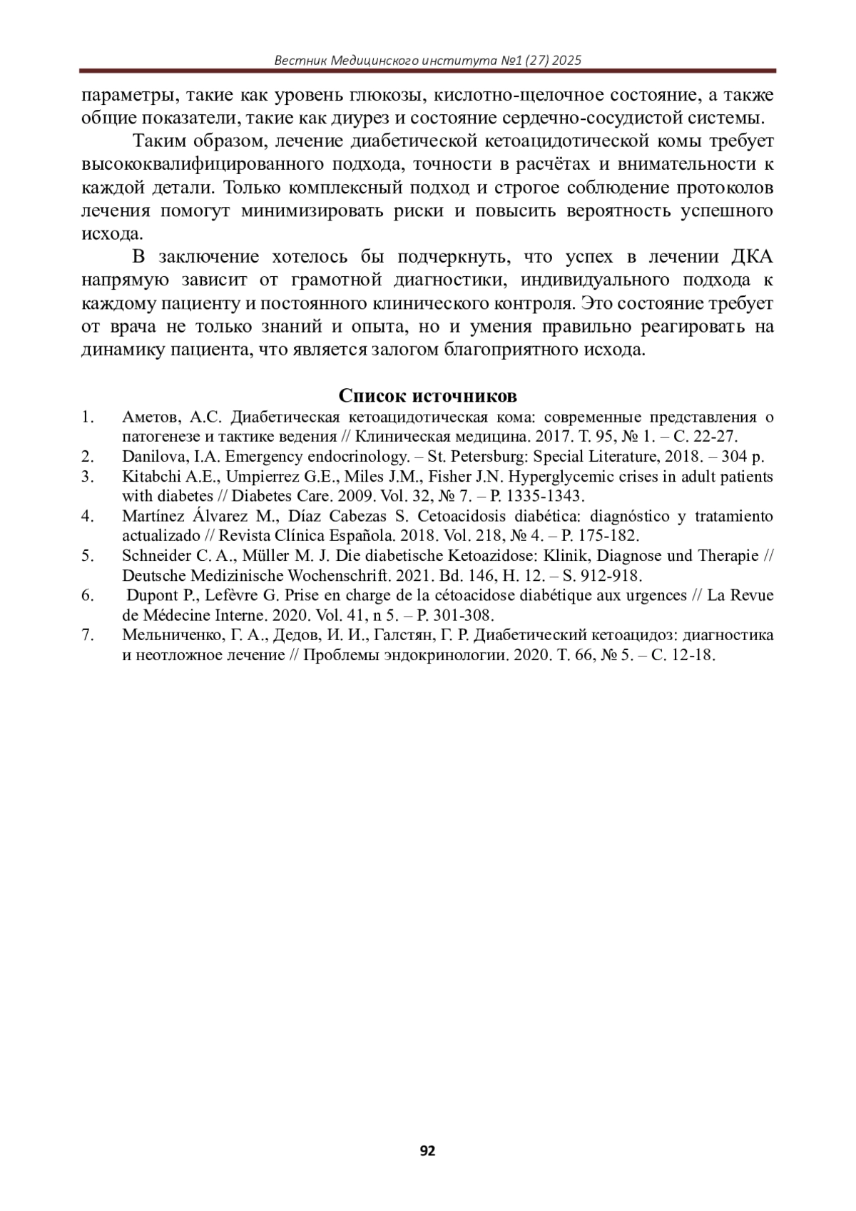 7. Мельниченко, Г. А., Дедов, И. И., Галстян, Г. Р. Диабетический кетоацидоз: диагностика и неотложное лечение // Проблемы эндокринологии. 2020. Т. 66, № 5. - С. 12-18.