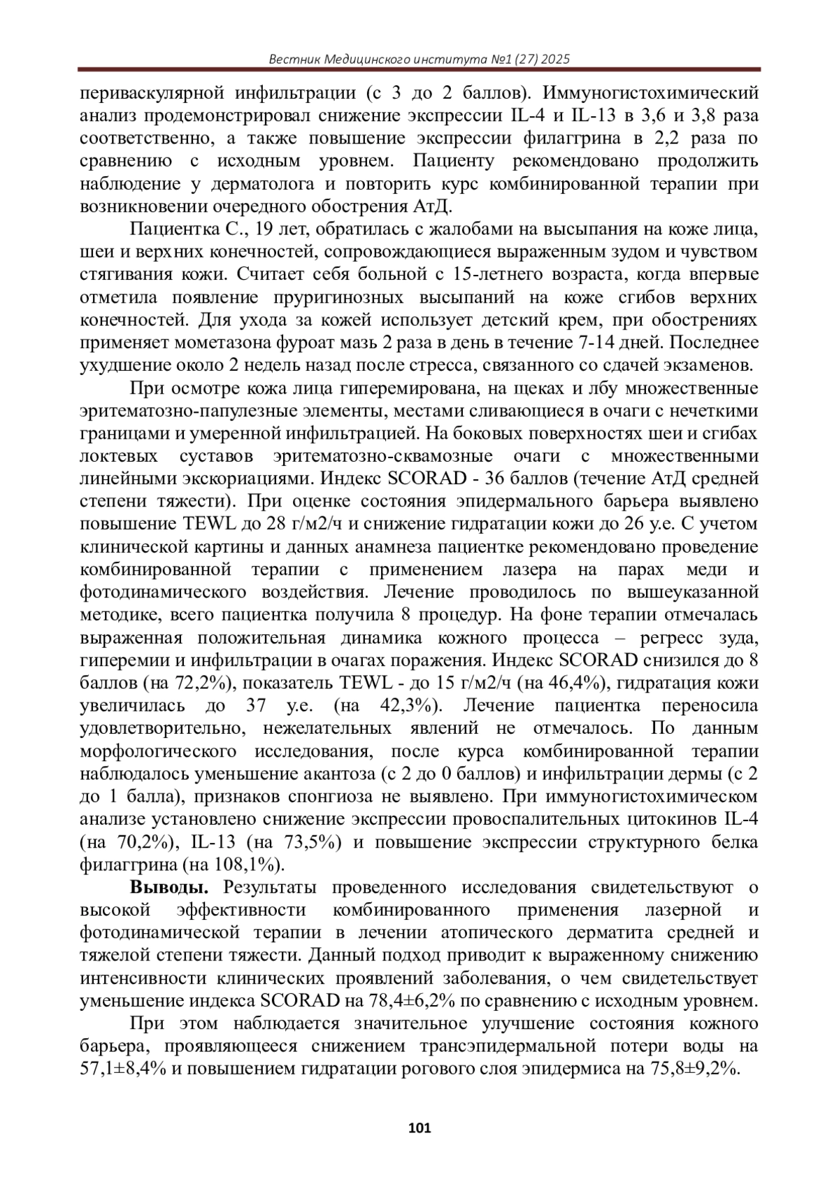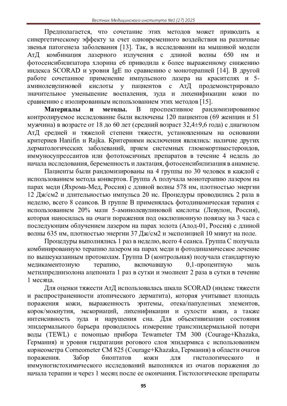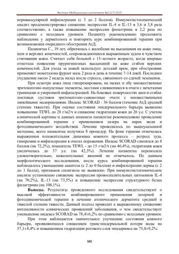 В настоящем исследовании рассматривается комбинированное применение лазерных и фотодинамических методов в лечении атопического дерматита с целью оценки синергетического эффекта и оптимизации терапевтических протоколов. В исследовании приняли участие 120 пациентов с диагнозом «атопический дерматит средней и тяжелой степени тяжести», которые были разделены на 4 группы по 30 человек в каждой. Группа А получала только лазерную терапию (лазер на парах меди с длиной волны 578 нм, плотность энергии 12 Дж/см2, 8 процедур), группа B - только фотодинамическую терапию (5-аминолевулиновая кислота в концентрации 20%, экспозиция 3 часа, облучение лазером с длиной волны 635 нм, плотность энергии 37 Дж/см2, 4 процедуры), группа C - комбинацию лазерной и фотодинамической терапии (по вышеуказанным протоколам), а группа D - стандартную медикаментозную терапию (топические глюкокортикостероиды и эмолиенты). Результаты оценивались по динамике индекса SCORAD, трансэпидермальной потере воды (TEWL), гидратации кожи, а также гистологическому и иммуногистохимическому исследованию биоптатов кожи до и после лечения.. Полученные данные свидетельствуют о выраженном синергетическом эффекте комбинированного применения лазерной и фотодинамической терапии в лечении атопического дерматита, что позволяет оптимизировать терапевтические протоколы и улучшить клинические результаты лечения данной патологии.
