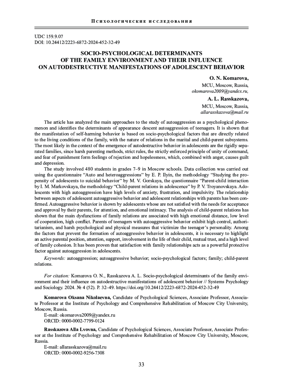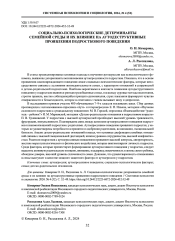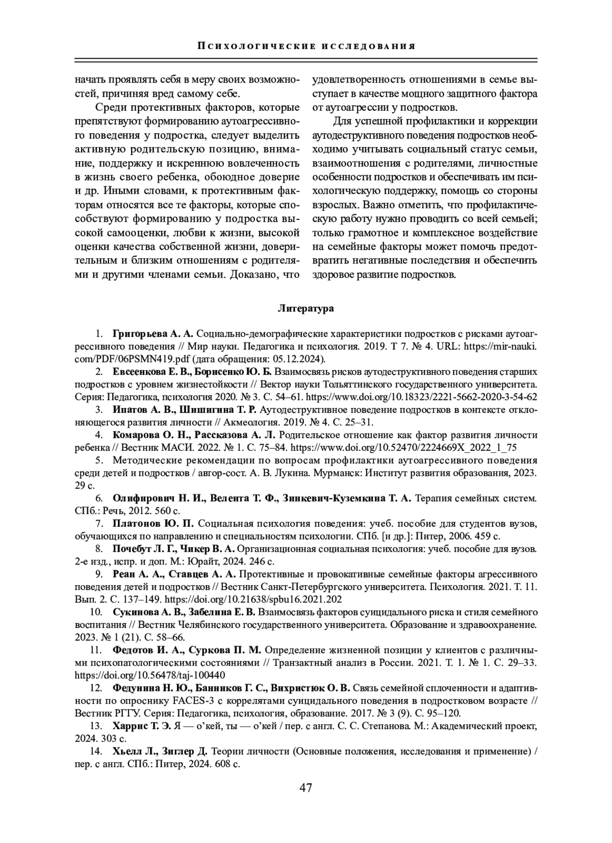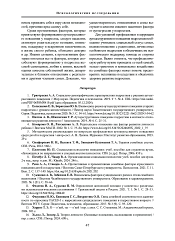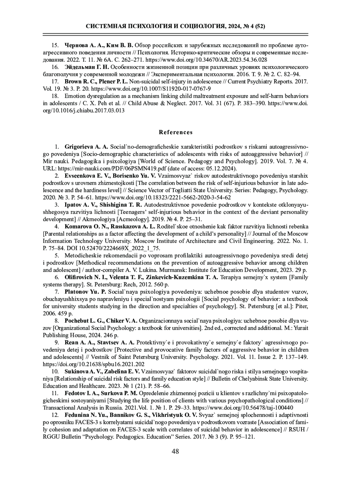 1. Григорьева А. А. Социально-демографические характеристики подростков с рисками аутоагрессивного поведения // Мир науки. Педагогика и психология. 2019. Т 7. № 4. URL: https://mir-nauki.com/PDF/06PSMN419.pdf (дата обращения: 05.12.2024). EDN: SGIRVF