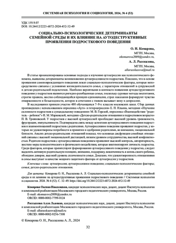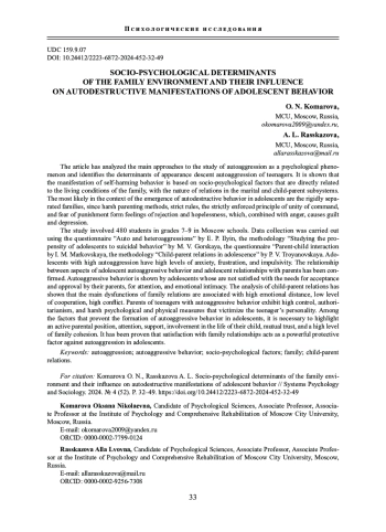 В исследовании приняли участие 480 обучающихся 7-9-х классов московских школ. Сбор данных производился с использованием опросника «Ауто- и гетероагрессии» Е. П. Ильина, методики «Изучение склонности подростков к суицидальному поведению» М. В. Горской, опросника «Взаимодействие “родитель - ребенок”» И. М. Марковской, методики «Детско-родительские отношения в подростковом возрасте» П. В. Трояновской. У подростков с высокой аутоагрессией преобладает высокий уровень тревожности, фрустрац ии, импульсивности. Подтверждена связь между аспектами аутоагрессивного поведения подростков и взаимоотношений подростков с родителями. Аутоагрессивное поведение прояв ляют подростки, у которых не удовлетворены потребности в принятии и одобрении родителями, во внимании, эмоциональной близости. Анализ детско-родительских отношений показал, что основные дисфункции семейных отношений связаны с высокой эмоциональной дистанцией, низким уровнем сотрудничества, высокой конфликтностью. Родители подростков с аутоагрессивным поведением проявляют высокий контроль, авторитарность, жесткие меры психологического и физического воздействия, которые виктимизируют личность подростка. Среди факторов, которые препятствуют формированию аутоагрессивного поведения у подростка, следует выделить активную родительскую позицию, внимание, поддержку, вовлеченность в жизнь своего ребенка, обоюдное доверие, высокий уровень сплоченности семьи. Доказано, что удовлетворенность отношениями в семье выступает в качестве мощного защитного фактора от аутоагрессии у подростков.