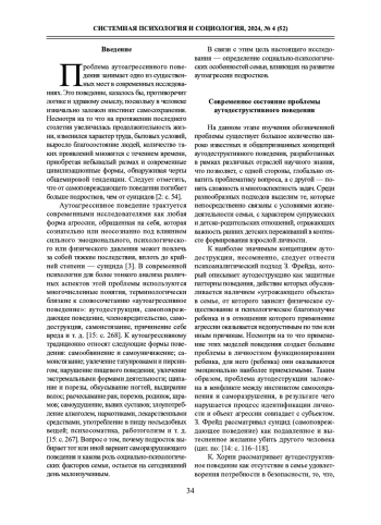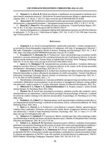3. Ипатов А. В., Шишигина Т. Р. Аутодеструктивное поведение подростков в контексте отклоняющегося развития личности // Акмеология. 2019. № 4. С. 25-31.