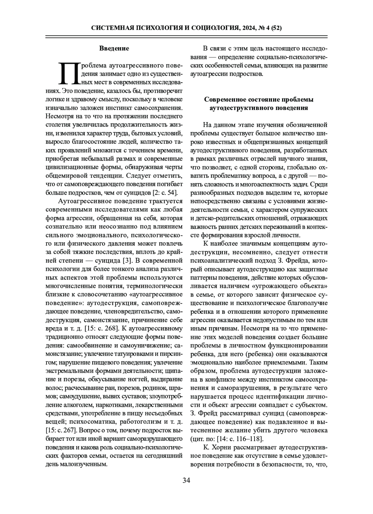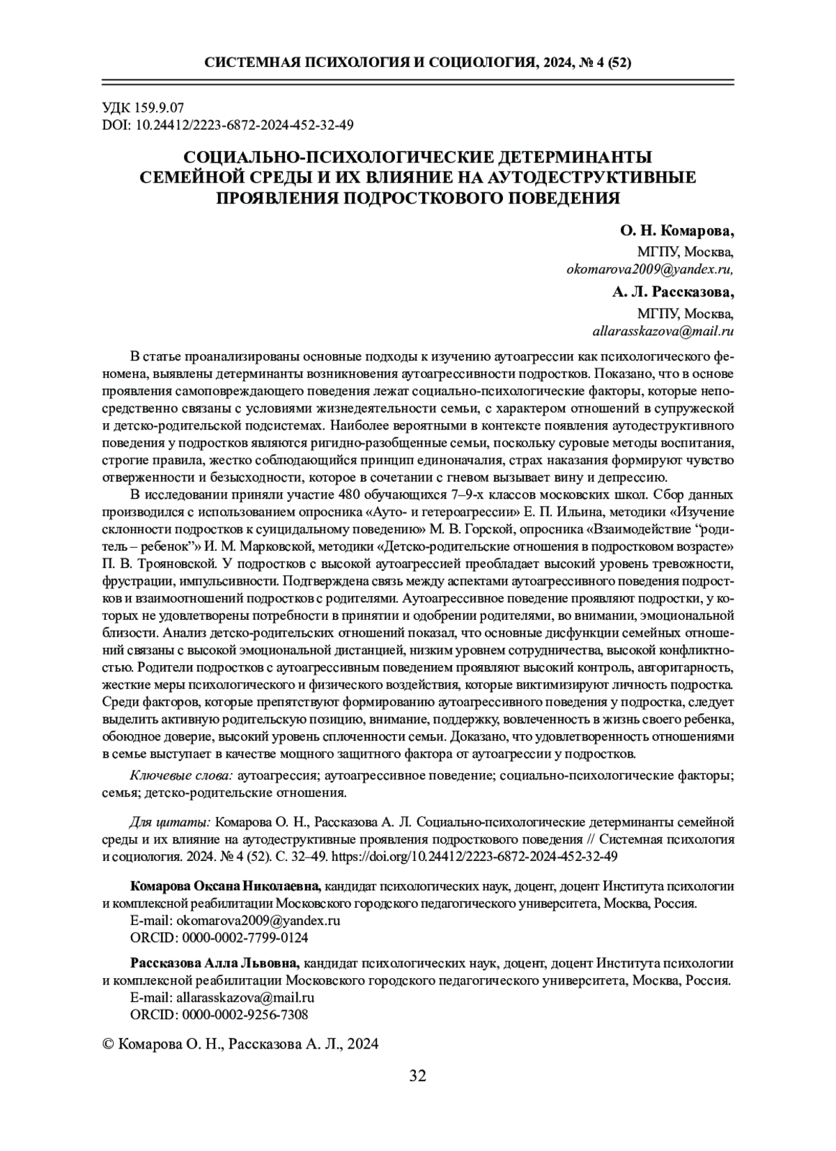В статье проанализированы основные подходы к изучению аутоагрессии как психологического феномена, выявлены детерминанты возникновения аутоагрессивности подростков. Показано, что в основе проявления самоповреждающего поведения лежат социально-психологические факторы, которые непосредственно связаны с условиями жизнедеятельности семьи, с характером отношений в супружеской и детско-родительской подсистемах. Наиболее вероятными в контексте появления аутодеструктивного поведения у подростков являются ригидно-разобщенные семьи, поскольку суровые методы воспитания, строгие правила, жестко соблюдающийся принцип единоначалия, страх наказания формируют чувство отверженности и безысходности, которое в сочетании с гневом вызывает вину и депрессию.