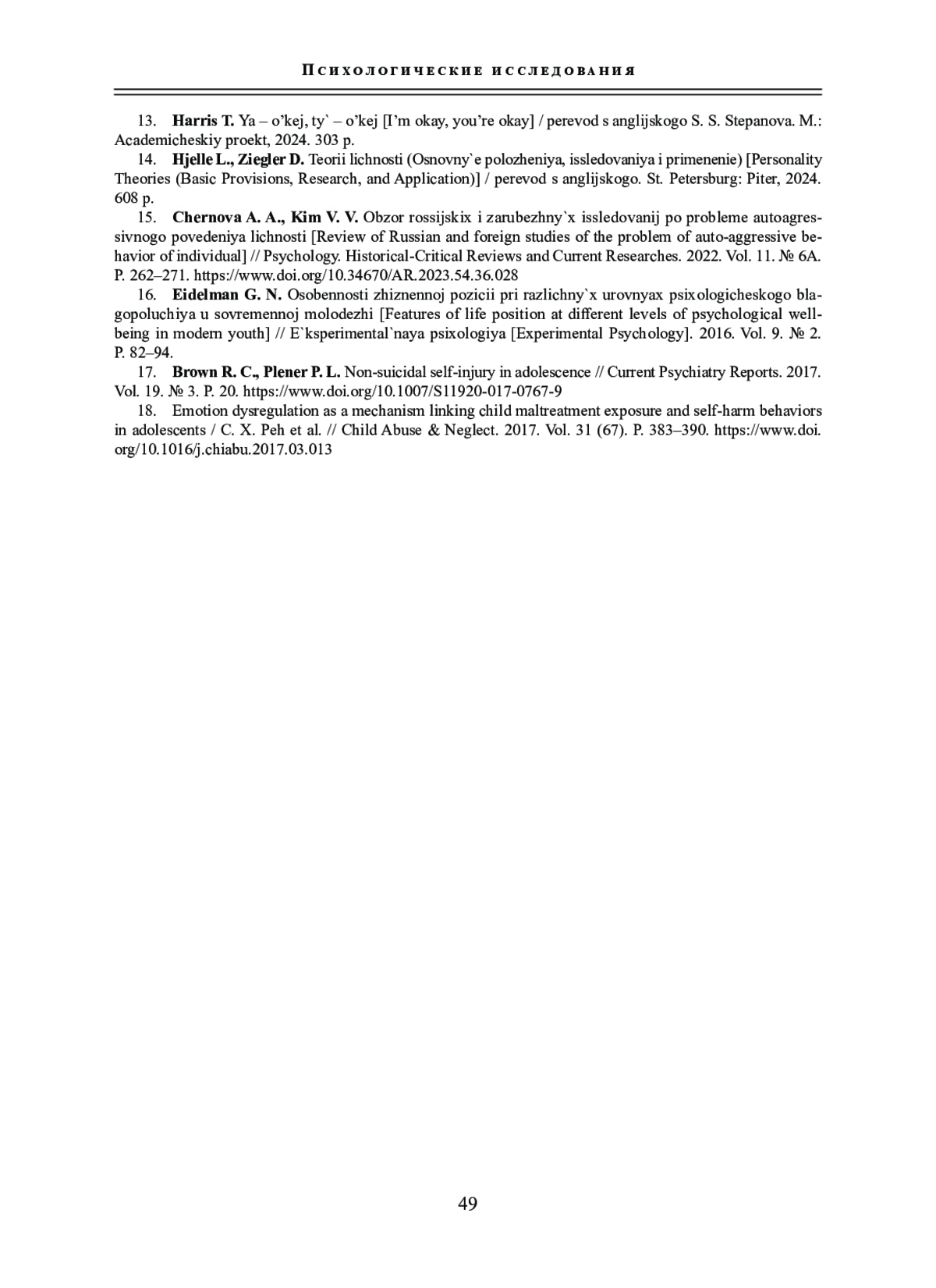 15. Чернова А. А., Ким В. В. Обзор российских и зарубежных исследований по проблеме аутоагрессивного поведения личности // Психология. Историко-критические обзоры и современные исследования. 2022. Т. 11. № 6А. С. 262-271. https://www. DOI: 10.34670/AR.2023.54.36.028 EDN: RGNAZV