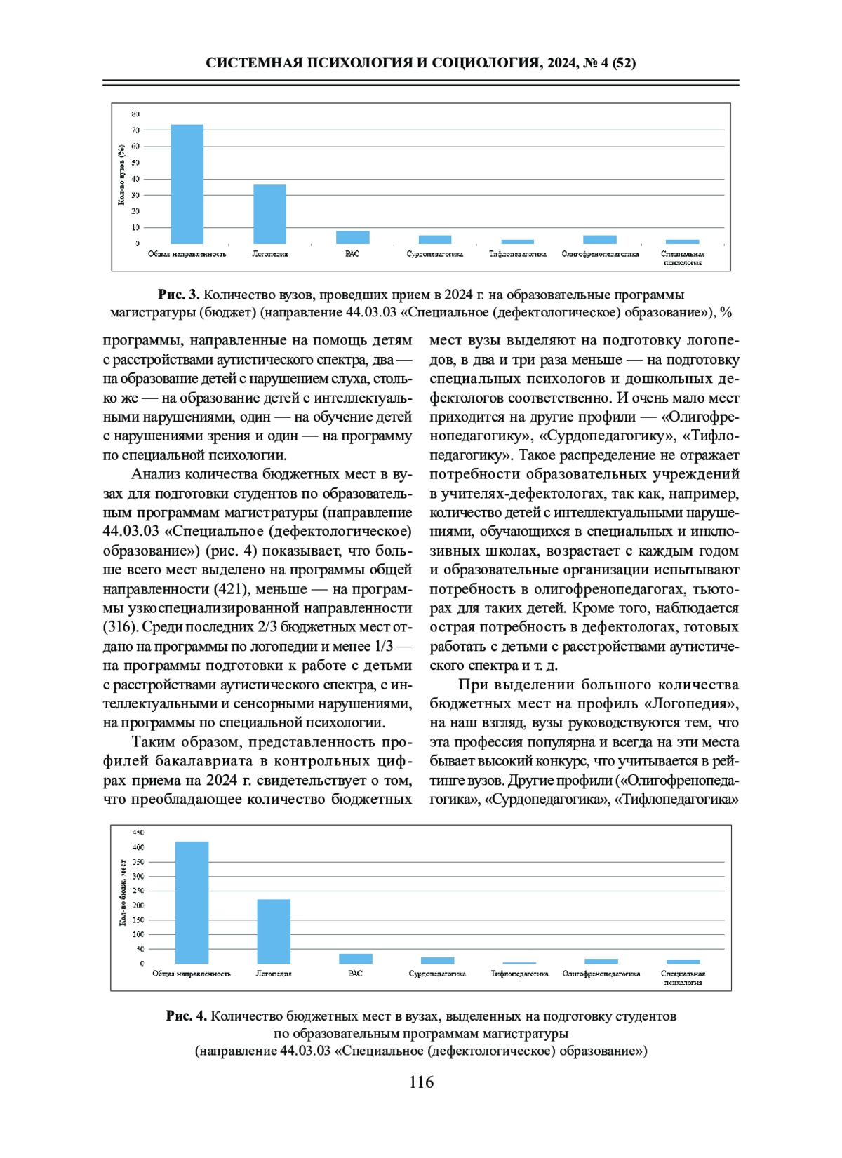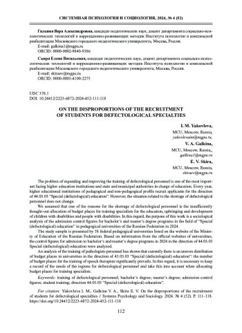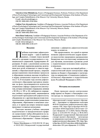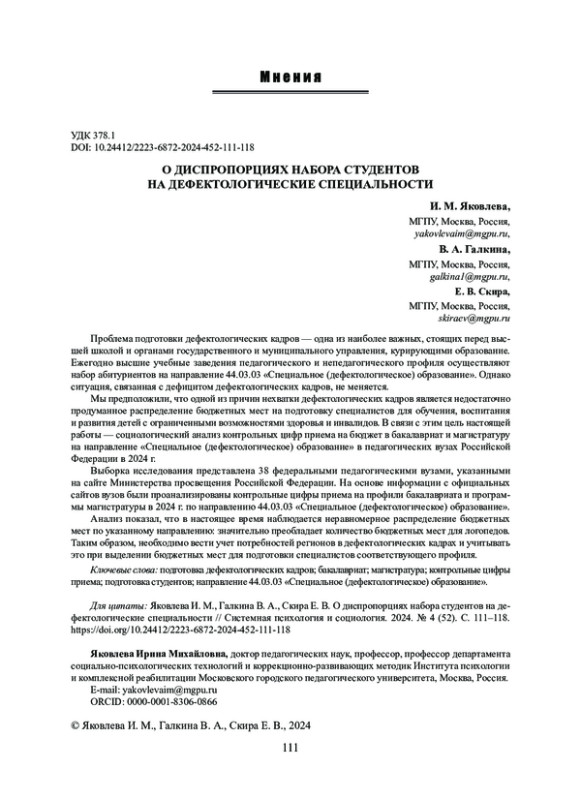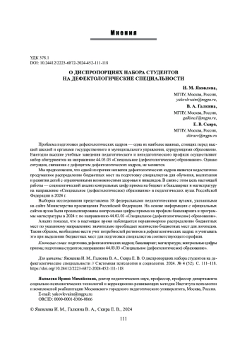 Мы предположили, что одной из причин нехватки дефектологических кадров является недостаточно продуманное распределение бюджетных мест на подготовку специалистов для обучения, воспитания и развития детей с ограниченными возможностями здоровья и инвалидов. В связи с этим цель настоящей работы - социологический анализ контрольных цифр приема на бюджет в бакалавриат и магистратуру на направление «Специальное (дефектологическое) образование» в педагогических вузах Российской Федерации в 2024 г.