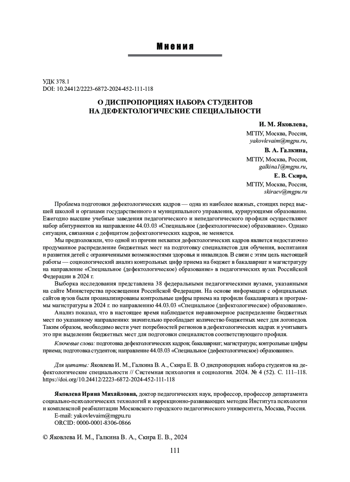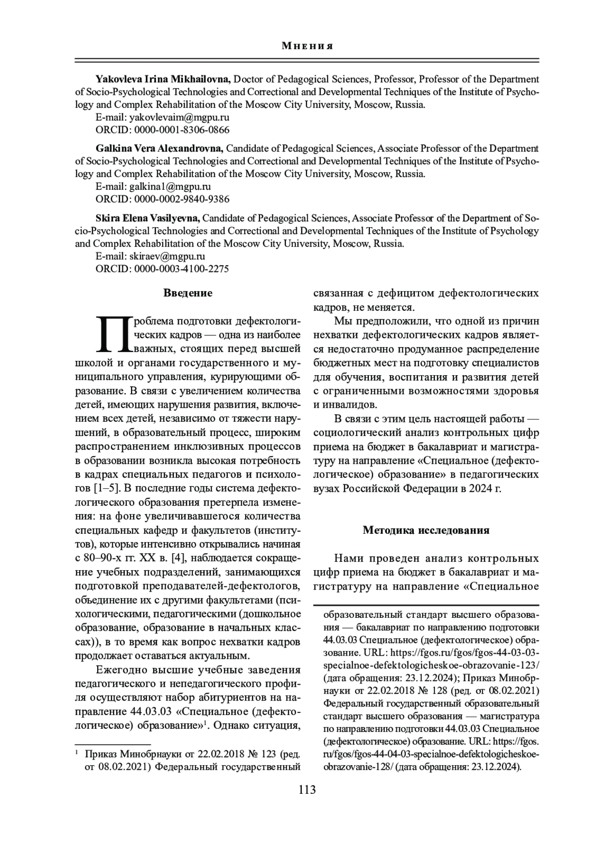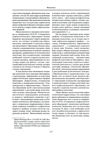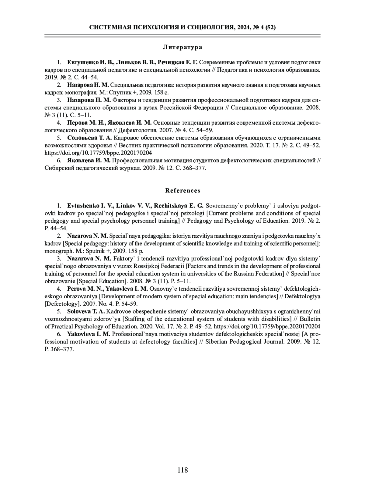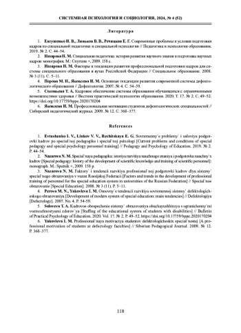 1. Евтушенко И. В., Линьков В. В., Речицкая Е. Г. Современные проблемы и условия подготовки кадров по специальной педагогике и специальной психологии // Педагогика и психология образования. 2019. № 2. С. 44-54. EDN: MAEYWU