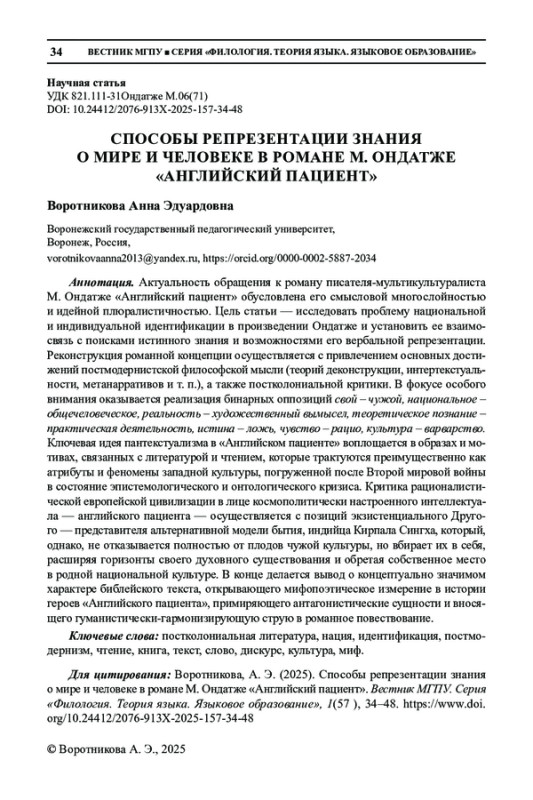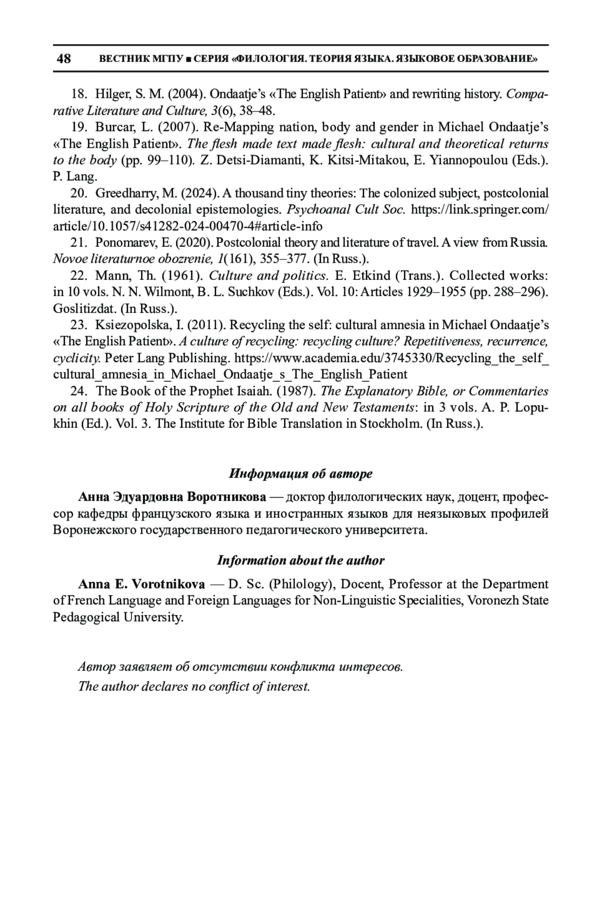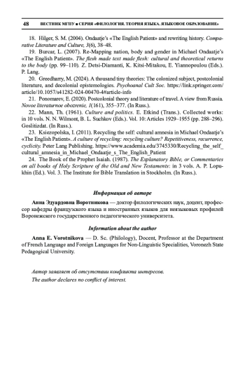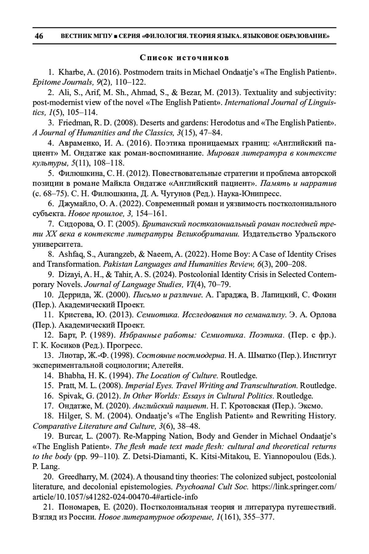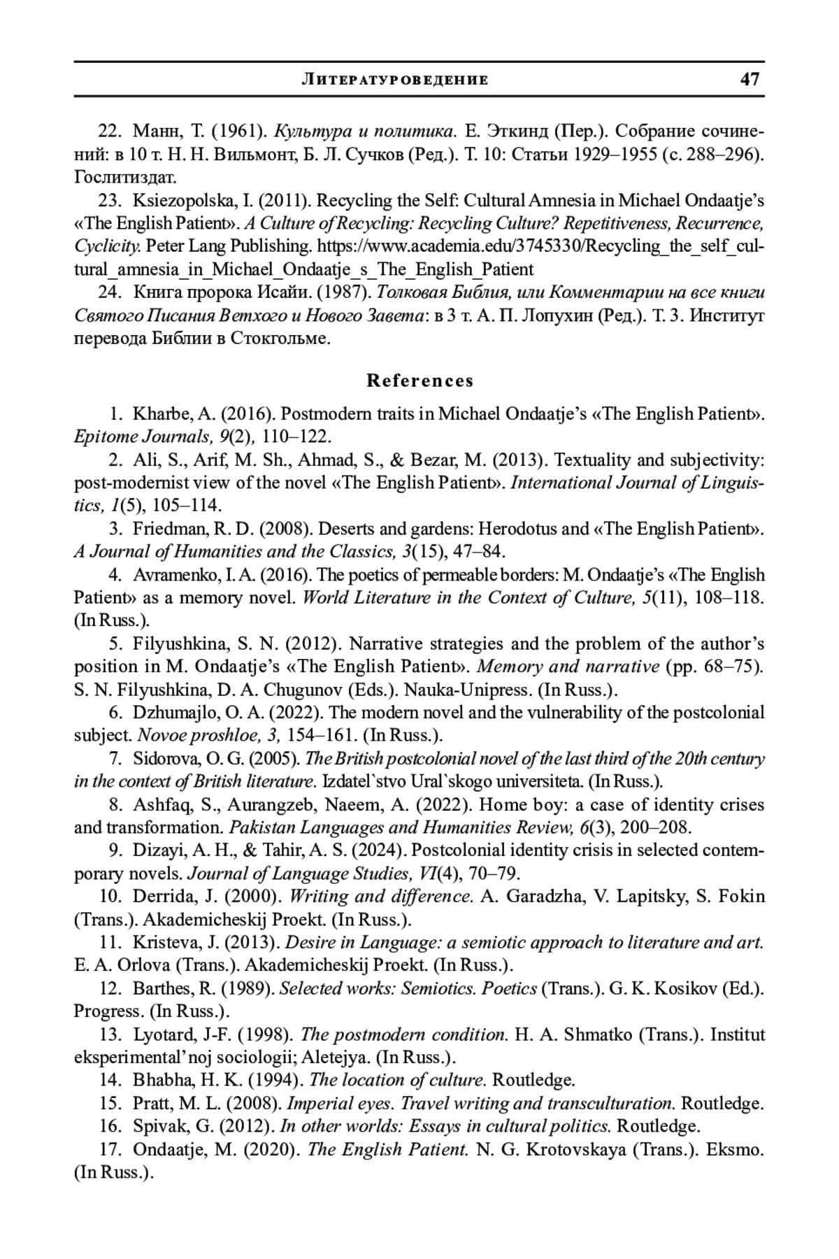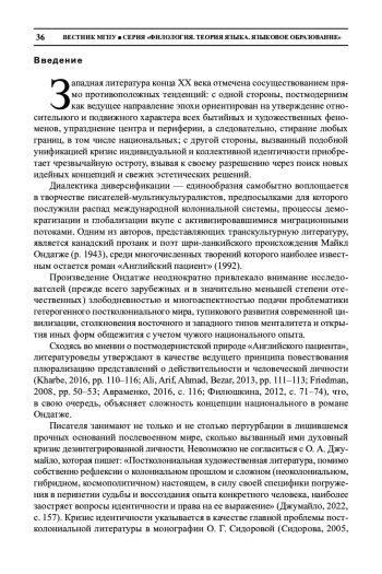 4. Авраменко, И. А. (2016). Поэтика проницаемых границ: “Английский пациент” М. Ондатже как роман-воспоминание. Мировая литература в контексте культуры, 5(11), 108-118. EDN: YISZGN