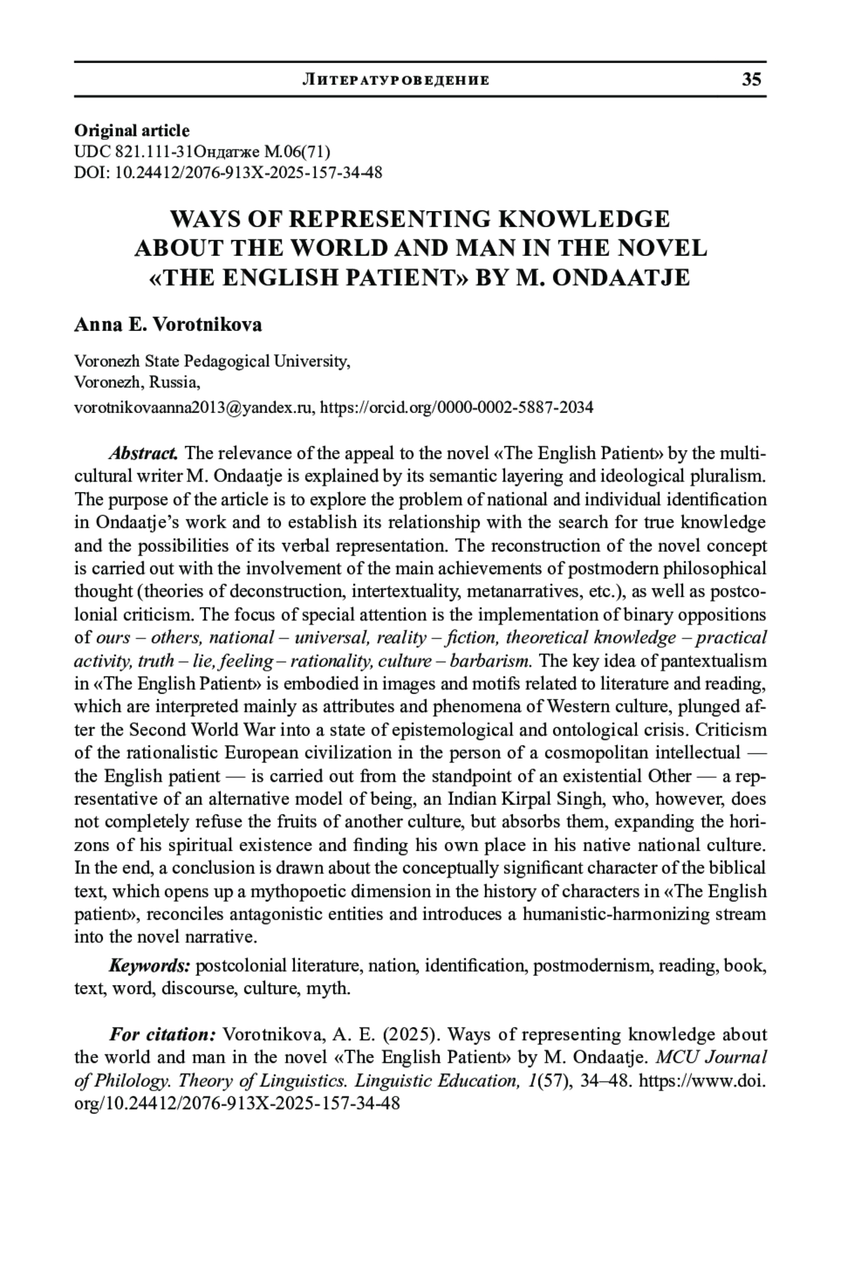 Актуальность обращения к роману писателя-мультикультуралиста М. Ондатже «Английский пациент» обусловлена его смысловой многослойностью и идейной плюралистичностью. Цель статьи - исследовать проблему национальной и индивидуальной идентификации в произведении Ондатже и установить ее взаимосвязь с поисками истинного знания и возможностями его вербальной репрезентации. Реконструкция романной концепции осуществляется с привлечением основных достижений постмодернистской философской мысли (теорий деконструкции, интертекстуальности, метанарративов и т. п.), а также постколониальной критики. В фокусе особого внимания оказывается реализация бинарных оппозиций свой - чужой, национальное -общечеловеческое, реальность - художественный вымысел, теоретическое познание -практическая деятельность, истина - ложь, чувство - рацио, культура - варварство. Ключевая идея пантекстуализма в «Английском пациенте» воплощается в образах и мотивах, связанных с литературой и чтением, которые трактуются преимущественно как атрибуты и феномены западной культуры, погруженной после Второй мировой войны в состояние эпистемологического и онтологического кризиса. Критика рационалистической европейской цивилизации в лице космополитически настроенного интеллектуала - английского пациента - осуществляется с позиций экзистенциального Другого - представителя альтернативной модели бытия, индийца Кирпала Сингха, который, однако, не отказывается полностью от плодов чужой культуры, но вбирает их в себя, расширяя горизонты своего духовного существования и обретая собственное место в родной национальной культуре. В конце делается вывод о концептуально значимом характере библейского текста, открывающего мифопоэтическое измерение в истории героев «Английского пациента», примиряющего антагонистические сущности и вносящего гуманистически-гармонизирующую струю в романное повествование.