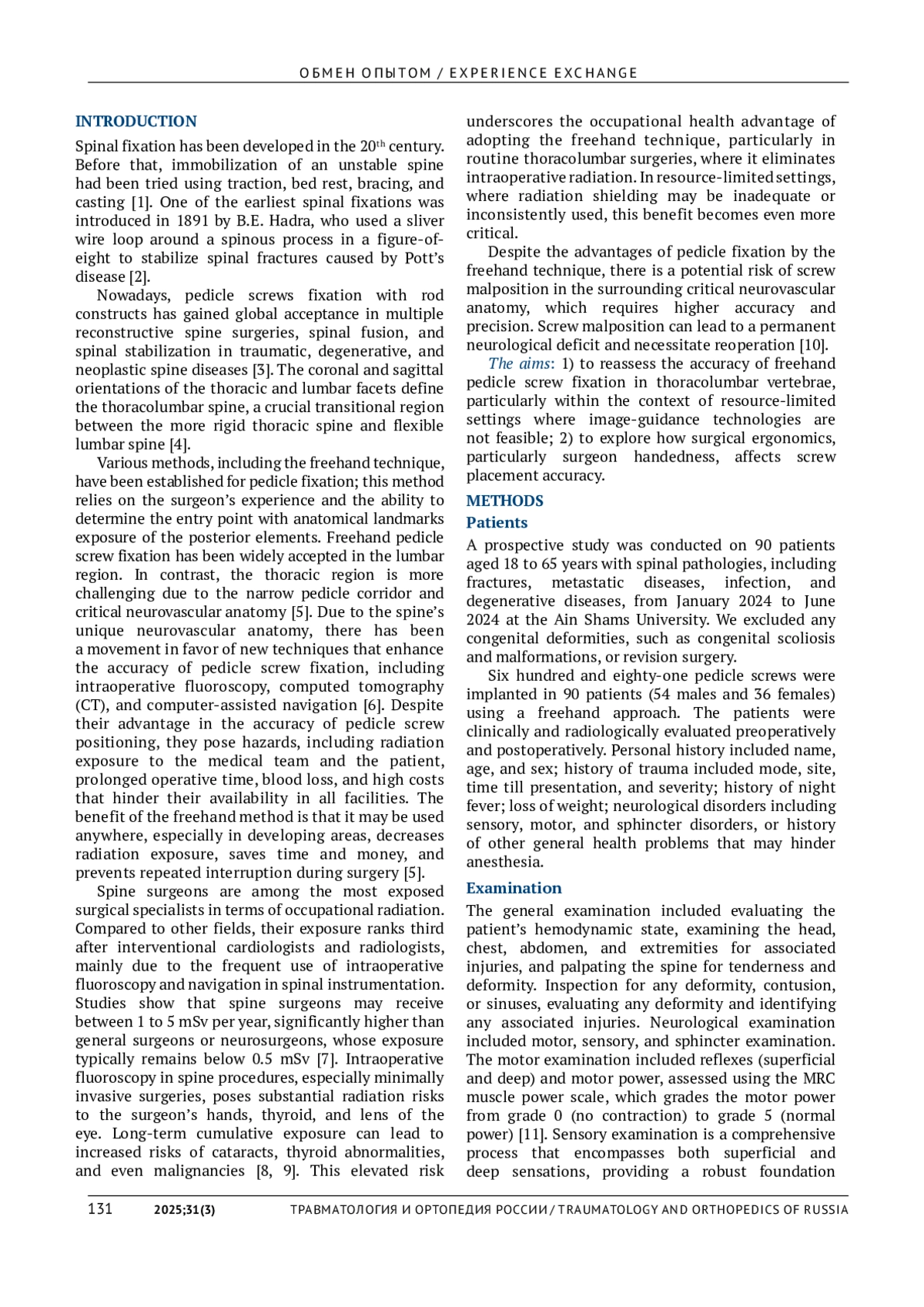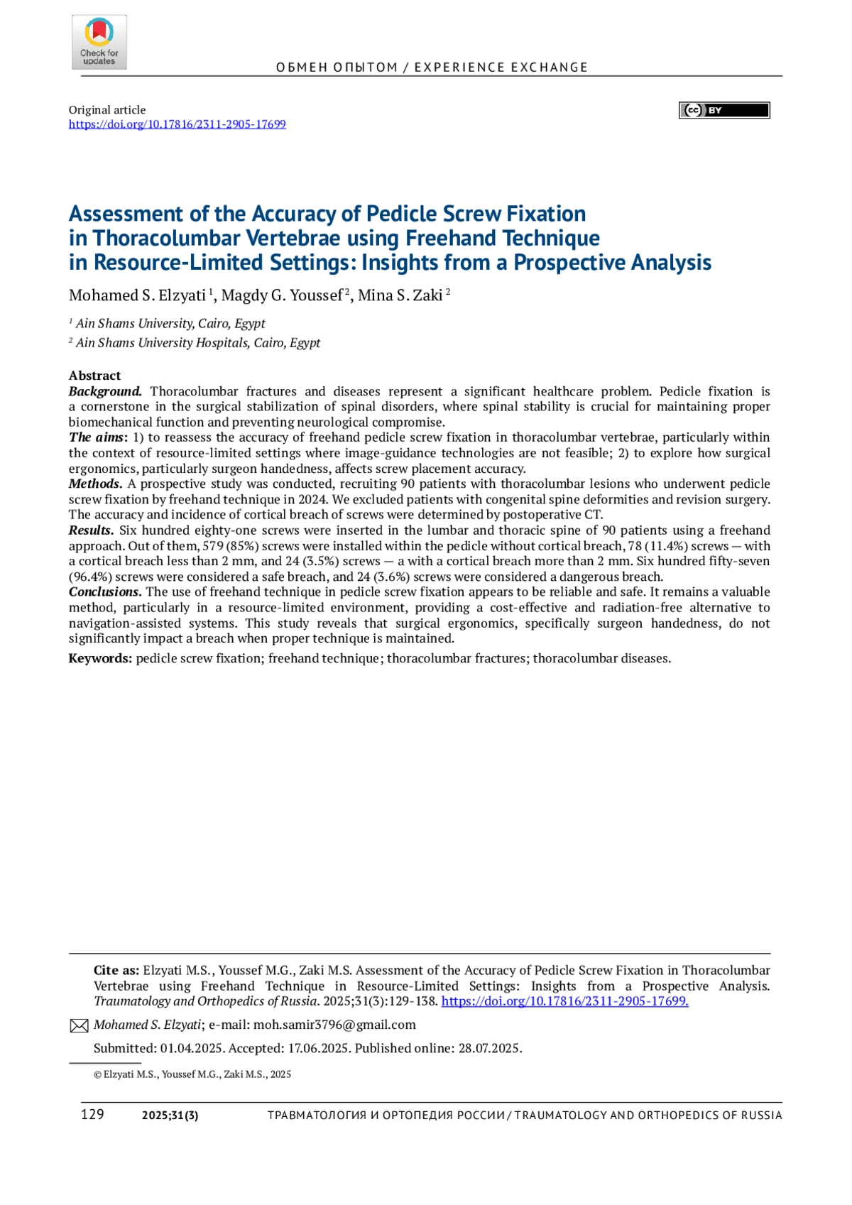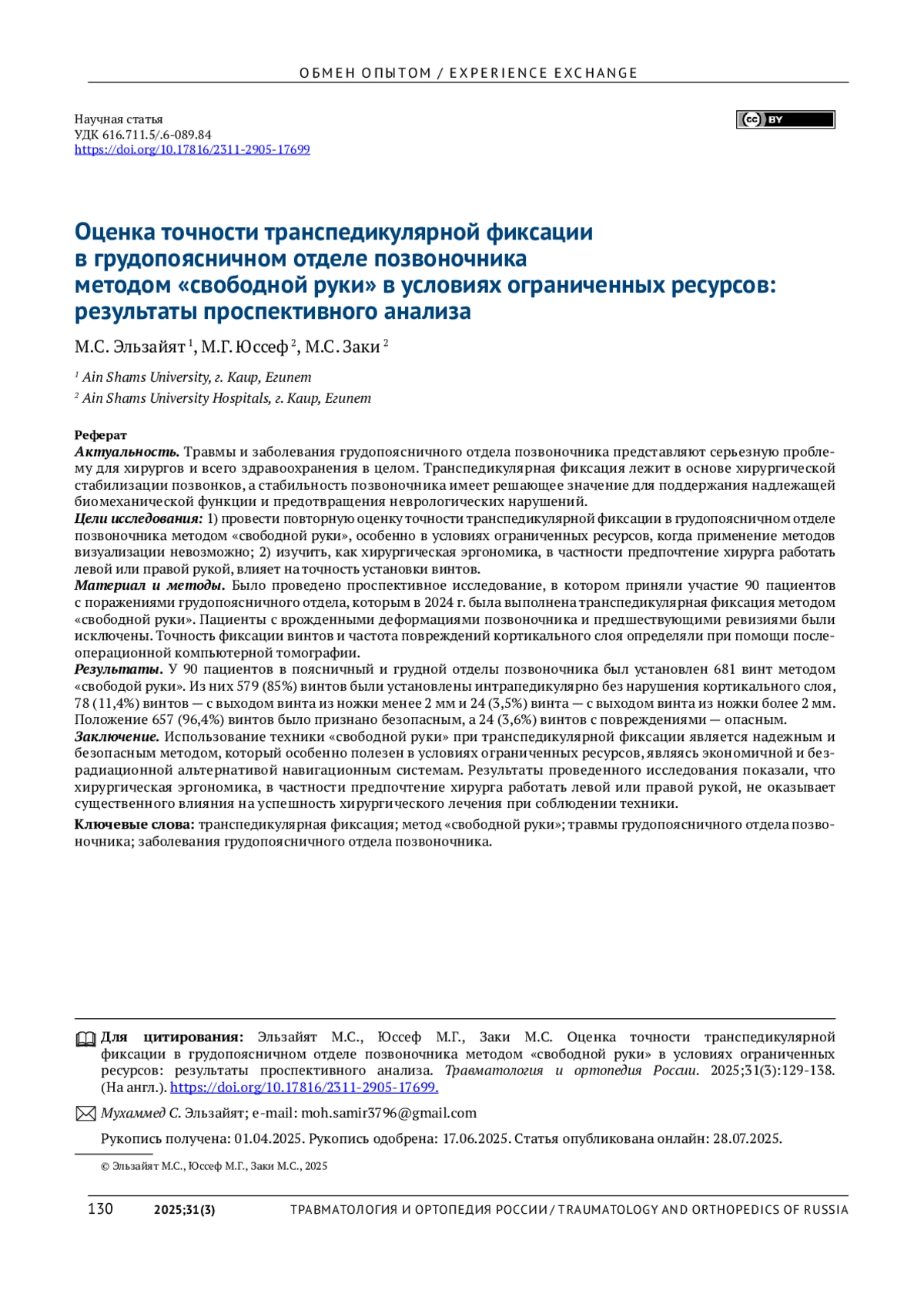 ЭЛЬЗАЙЯТ М. С., ЮССЕФ М. Г., ЗАКИ М. С. ОЦЕНКА ТОЧНОСТИ ТРАНСПЕДИКУЛЯРНОЙ ФИКСАЦИИ В ГРУДОПОЯСНИЧНОМ ОТДЕЛЕ ПОЗВОНОЧНИКА МЕТОДОМ «СВОБОДНОЙ РУКИ» В УСЛОВИЯХ ОГРАНИЧЕННЫХ РЕСУРСОВ: РЕЗУЛЬТАТЫ ПРОСПЕКТИВНОГО АНАЛИЗА // ТРАВМАТОЛОГИЯ И ОРТОПЕДИЯ РОССИИ. 2025. № 3, ТОМ 31