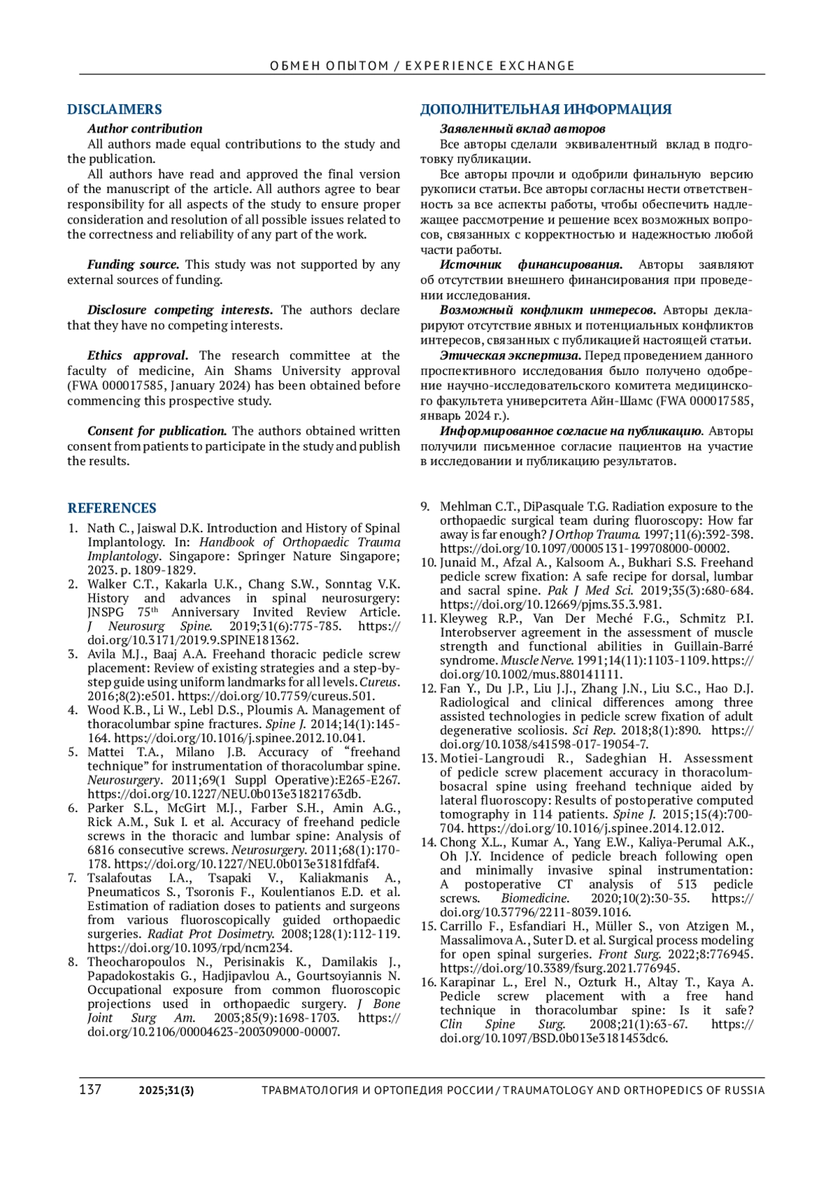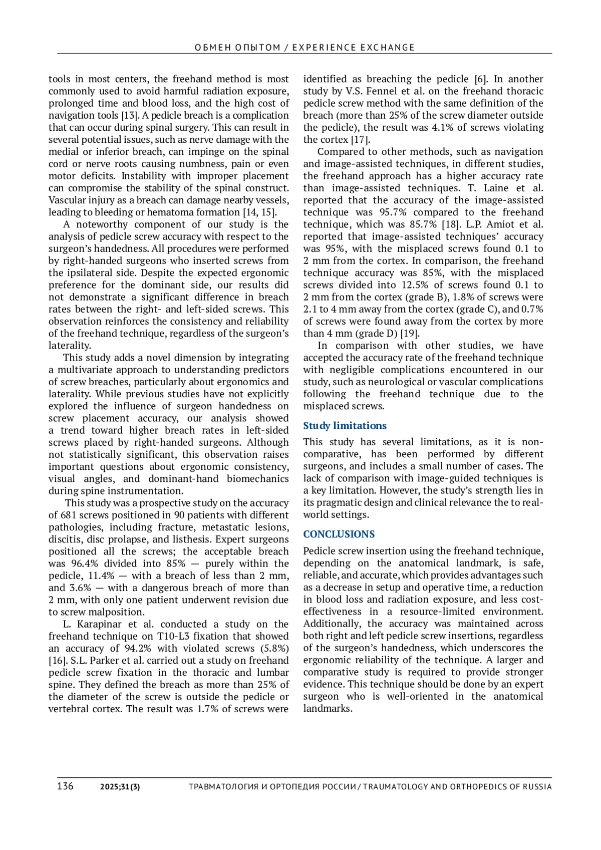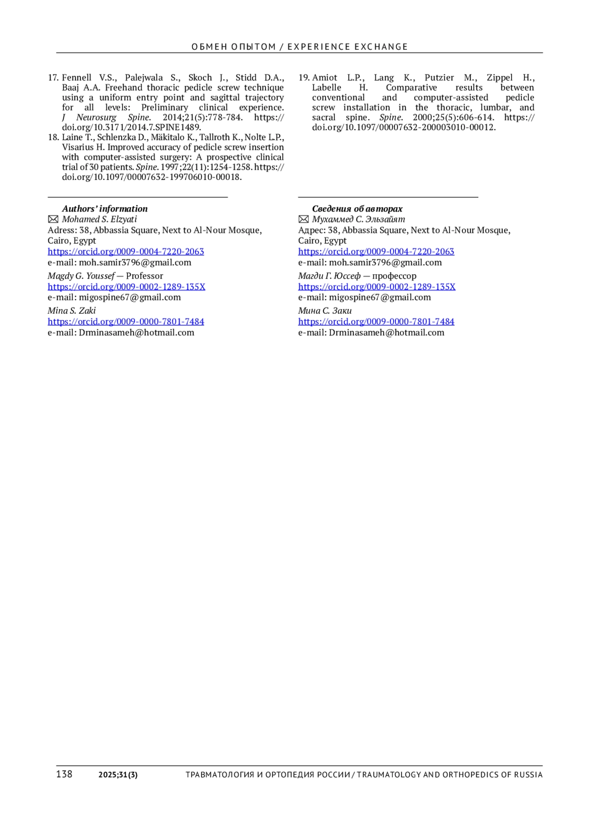 ЭЛЬЗАЙЯТ М. С., ЮССЕФ М. Г., ЗАКИ М. С. ОЦЕНКА ТОЧНОСТИ ТРАНСПЕДИКУЛЯРНОЙ ФИКСАЦИИ В ГРУДОПОЯСНИЧНОМ ОТДЕЛЕ ПОЗВОНОЧНИКА МЕТОДОМ «СВОБОДНОЙ РУКИ» В УСЛОВИЯХ ОГРАНИЧЕННЫХ РЕСУРСОВ: РЕЗУЛЬТАТЫ ПРОСПЕКТИВНОГО АНАЛИЗА // ТРАВМАТОЛОГИЯ И ОРТОПЕДИЯ РОССИИ. 2025. № 3, ТОМ 31