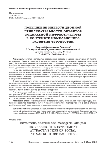 В статье исследуются современные подходы к оценке инвестиционной привлекательности объектов социальной инфраструктуры в рамках комплексного развития территорий (КРТ). Анализируются ключевые экономические, социальные и регуляторные факторы, влияющие на принятие инвестиционных решений, включая финансовую эффективность, социальную значимость, демографические тенденции и государственную поддержку.
