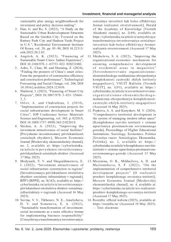 11. Шишелова С. А. Совершенствование организационно- экономического механизма обеспечения комплексности застройки жилых территорий мегаполисов [Электронный ресурс] // Вестник ВГУИТ. - 2022. - № 1(91). - URL: https://cyberleninka.ru/article/n/sovershenstvovanie-organizatsionnoekonomicheskogo-mehanizma-obespecheniya-kompleksnosti-zastroyki-zhilyh-territoriy-megapolisov (дата обращения: 16.05.2025).