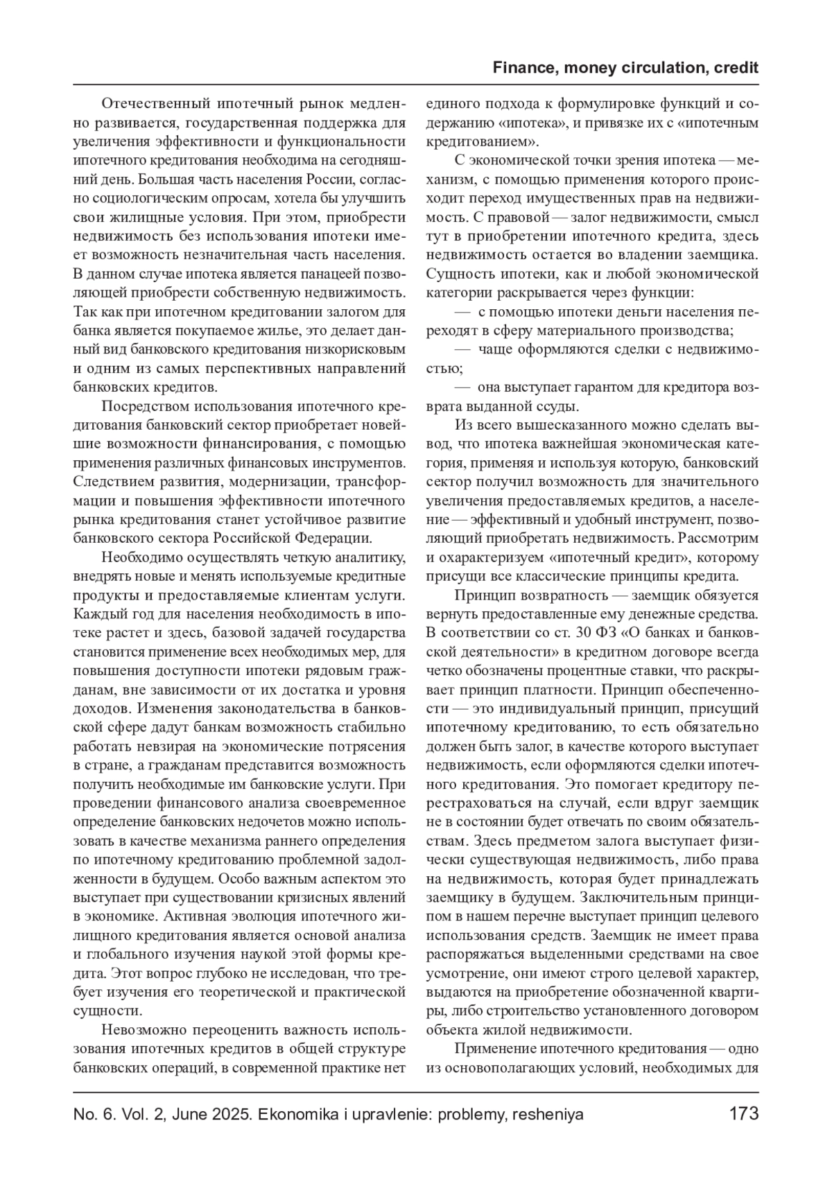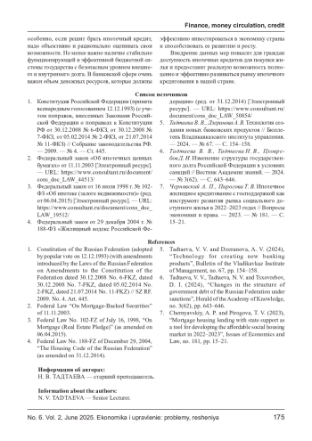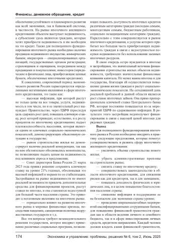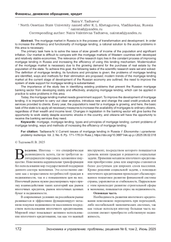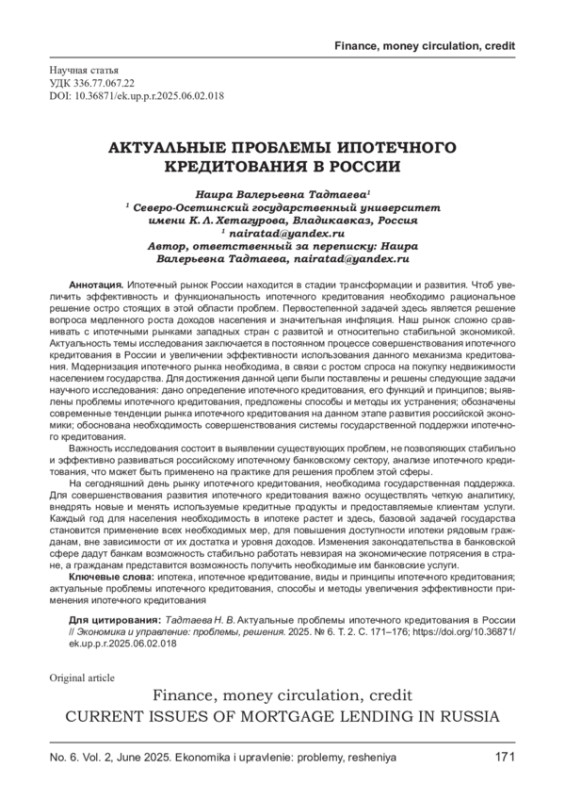 ТАДТАЕВА Н. В. АКТУАЛЬНЫЕ ПРОБЛЕМЫ ИПОТЕЧНОГО КРЕДИТОВАНИЯ В РОССИИ // ЭКОНОМИКА И УПРАВЛЕНИЕ: ПРОБЛЕМЫ, РЕШЕНИЯ. 2025. ТОМ 2 № 6