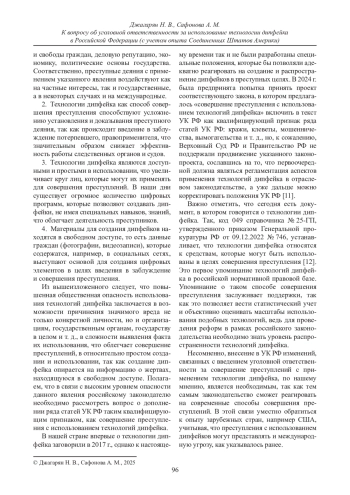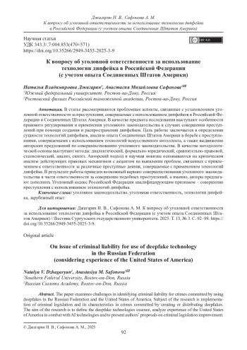 Статья: К вопросу об уголовной ответственности за использование технологии дипфейка в Российской Федерации (с учетом опыта Соединенных Штатов Америки) (2025)