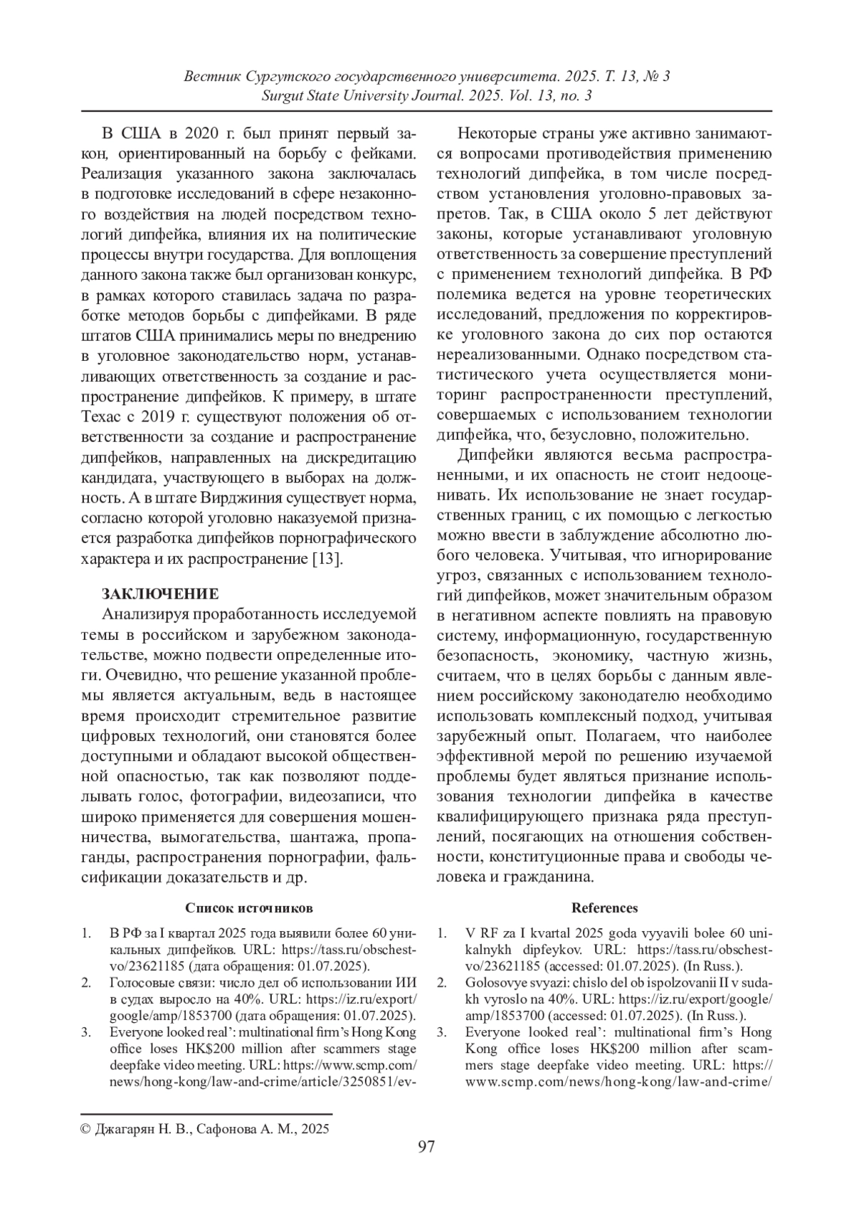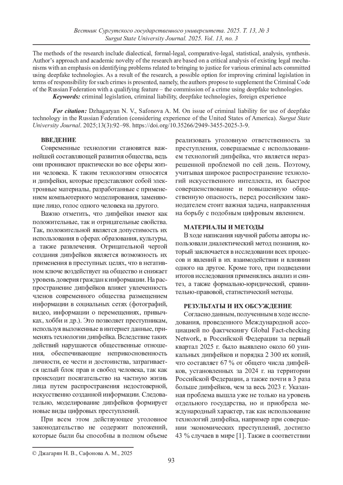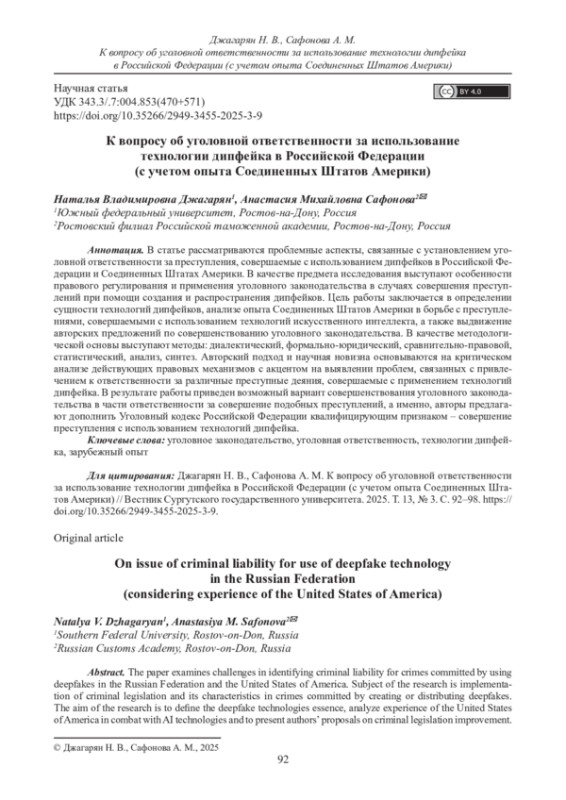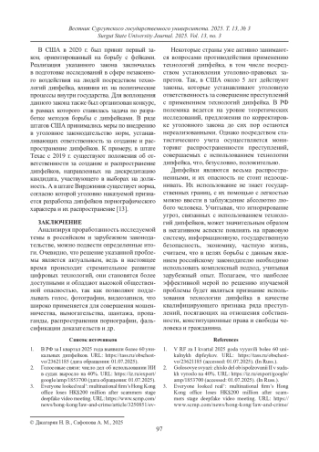 ДЖАГАРЯН Н. В., САФОНОВА А. М. К ВОПРОСУ ОБ УГОЛОВНОЙ ОТВЕТСТВЕННОСТИ ЗА ИСПОЛЬЗОВАНИЕ ТЕХНОЛОГИИ ДИПФЕЙКА В РОССИЙСКОЙ ФЕДЕРАЦИИ (С УЧЕТОМ ОПЫТА СОЕДИНЕННЫХ ШТАТОВ АМЕРИКИ) // ВЕСТНИК СУРГУТСКОГО ГОСУДАРСТВЕННОГО УНИВЕРСИТЕТА. 2025. ТОМ 13, № 1