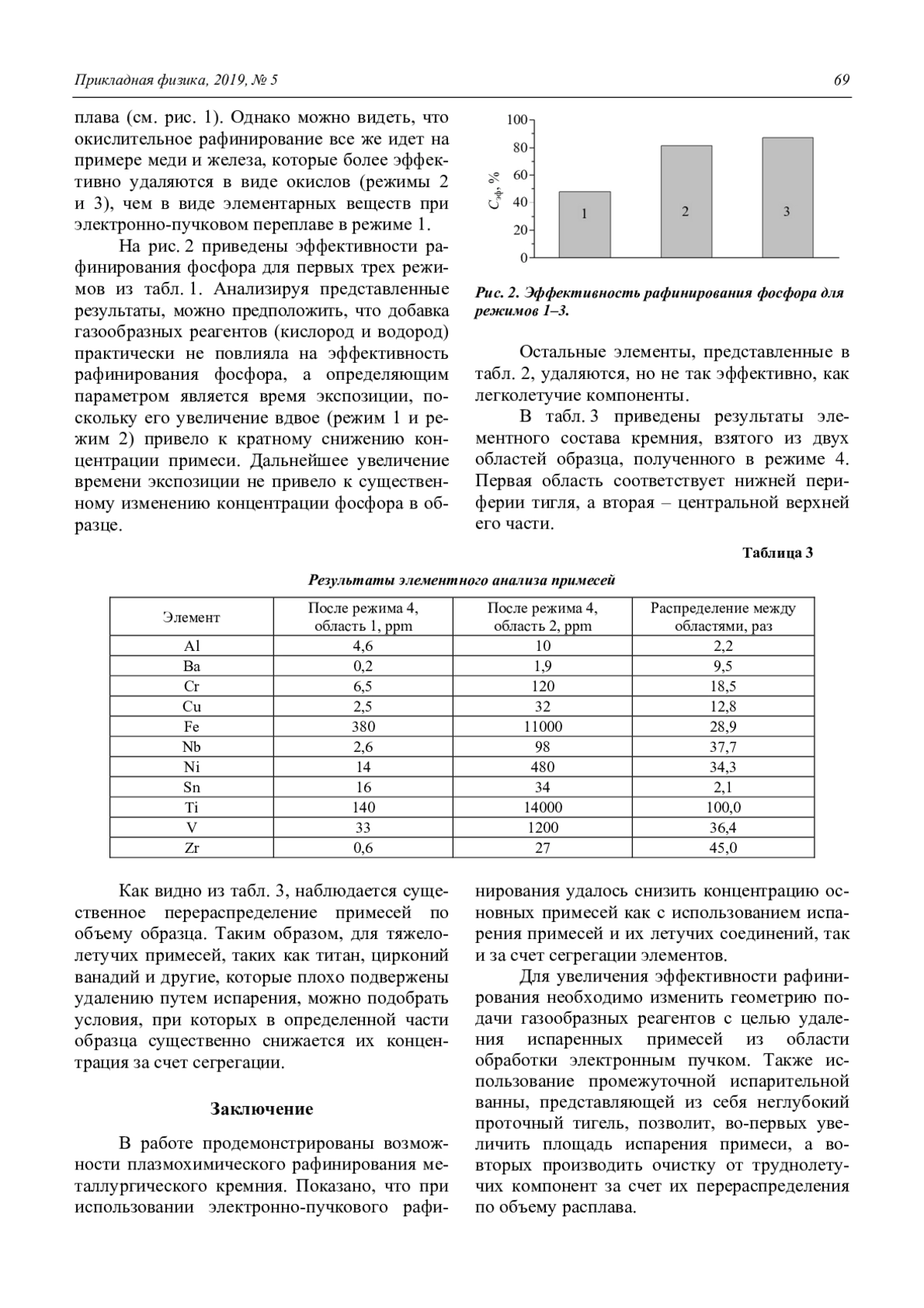 Разработано устройство для рафинирования металлургического кремния в плазме электронного пучка в сверхзвуковом потоке газа. Представлено описание и демонстрация возможностей электронно-пучкового метода и плазмы на его основе для удаления примесей из металлургического кремния в условиях формакуумного диапазона давлений. На лабораторном оборудовании получены образцы кремния в вариантах окислительного и безокислительного рафинирования. Показано, что при электроннопучковом переплаве происходит разделение металлических примесей по объему образца. Во всех режимах рафинирования зафиксировано заметное удаление фосфора.