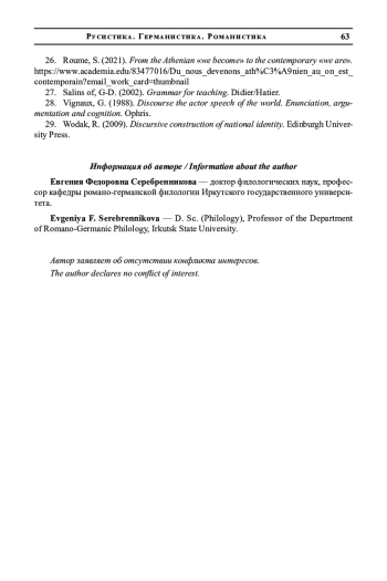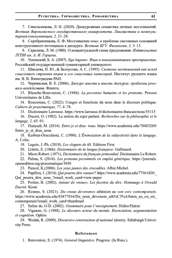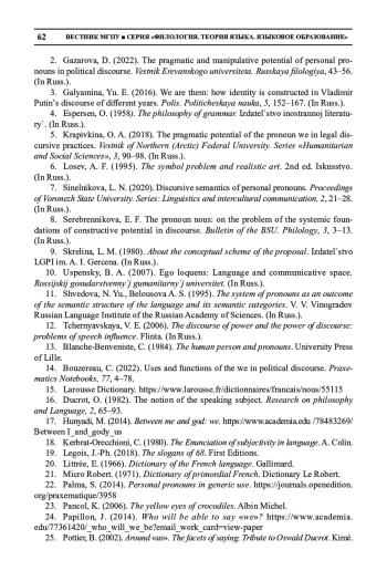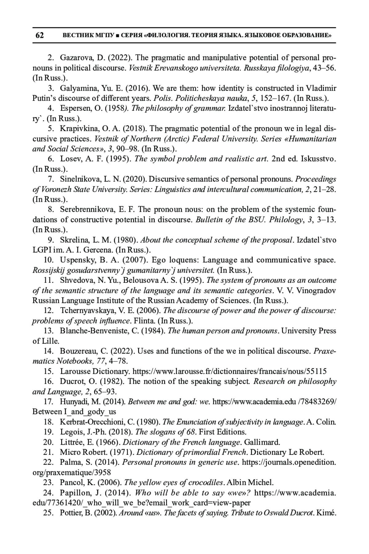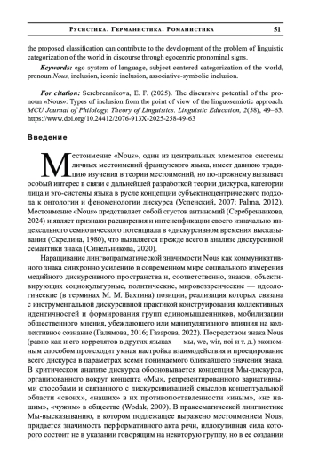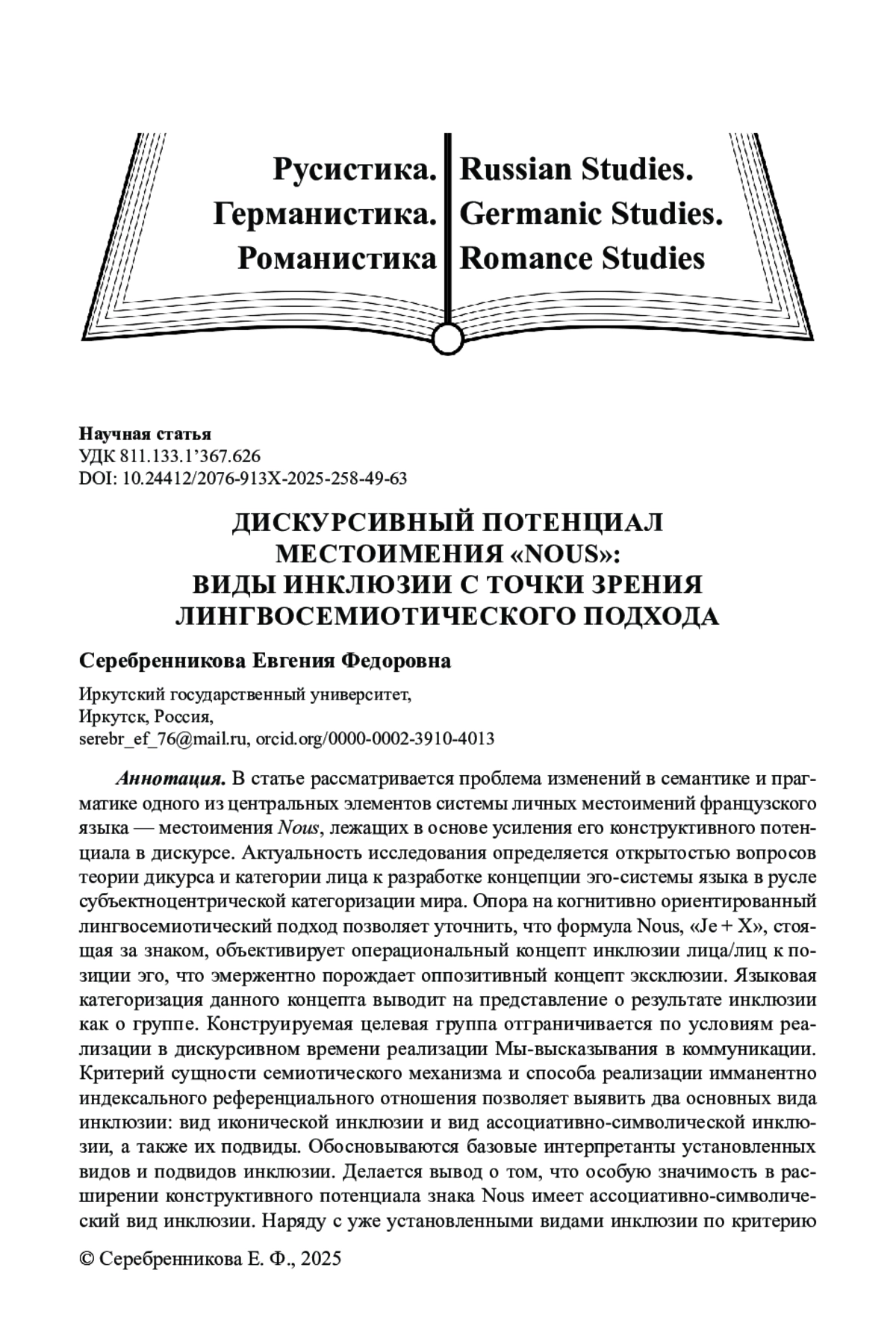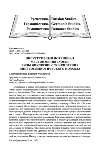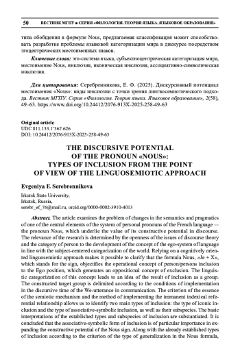 Статья: ДИСКУРСИВНЫЙ ПОТЕНЦИАЛ МЕСТОИМЕНИЯ «NOUS»: ВИДЫ ИНКЛЮЗИИ С ТОЧКИ ЗРЕНИЯ ЛИНГВОСЕМИОТИЧЕСКОГО ПОДХОДА (2025)