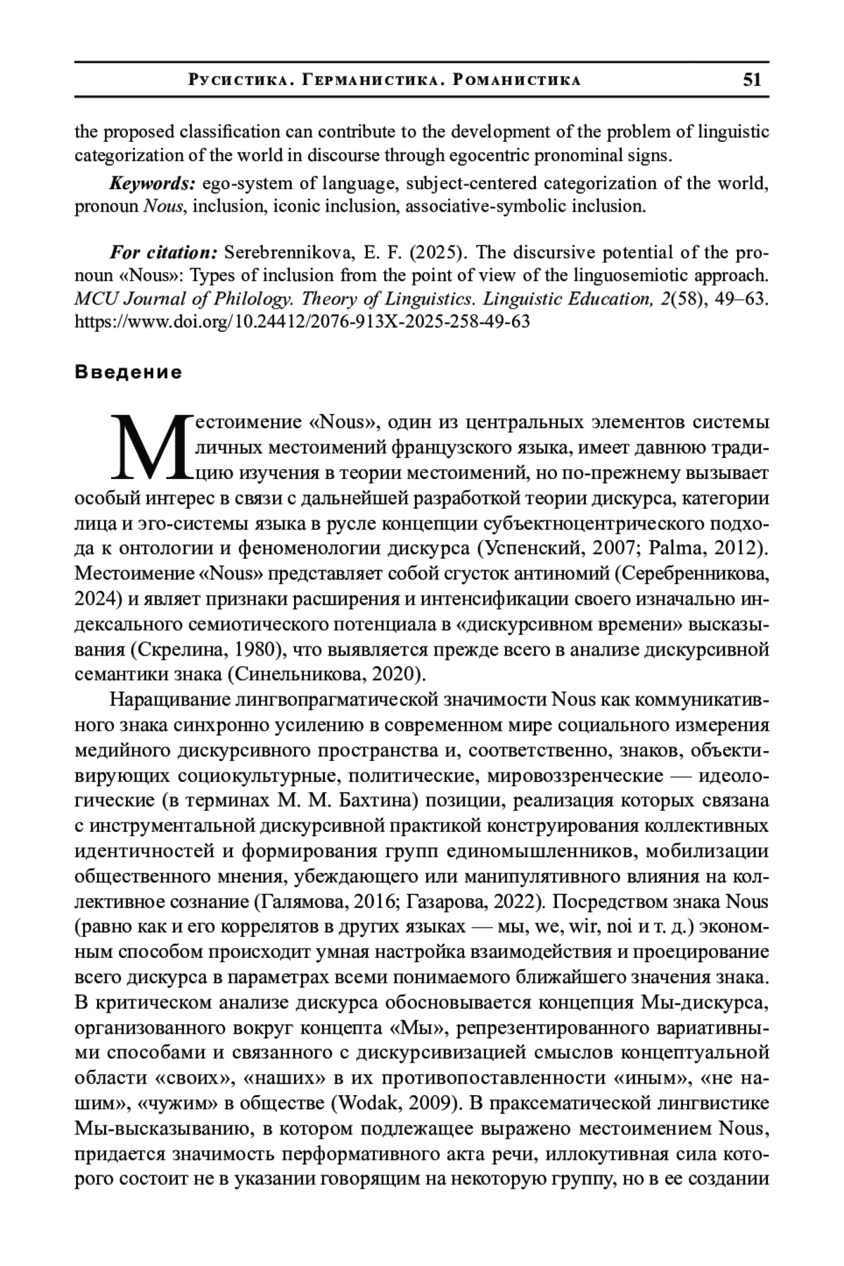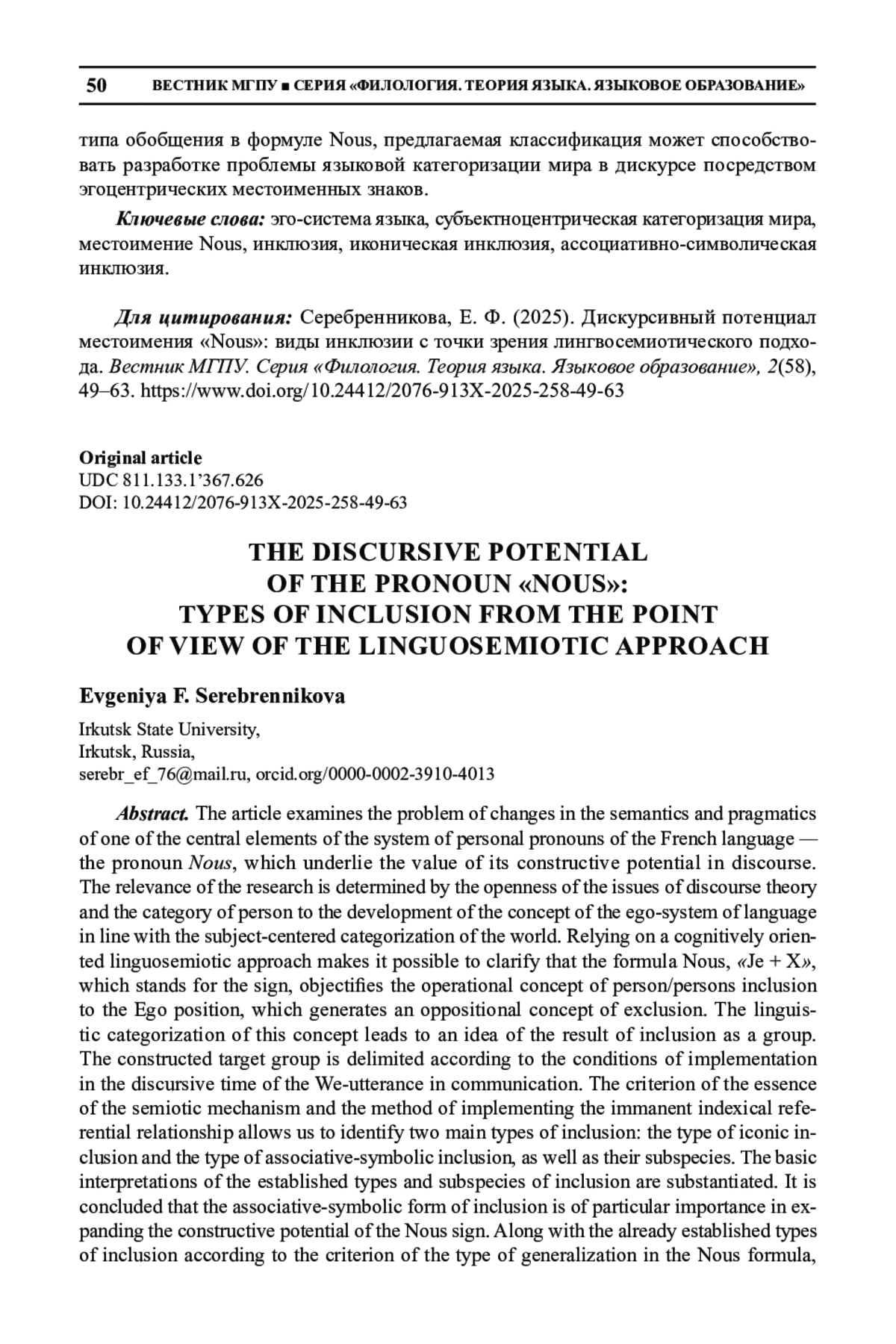 СЕРЕБРЕННИКОВА Е. Ф. ДИСКУРСИВНЫЙ ПОТЕНЦИАЛ МЕСТОИМЕНИЯ «NOUS»: ВИДЫ ИНКЛЮЗИИ С ТОЧКИ ЗРЕНИЯ ЛИНГВОСЕМИОТИЧЕСКОГО ПОДХОДА // ВЕСТНИК МГПУ. СЕРИЯ: ФИЛОЛОГИЯ. ТЕОРИЯ ЯЗЫКА. ЯЗЫКОВОЕ ОБРАЗОВАНИЕ. 2025. № 2 (58)