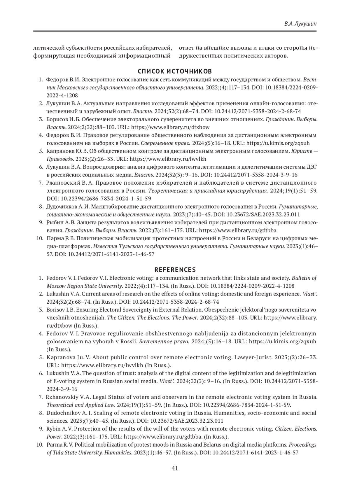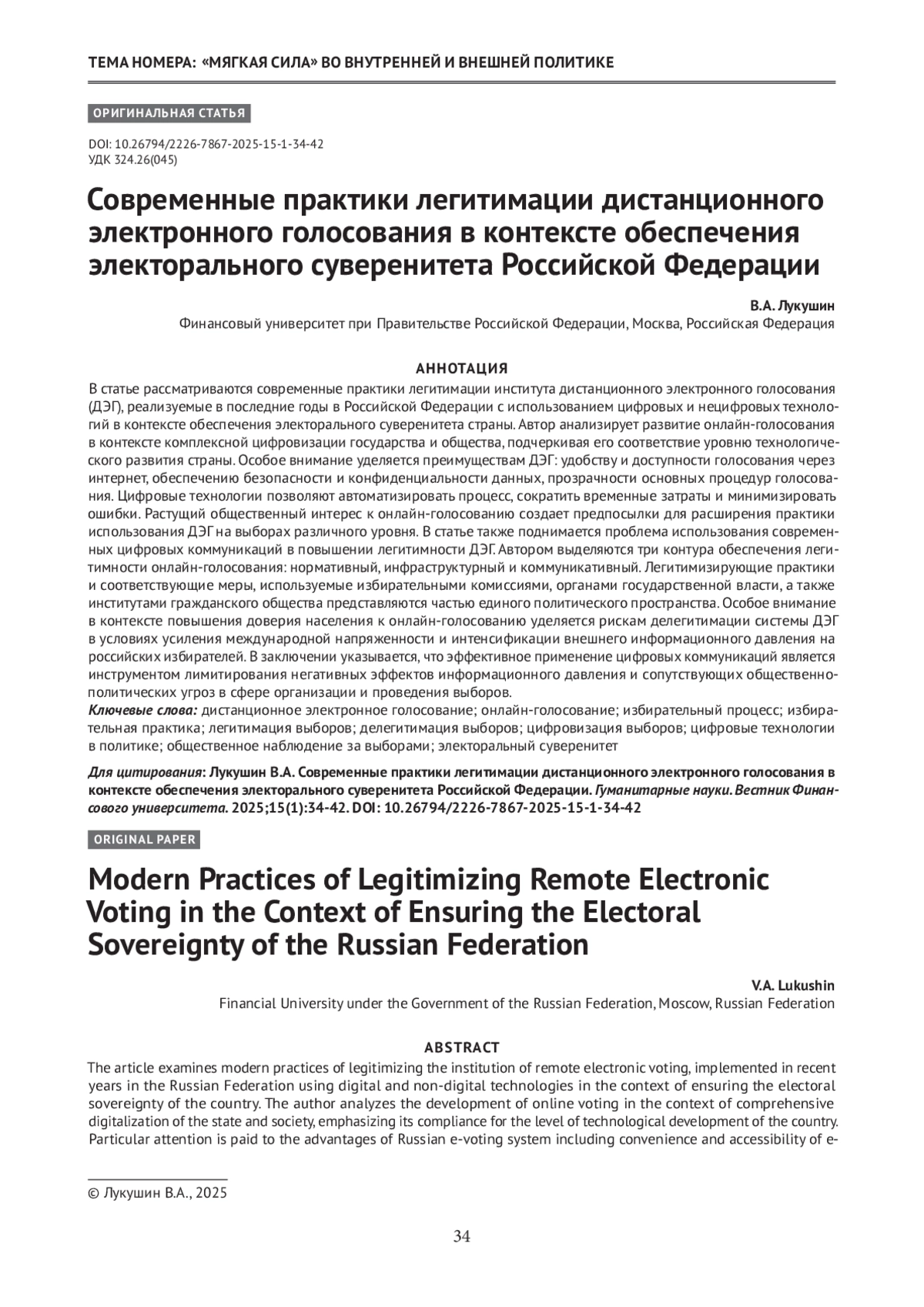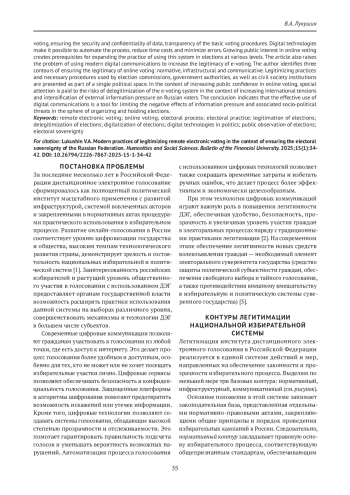 ЛУКУШИН В. А. СОВРЕМЕННЫЕ ПРАКТИКИ ЛЕГИТИМАЦИИ ДИСТАНЦИОННОГО ЭЛЕКТРОННОГО ГОЛОСОВАНИЯ В КОНТЕКСТЕ ОБЕСПЕЧЕНИЯ ЭЛЕКТОРАЛЬНОГО СУВЕРЕНИТЕТА РОССИЙСКОЙ ФЕДЕРАЦИИ // ГУМАНИТАРНЫЕ НАУКИ. ВЕСТНИК ФИНАНСОВОГО УНИВЕРСИТЕТА. 2025. ТОМ 15, № 1