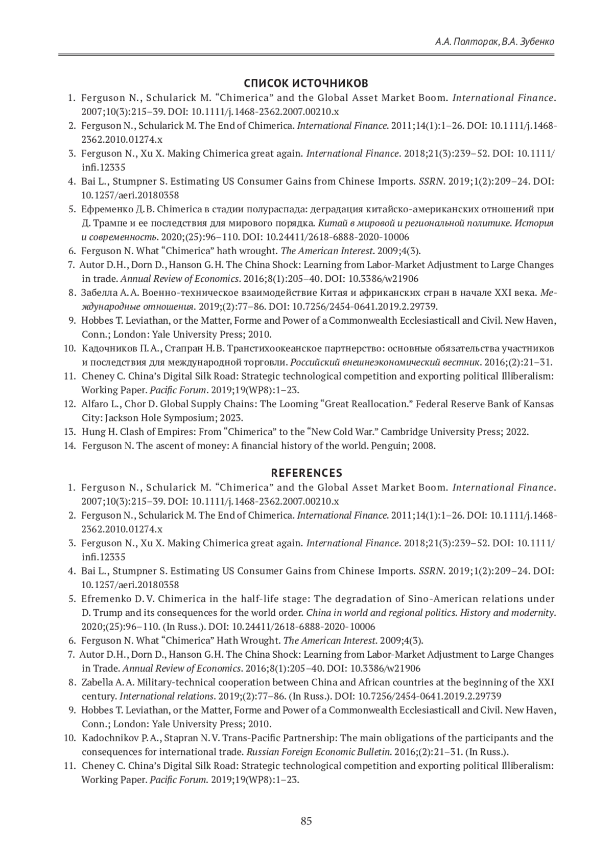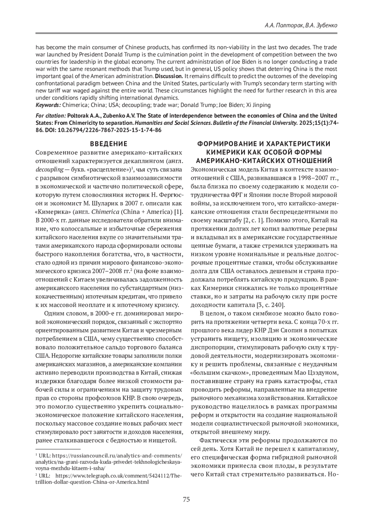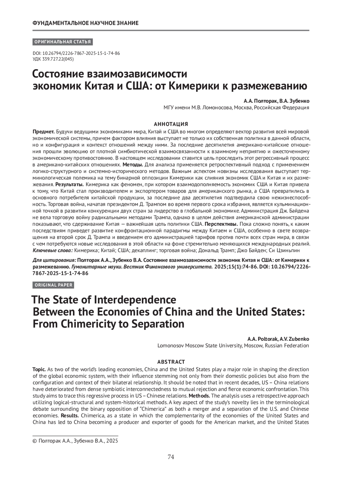 ПОЛТОРАК А. А., ЗУБЕНКО В. А. СОСТОЯНИЕ ВЗАИМОЗАВИСИМОСТИ ЭКОНОМИК КИТАЯ И США: ОТ КИМЕРИКИ К РАЗМЕЖЕВАНИЮ // ГУМАНИТАРНЫЕ НАУКИ. ВЕСТНИК ФИНАНСОВОГО УНИВЕРСИТЕТА. 2025. ТОМ 15, № 1