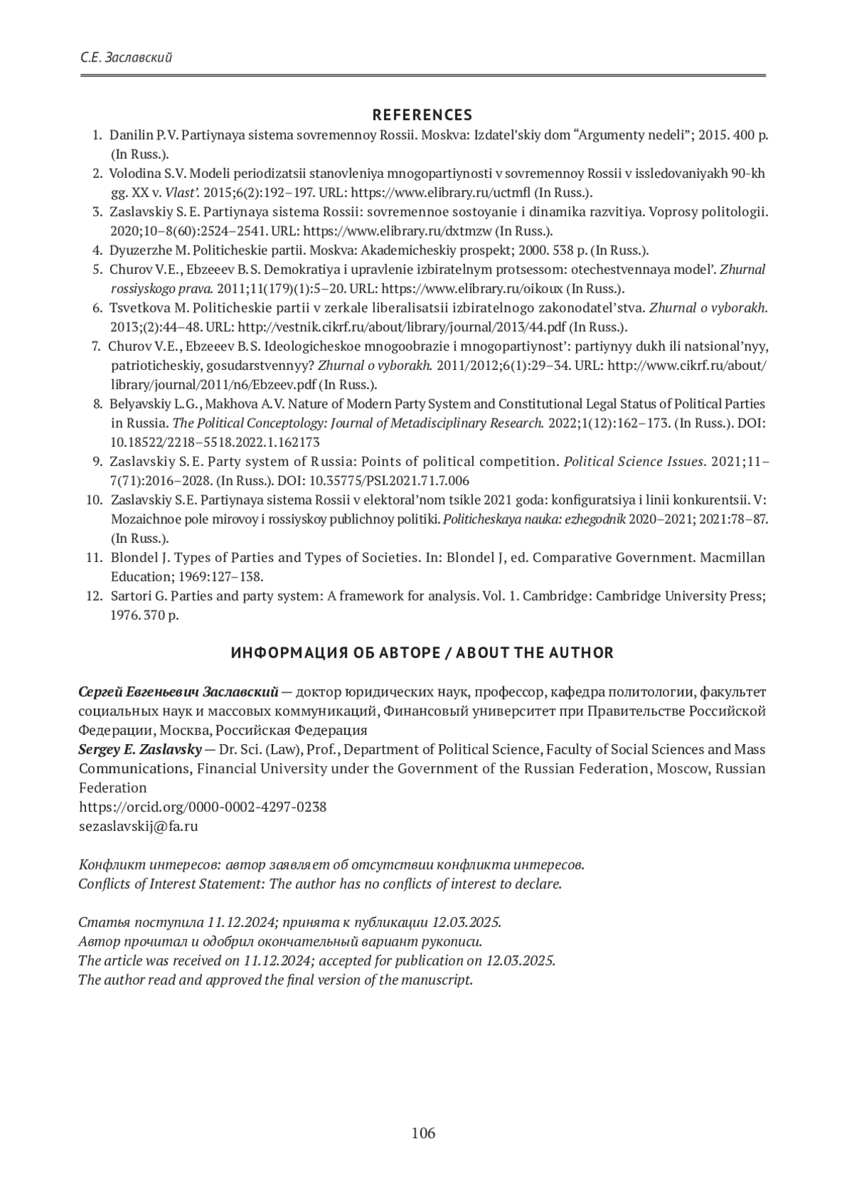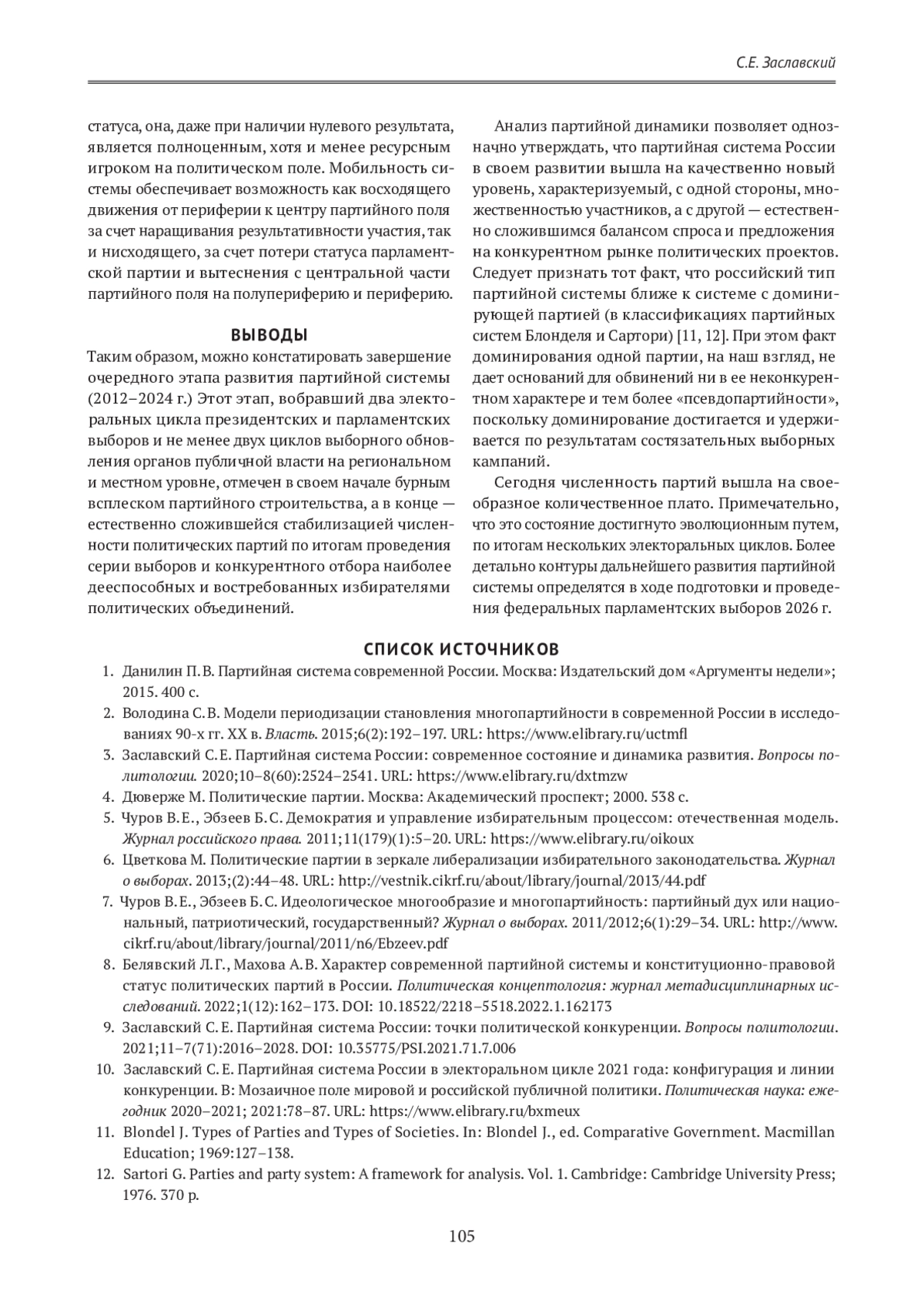 ЗАСЛАВСКИЙ С. Е. ИНСТИТУЦИОНАЛЬНЫЕ ПАРАМЕТРЫ КАК ФАКТОР КОЛИЧЕСТВЕННОЙ ДИНАМИКИ РОССИЙСКОЙ ПАРТИЙНОЙ СИСТЕМЫ В 2012–2024 ГОДАХ // ГУМАНИТАРНЫЕ НАУКИ. ВЕСТНИК ФИНАНСОВОГО УНИВЕРСИТЕТА. 2025. ТОМ 15, № 1