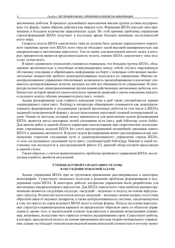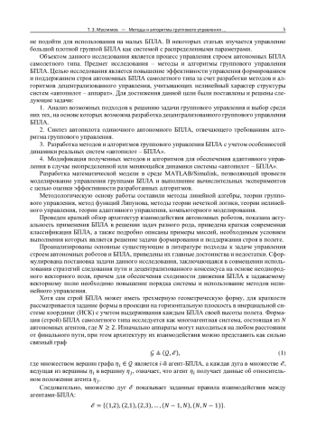 Представлены результаты исследования процесса управления строем автономных беспилотных летательных аппаратов (БПЛА) самолетного типа с целью повышения эффективности управления формированием и поддержанием строя за счет разработки методов и алгоритмов децентрализованного управления, учитывающих нелинейный характер структуры систем «автопилот – аппарат». Для достижения данной цели поставлены и решены следующие задачи: 1. Анализ возможных подходов к решению задачи группового управления и выбор среди них тех, на основе которых возможна разработка децентрализованного группового управления БПЛА. 2. Синтез автопилота одиночного автономного БПЛА, отвечающего требованиям алгоритма группового управления. 3. Разработка методов и алгоритмов группового управления БПЛА с учетом особенностей динамики реальных систем «автопилот – БПЛА». 4. Модификация полученных методов и алгоритмов с целью обеспечения адаптивного управления в случае неопределенной или меняющейся динамики системы «автопилот - БПЛА». 5. Разработка математической модели в среде MATLAB/Simulink, позволяющей провести моделирование управления группами БПЛА и выполнение вычислительных экспериментов с целью оценки эффективности разработанных алгоритмов. Методологическую основу работы составили методы линейной алгебры, теории группового управления, метод функций Ляпунова, методы теории нечеткой логики, теории нелинейного управления, теории адаптивного управления, компьютерного моделирования.