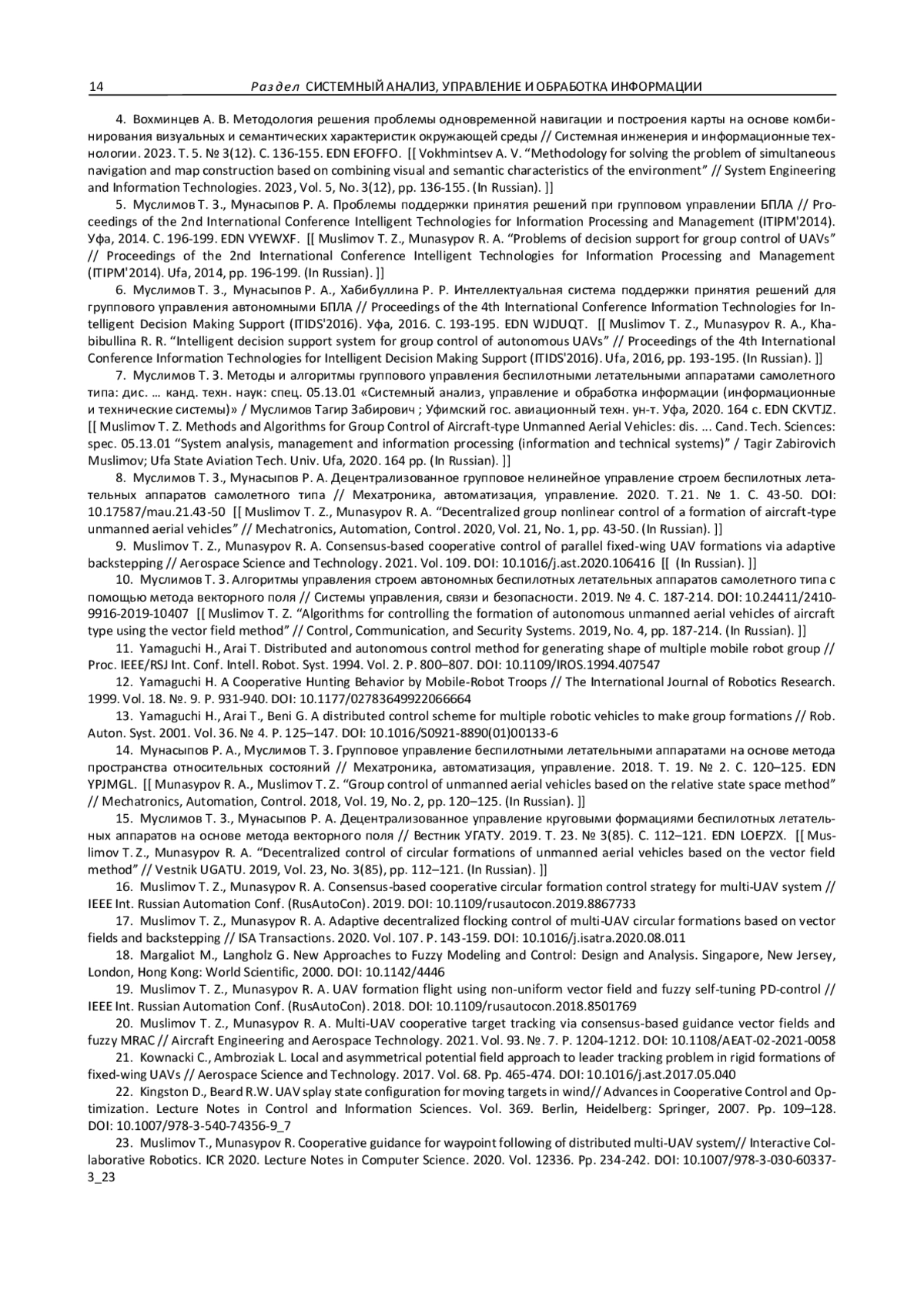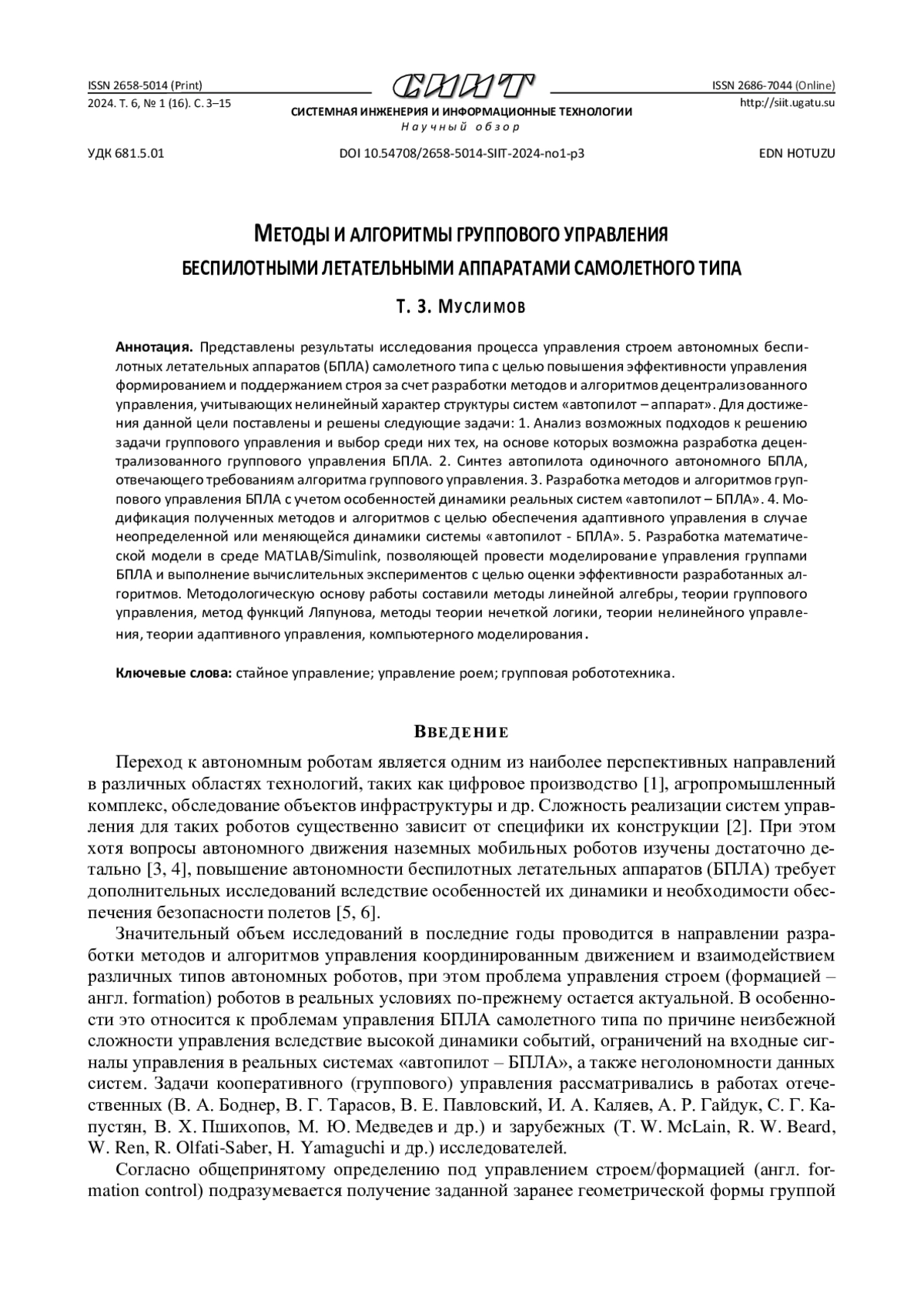 МУСЛИМОВ Т. З. МЕТОДЫ И АЛГОРИТМЫ ГРУППОВОГО УПРАВЛЕНИЯ БЕСПИЛОТНЫМИ ЛЕТАТЕЛЬНЫМИ АППАРАТАМИ САМОЛЕТНОГО ТИПА // СИСТЕМНАЯ ИНЖЕНЕРИЯ И ИНФОРМАЦИОННЫЕ ТЕХНОЛОГИИ. 2024. ТОМ 6, № 1(16)