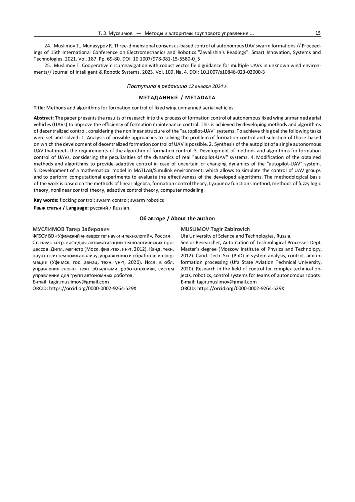 Статья: МЕТОДЫ И АЛГОРИТМЫ ГРУППОВОГО УПРАВЛЕНИЯ БЕСПИЛОТНЫМИ ЛЕТАТЕЛЬНЫМИ АППАРАТАМИ САМОЛЕТНОГО ТИПА (2024)