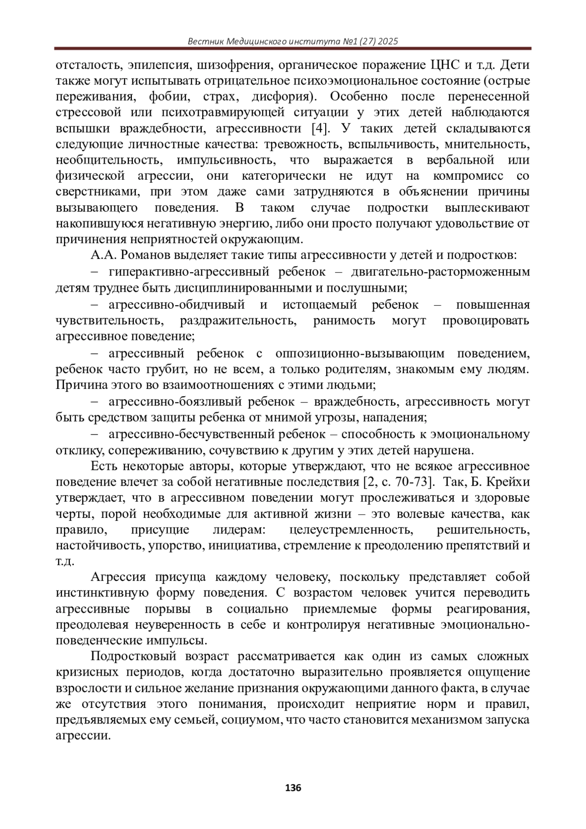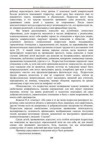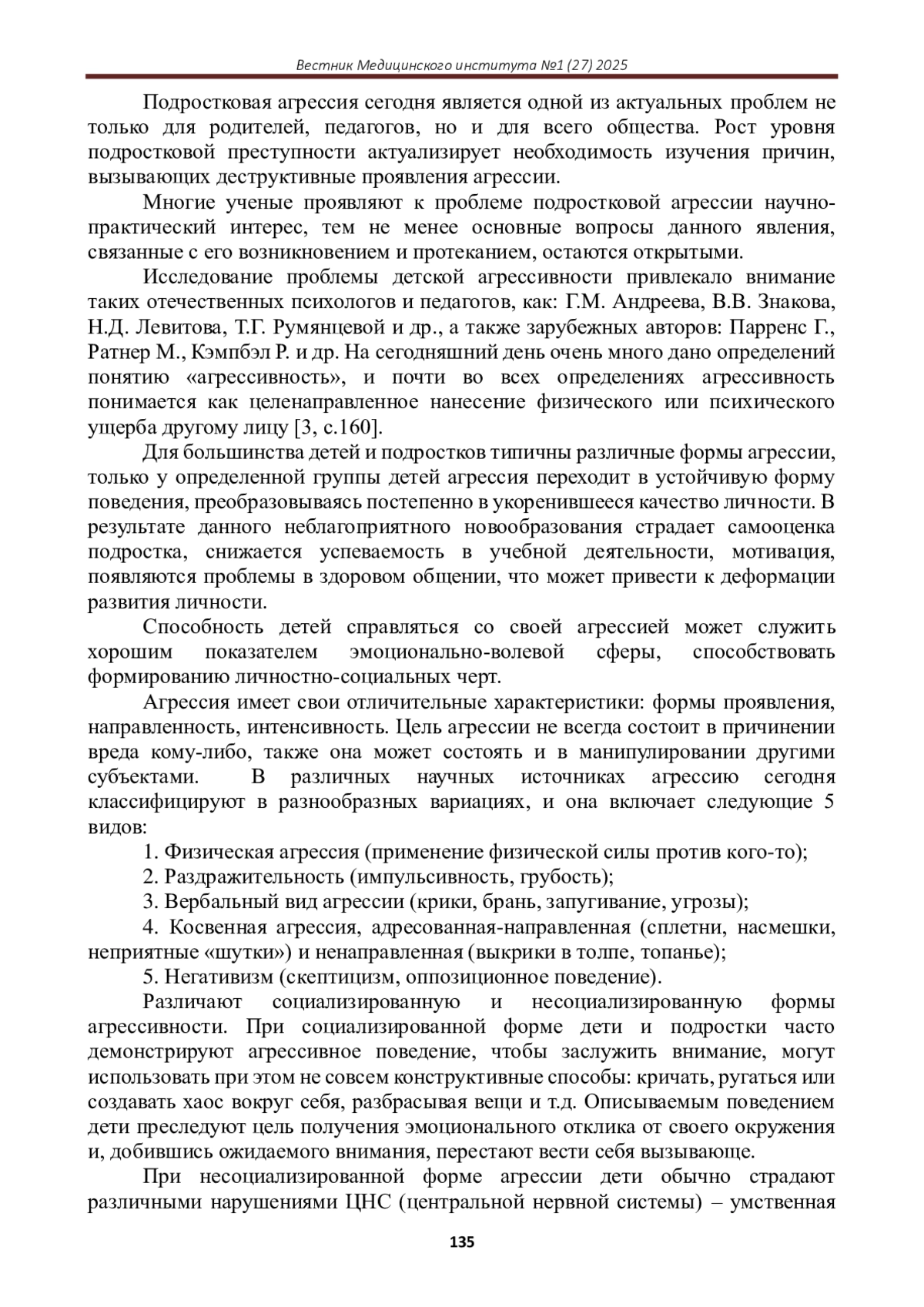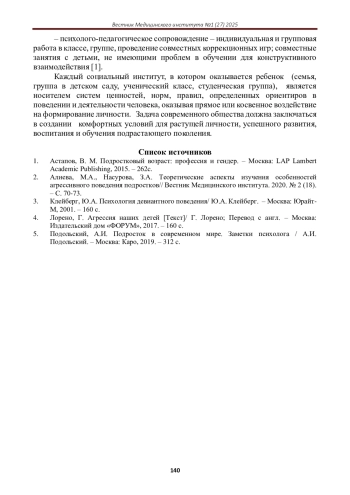 2. Алиева, М.А., Насурова, З.А. Теоретические аспекты изучения особенностей агрессивного поведения подростков// Вестник Медицинского института. 2020. № 2 (18). - С. 70-73. EDN: KFGYFT