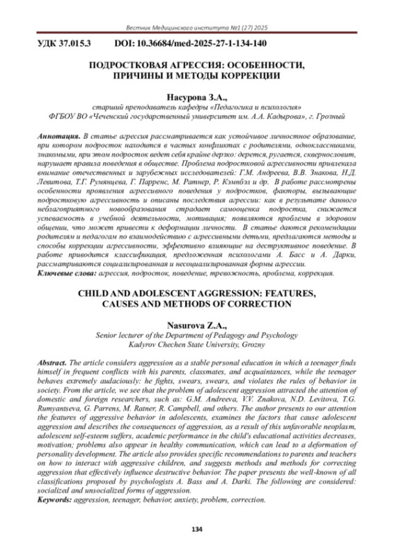 В статье агрессия рассматривается как устойчивое личностное образование, при котором подросток находится в частых конфликтах с родителями, одноклассниками, знакомыми, при этом подросток ведет себя крайне дерзко: дерется, ругается, сквернословит, нарушает правила поведения в обществе. Проблема подростковой агрессивности привлекала внимание отечественных и зарубежных исследователей: Г. М. Андреева, В. В. Знакова, Н. Д. Левитова, Т. Г. Румянцева, Г. Парренс, М. Ратнер, Р. Кэмпбэл и др. В работе рассмотрены особенности проявления агрессивного поведения у подростков, факторы, вызывающие подростковую агрессивность и описаны последствия агрессии: как в результате данного неблагоприятного новообразования страдает самооценка подростка, снижается успеваемость в учебной деятельности, мотивация; появляются проблемы в здоровом общении, что может привести к деформации личности. В статье даются рекомендации родителям и педагогам по взаимодействию с агрессивными детьми, предлагаются методы и способы коррекции агрессивности, эффективно влияющие на деструктивное поведение. В работе приводится классификация, предложенная психологами А. Басс и А. Дарки, рассматриваются социализированная и несоциализированная формы агрессии.