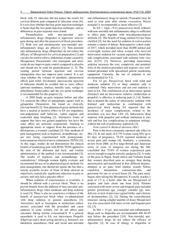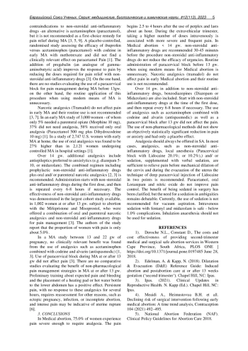 Results: In Medical abortion, 75.0% of women experience pain severe enough to require analgesia. The pain begins 2.5 to 4 hours after the use of perplex and lasts about an hour. During the extravehicular trimester, taking a higher number of doses intravenously is associated with more severe and frequent pain. In medicated abortion < 14 gw. non-steroidal anti-inflammatory drugs are recommended 30-45 minutes before the procedure. Nonsteroidal medicines do not reduce the efficacy of urgencies. Routine administration of paracervical block before 13 gw. when using modern means for medicated abortion is unnecessary. Narcotic analgesics (Tramadol) do not affect pain in early Medical abortion and their routine use is not recommended.